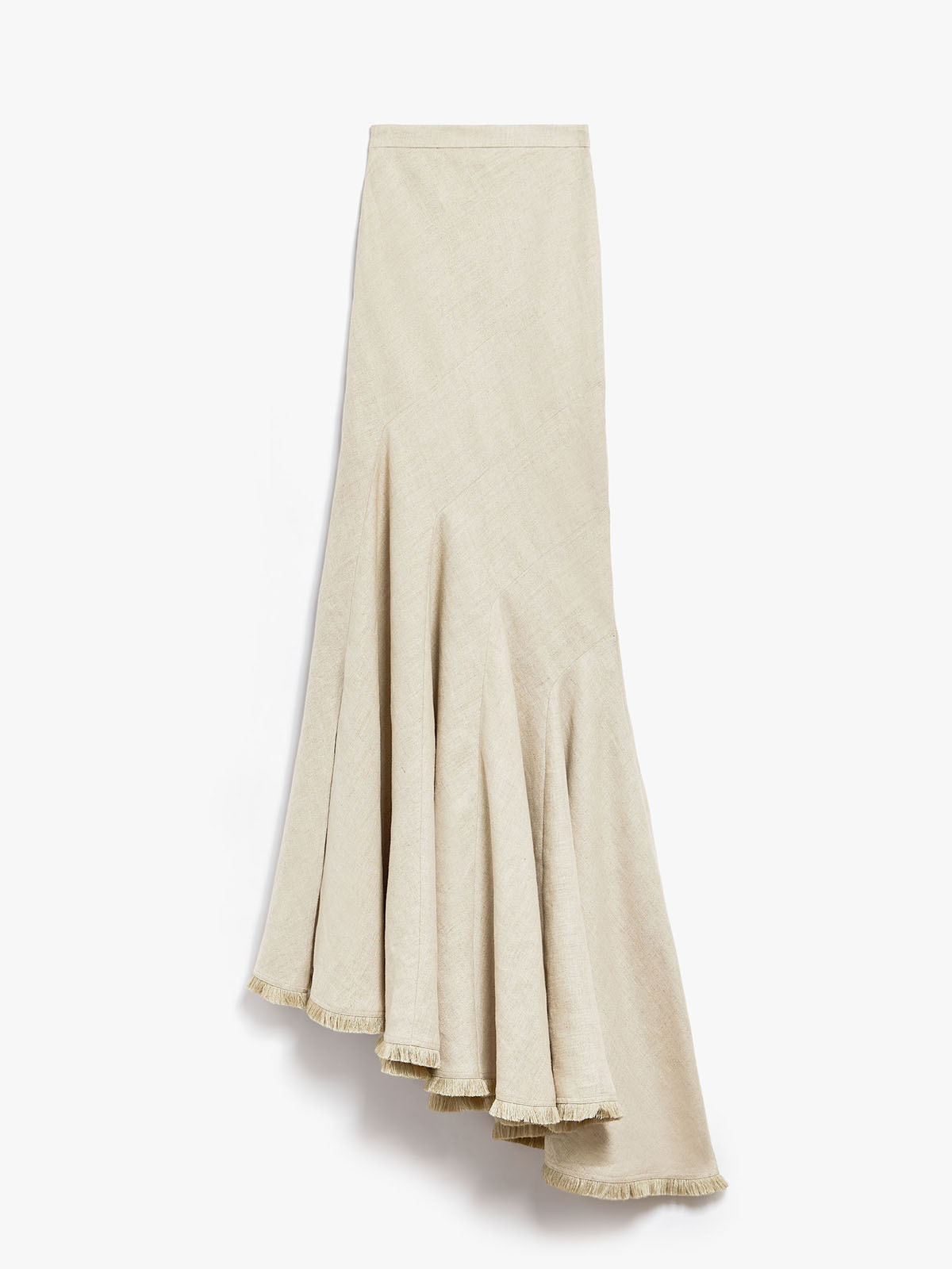 ピュアリネンマーメイドスカート。 リネンらしいナチュラルで素朴な風合いの生地は、適度な厚みがあり透け感が気になりにくい仕上がりです。 バイヤスカットの流れるようなアシンメトリーのフレアラインがとてもフェミニンな印象。裾には小さいフリンジをあしらい、夏らしいエッジを効かせています。 <ポケット>なし <スタイル>サイドファスナー仕様、裏地無し