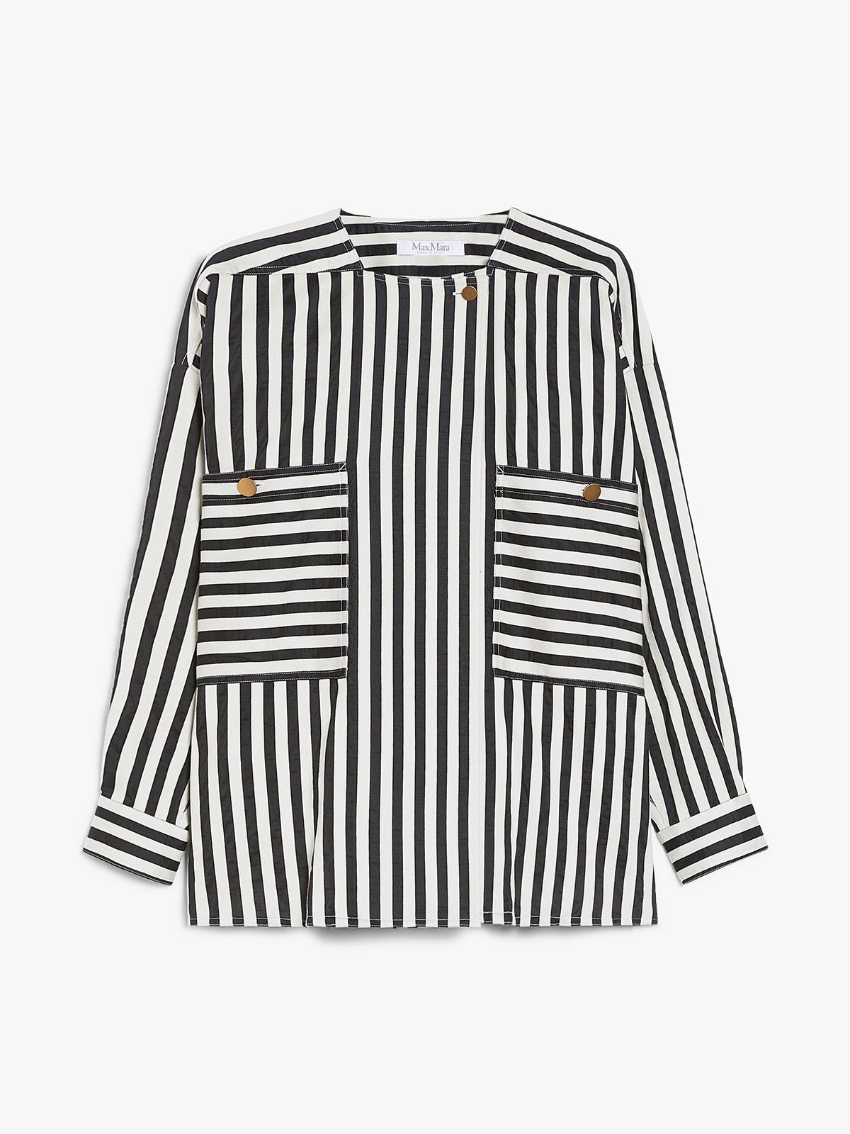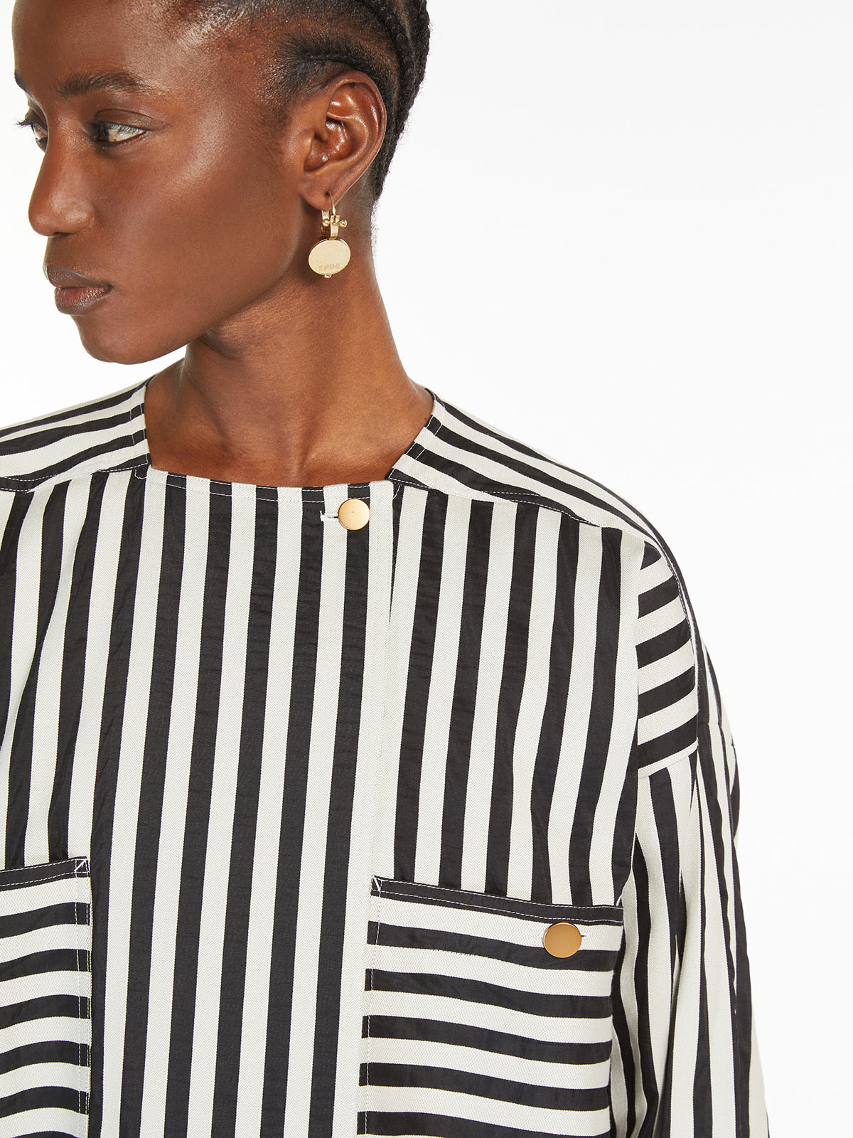 ストライプを縦横に配したグラフィカルなブラウス。コットンとシルクのサテンの生地は、控えめな光沢感と滑らかな肌触りが上品な印象です。シルエットはクルーネックのボクシーなストレートライン。ゴールドのメタルボタン付きのパッチポケットがアクセントに。白のボトムスと合わせて春らしい爽やかなコーディネートをお楽しみください。<ポケット>パッチポケット<スタイル>長袖