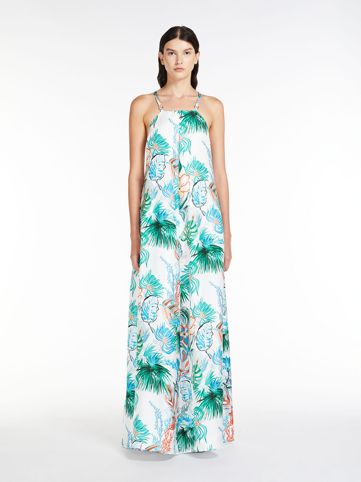 シルエットは、クロスオーバーのショルダーストラップが特徴的なリラックスしたマキシ丈。