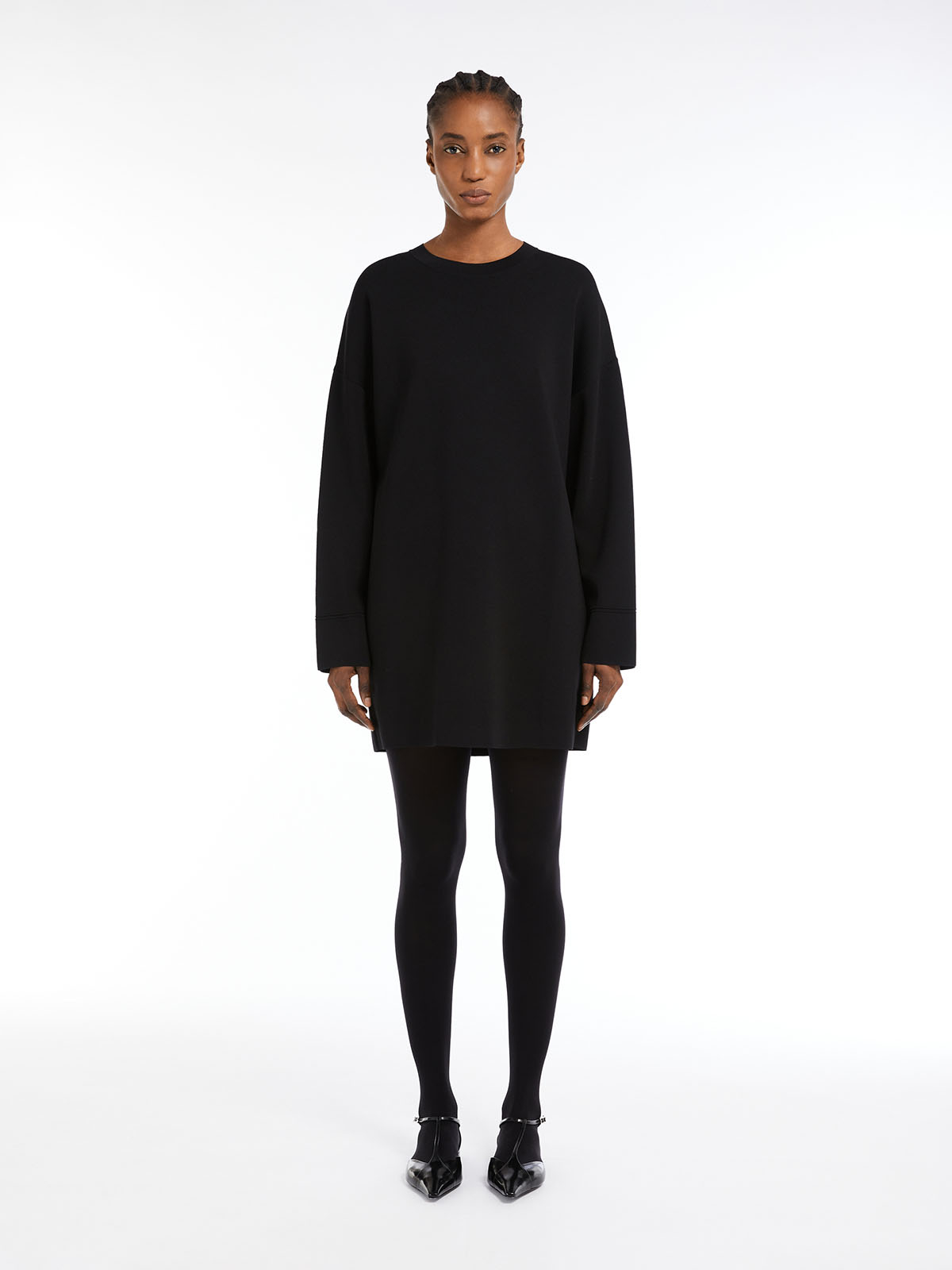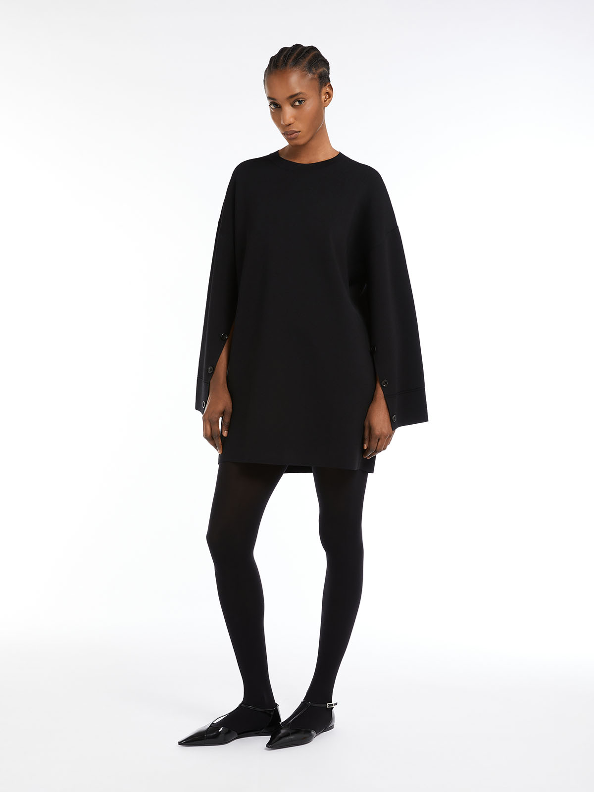ビスコースクレープのニットミニドレス。18ゲージで編まれたビスコースニットは、ストレッチを効かせ薄手でソフトな肌触りに仕上がっています。シルエットはクルーネックのゆったりとしたフィット感が特徴的。袖の内側にボタンで開閉可能なスリットが入り、ボタンを外して着用するとケープの様に着ていただけます。<ポケット>なし<スタイル>クルーネック