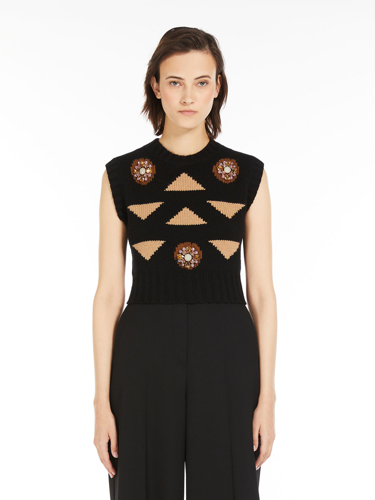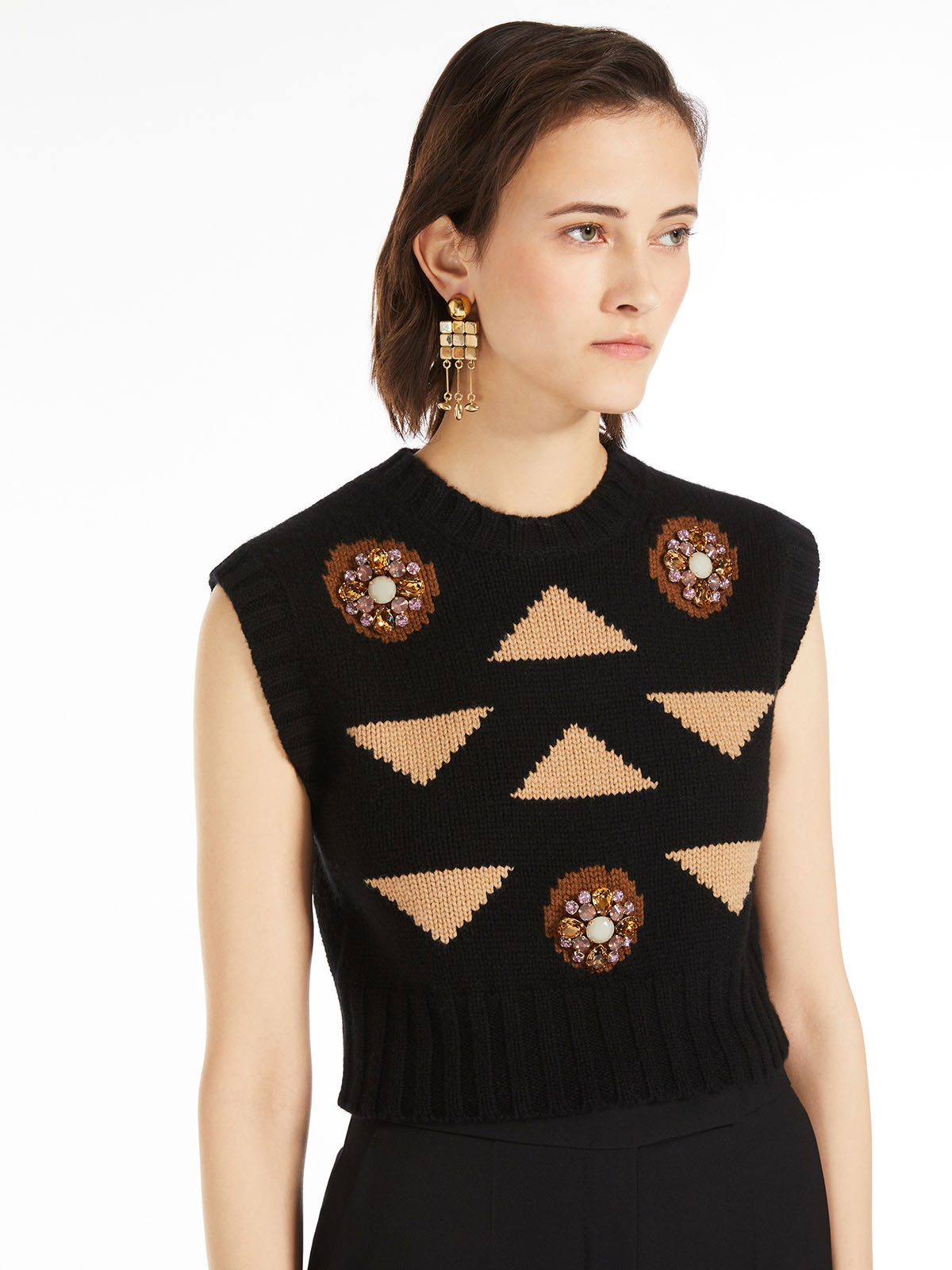 インターシャとビジューのディテールが特徴的なニットベスト。