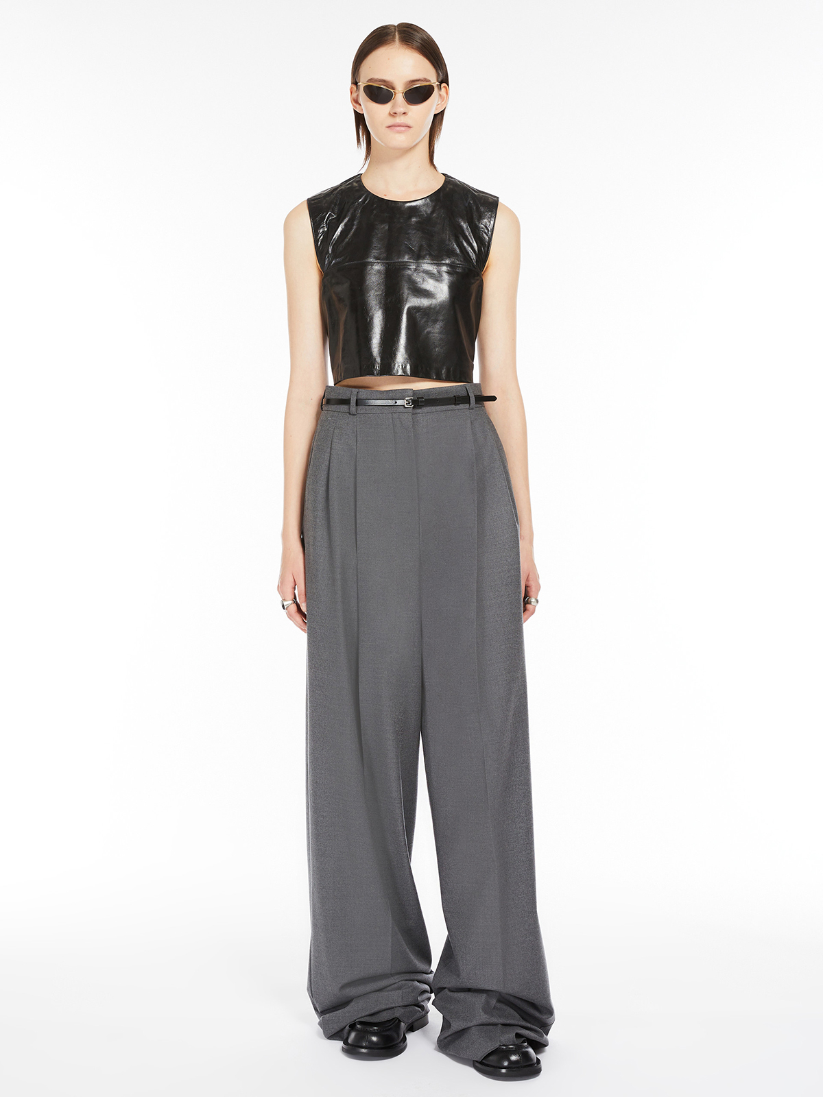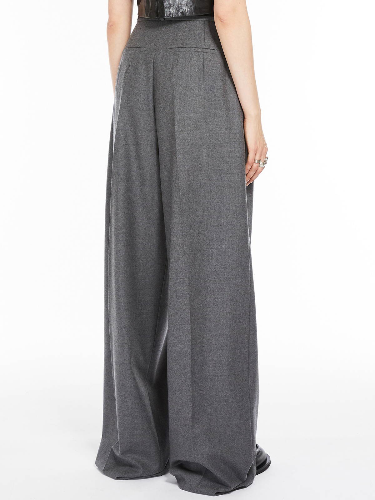 シルエットはオーバーサイズ。脚のボリュームを強調するダブルダーツのディテールが特徴的。