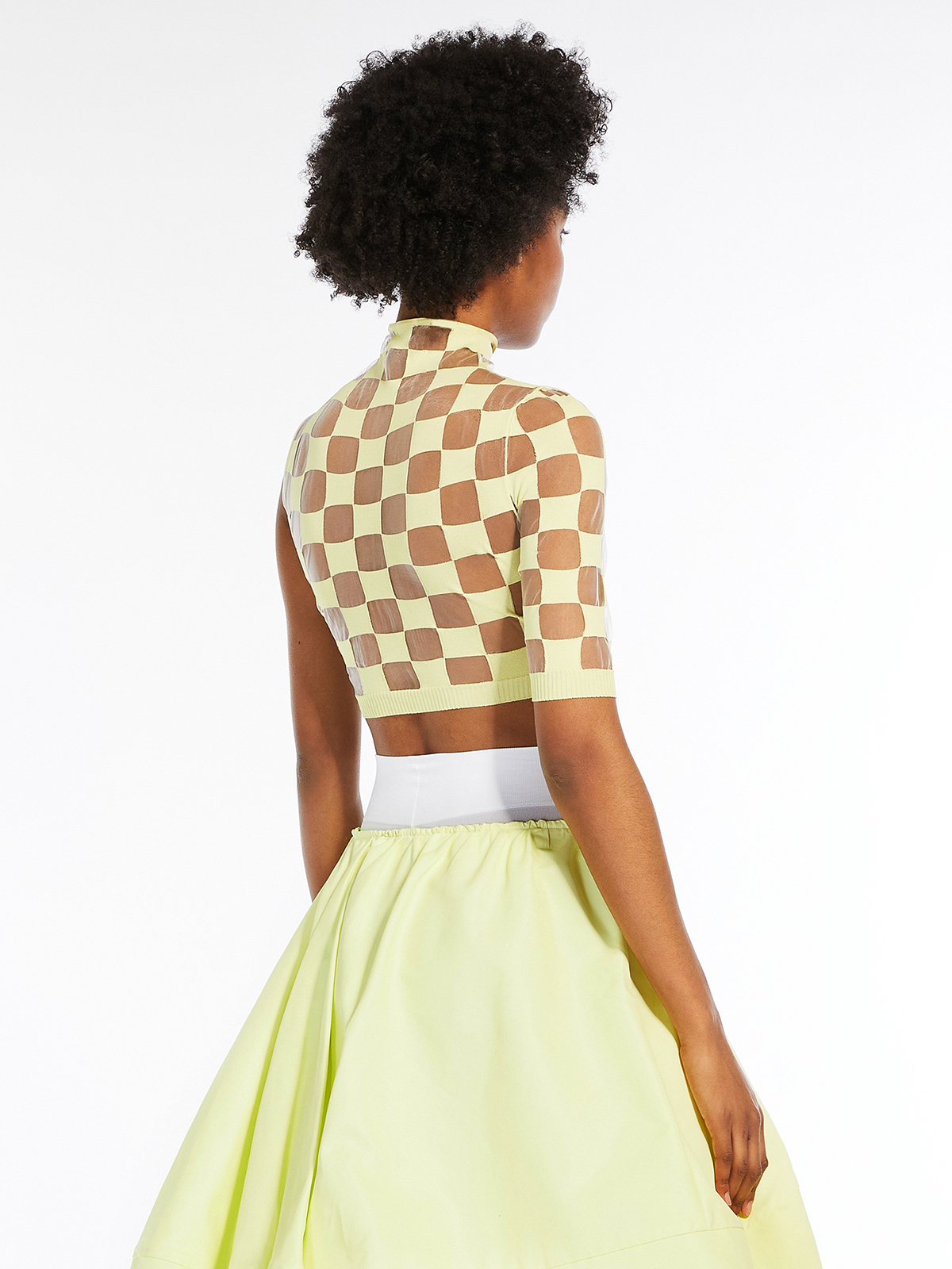 チェッカーボード効果を生み出す、透明な糸のインターシャをあしらい、エアリーでコンフォートな着心地に仕上げました。