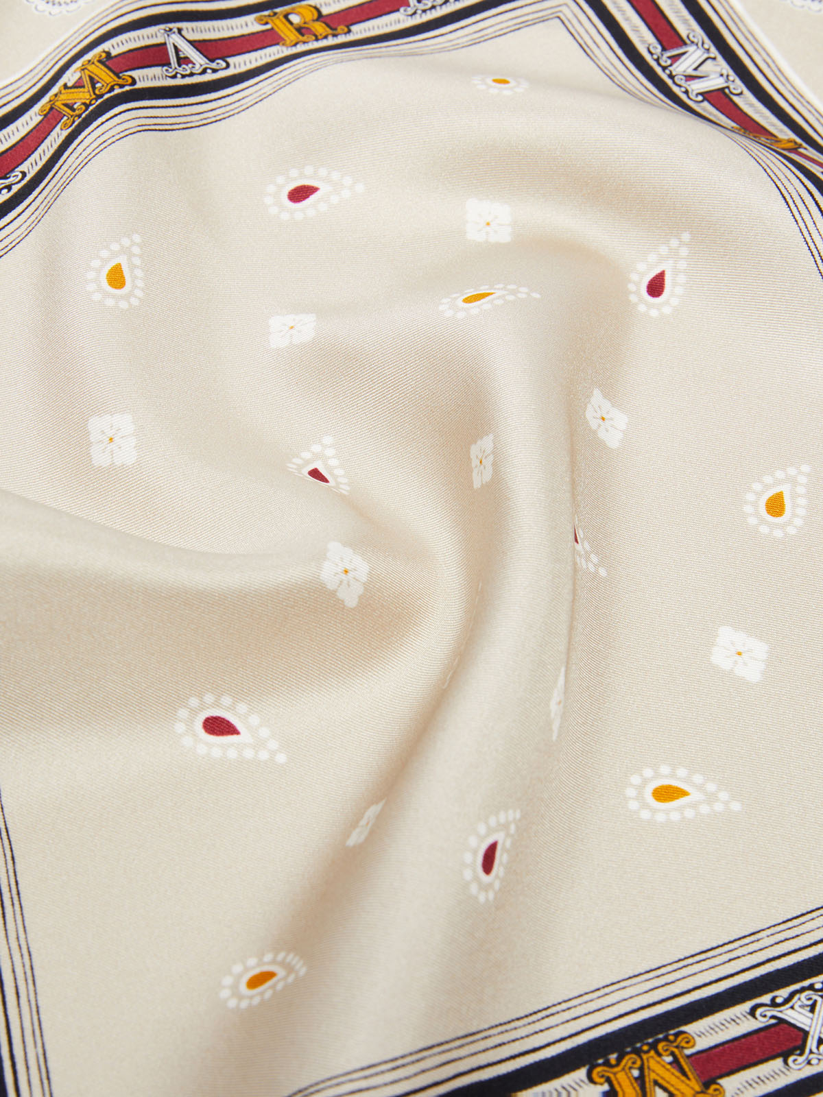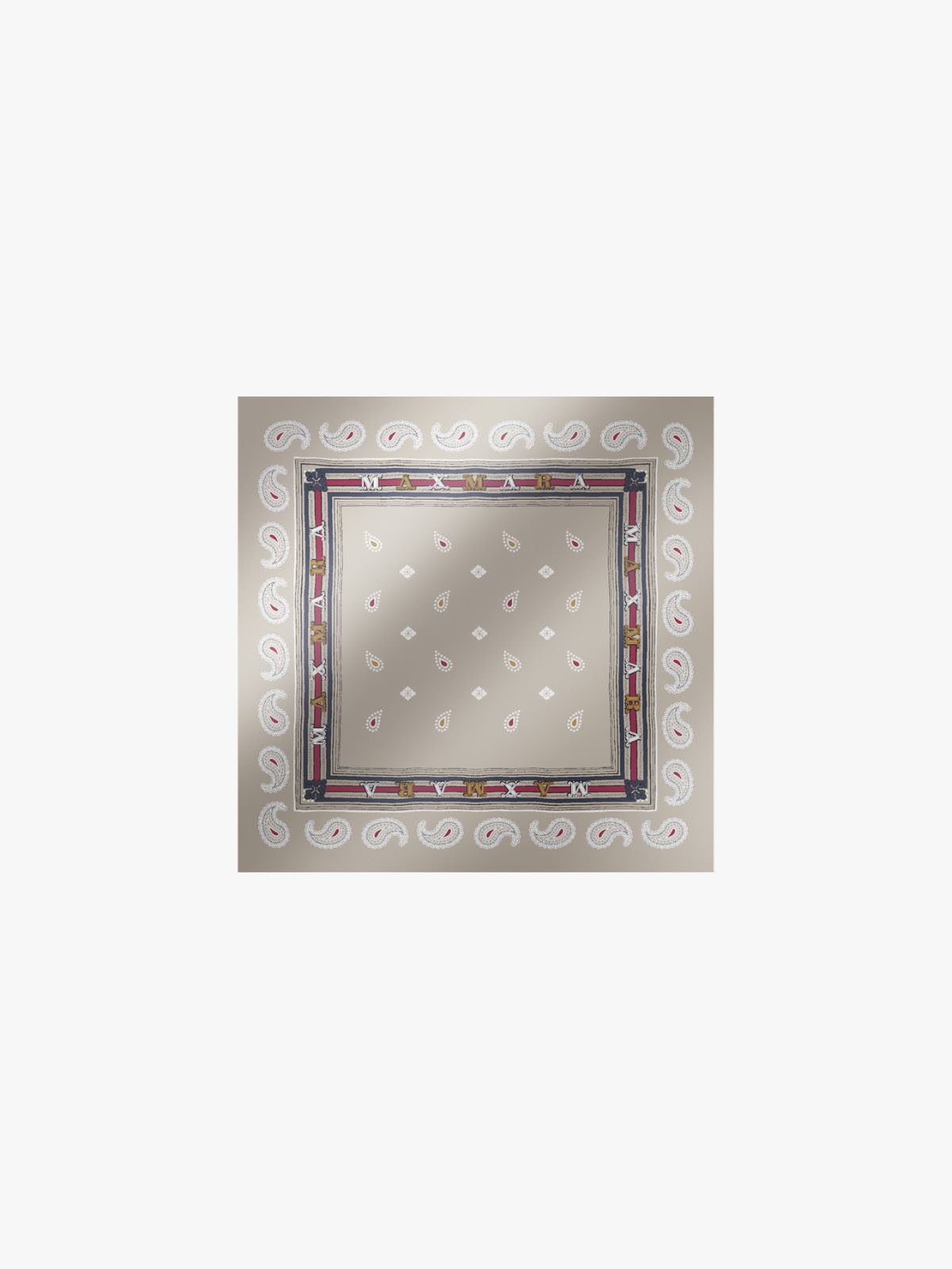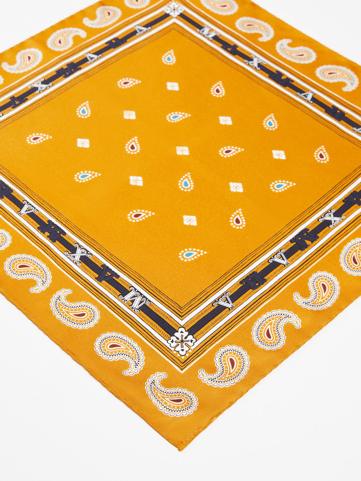 クラシカルなレタリングロゴがアクセントのペイズリー柄スカーフ。光沢と滑らかなドレープ性をもつピュアシルクならではのハイエンドな仕立てが魅力的な一枚です。ややコンパクトなサイズでポケットチーフやバッグのワンポイントとして活躍。カジュアルなスタイルからエレガントな装いまで幅広く活躍してくれるアイテムです。