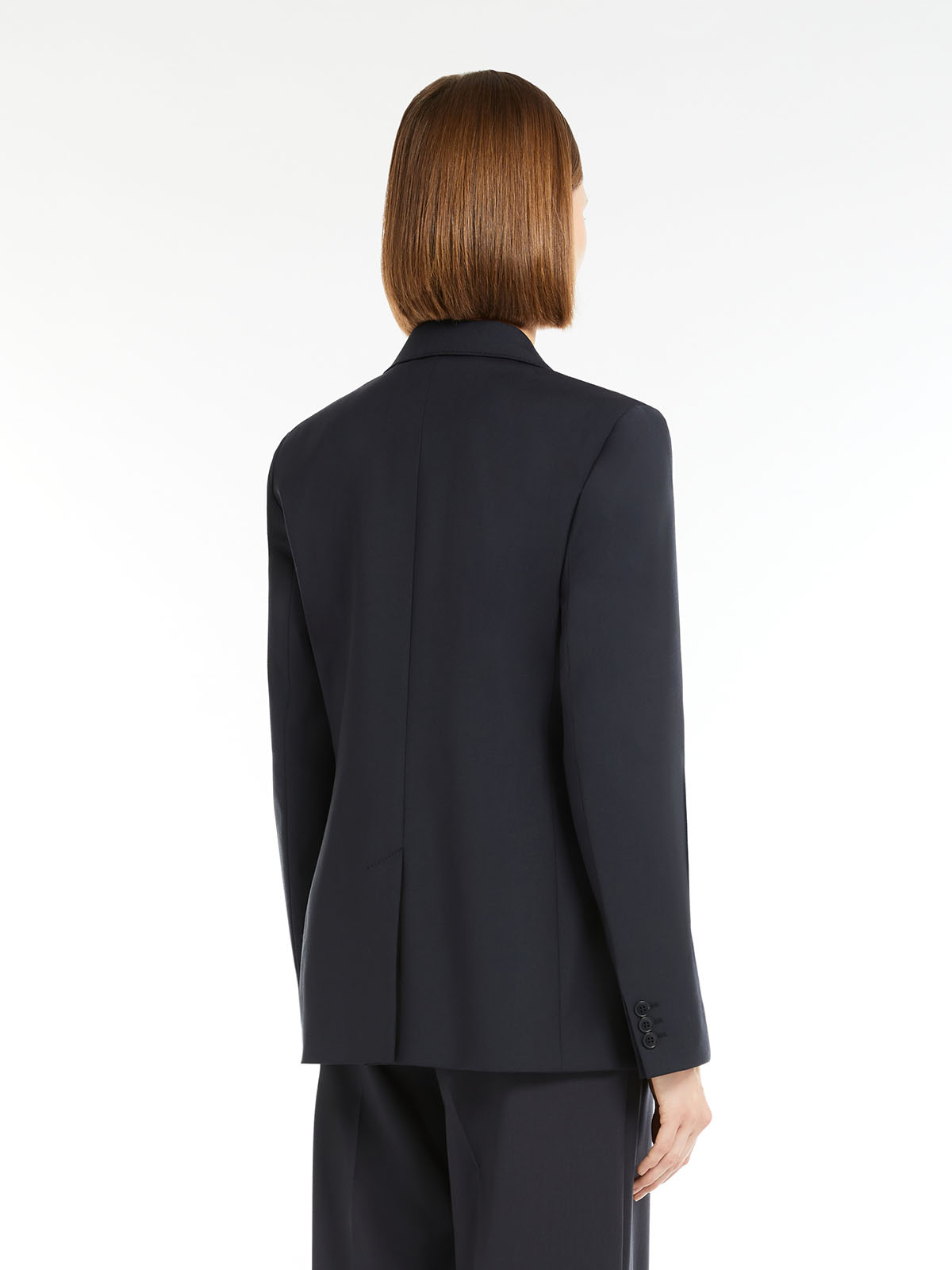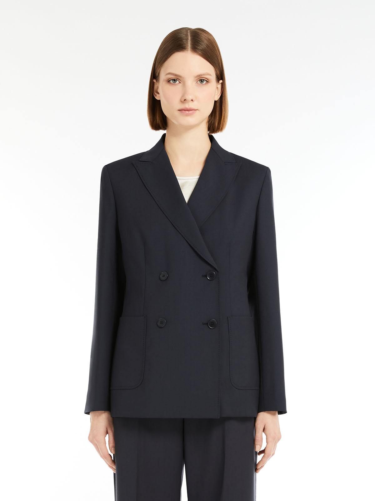 シャープなシルエットに仕上げたダブルブレストブレザー。