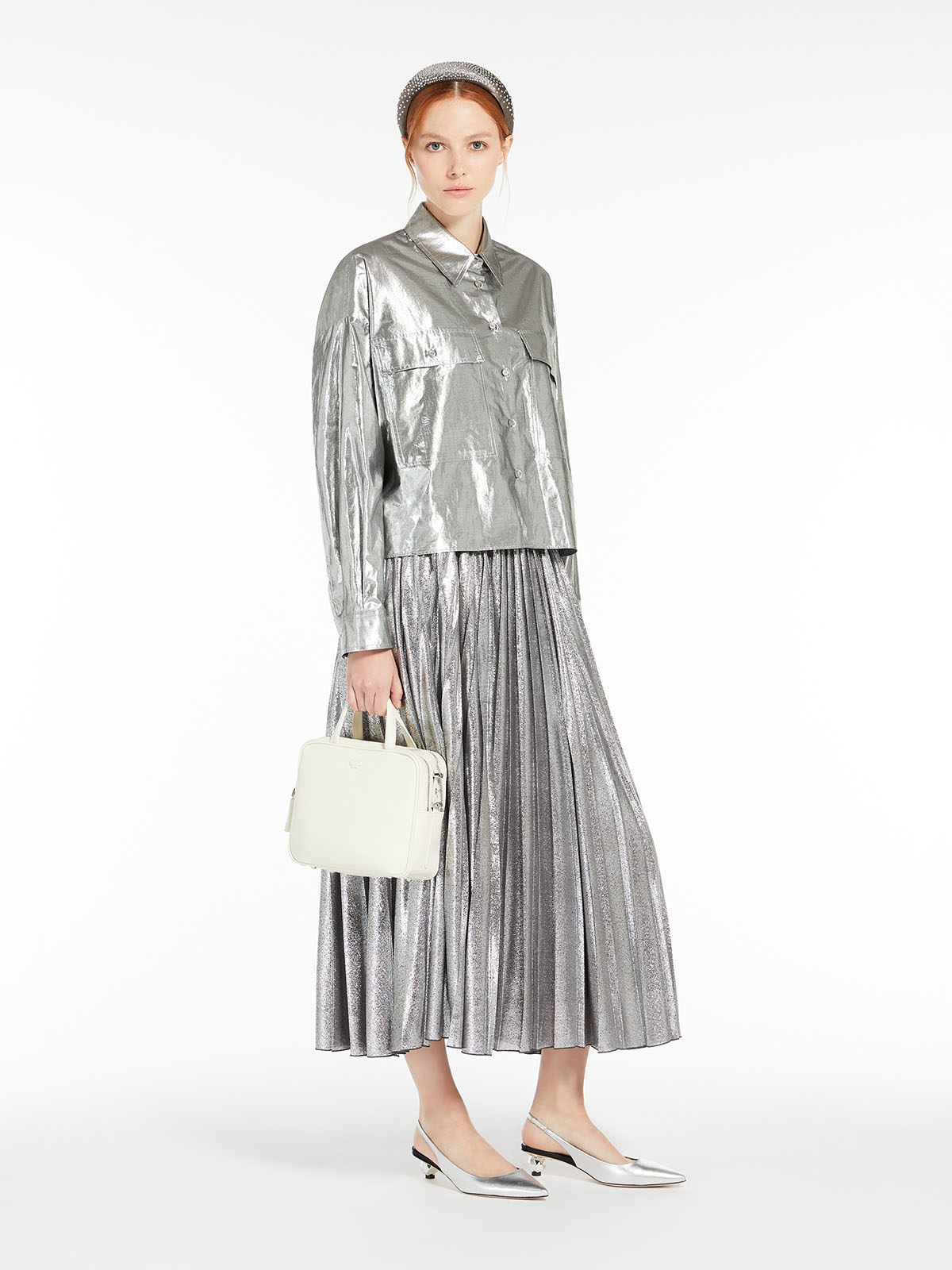 メタリックシルバーのラミネート加工を施したジョーゼット生地を使用し、軽やかな着用感とシアー感が楽しめます。
