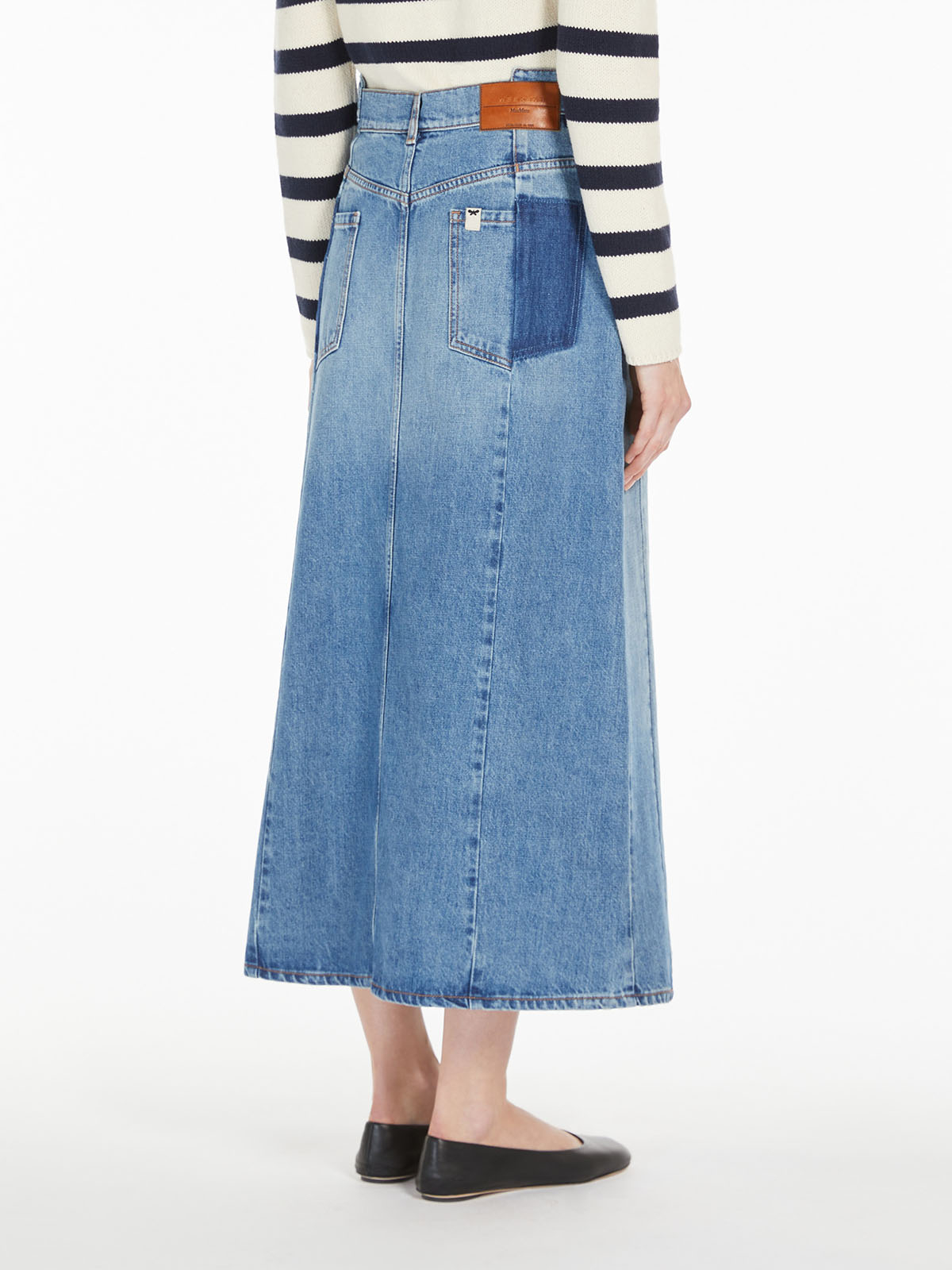 ベーシックなシルエットに仕上げたロングデニムスカート。ピュアコットンのインディゴデニムはビンテージ風の色落ちと風合いが特徴です。シルエットは、ストレートラインにフロントにスリットを入れたロングレングス。バックにバタフライのロゴプリントがさりげないアクセントに。ニットからブラウスまで幅広いトップスを合わせていただけます。<ポケット>5ポケット<スタイル>ファスナー仕様