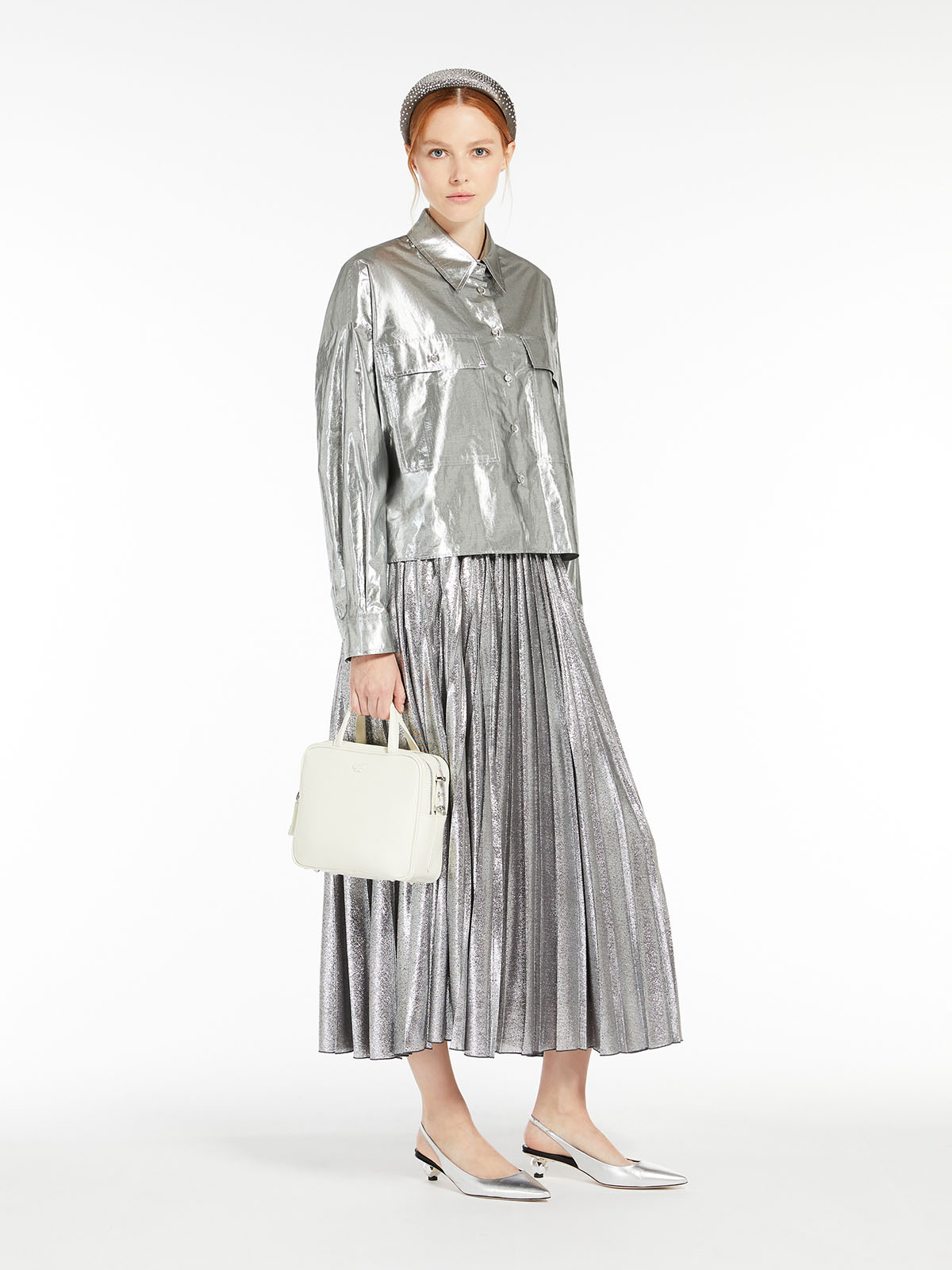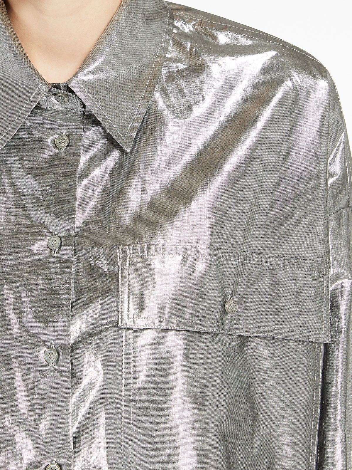 シルバーカラーが目を引くメタリックコットンシャツ。