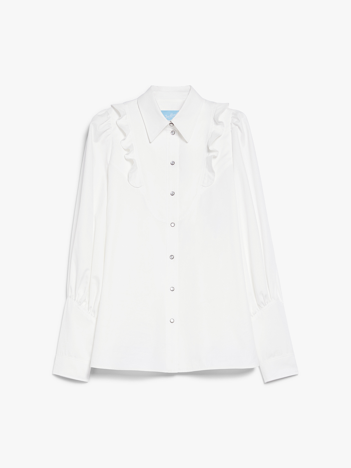 シルエットはシャツカラー。前後にあしらわれたフリルと、肩のシャーリングとギャザーのディテールが特徴的です。