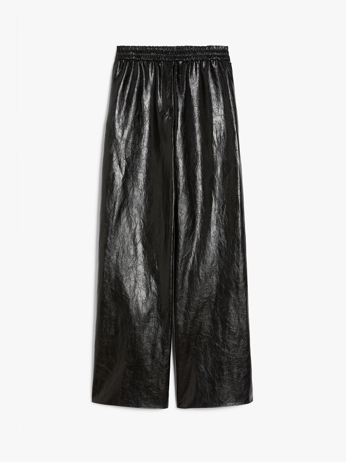 ビンテージ風のコーティング生地を使用したパラッツォパンツ。レザー調に仕上げ、しなやかで柔らかな着用感が特徴的です。シルエットは、調整可能なドローストリングを付きのウエストバンドに、ゆったりとしたワイドレッグのストレートライン。いつものニットやブラウスとのスタイリングにアクセントをプラスしてくれるアイテムです。<ポケット>バックに玉縁ポケット<スタイル>ゴムバンド仕様