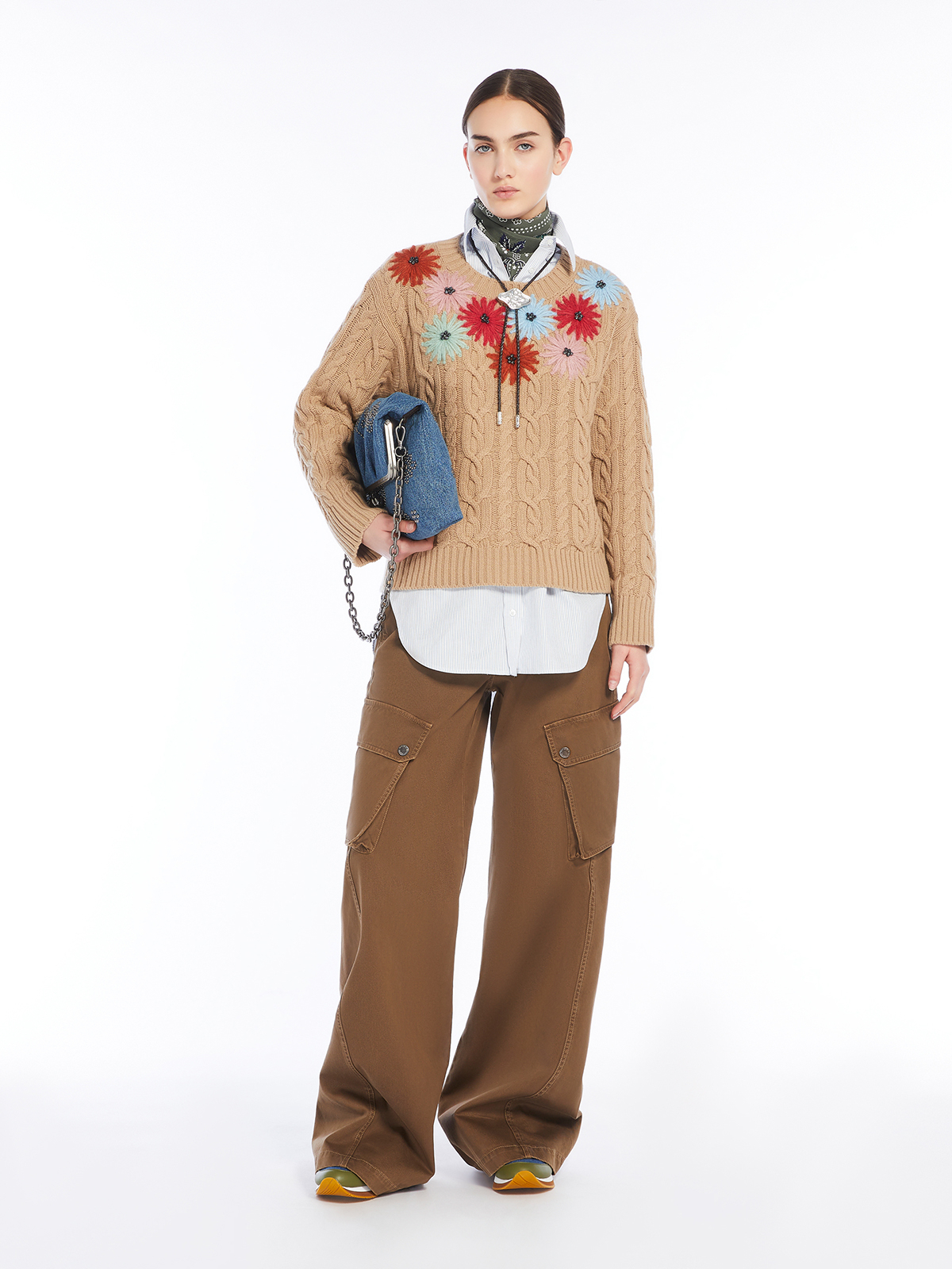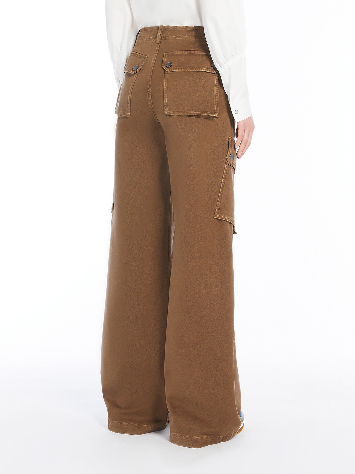 シルエットはレギュラーライズのワイドレッグ。膝上とバックにあしらった立体的なフラップポケットがアクセントに。