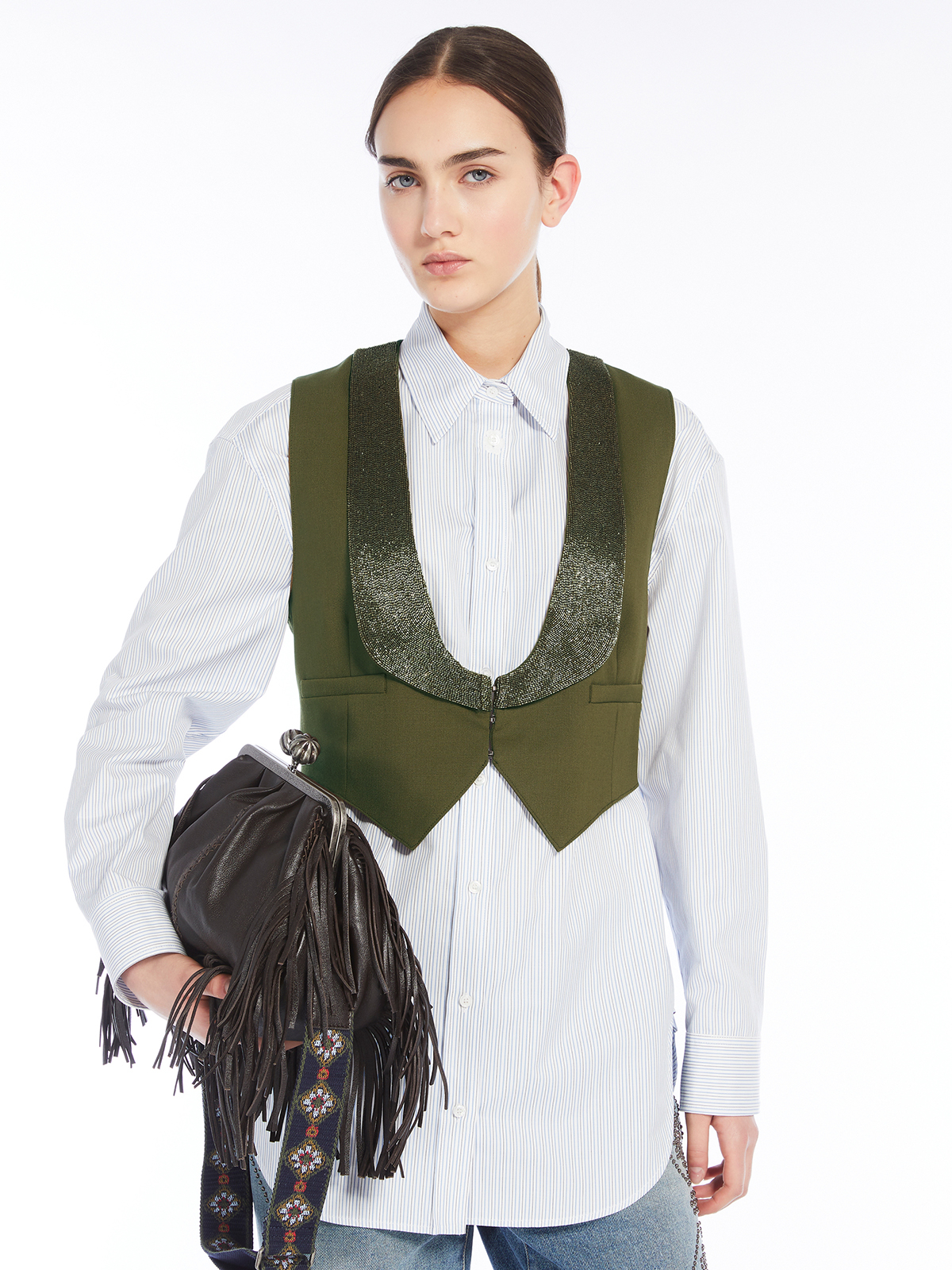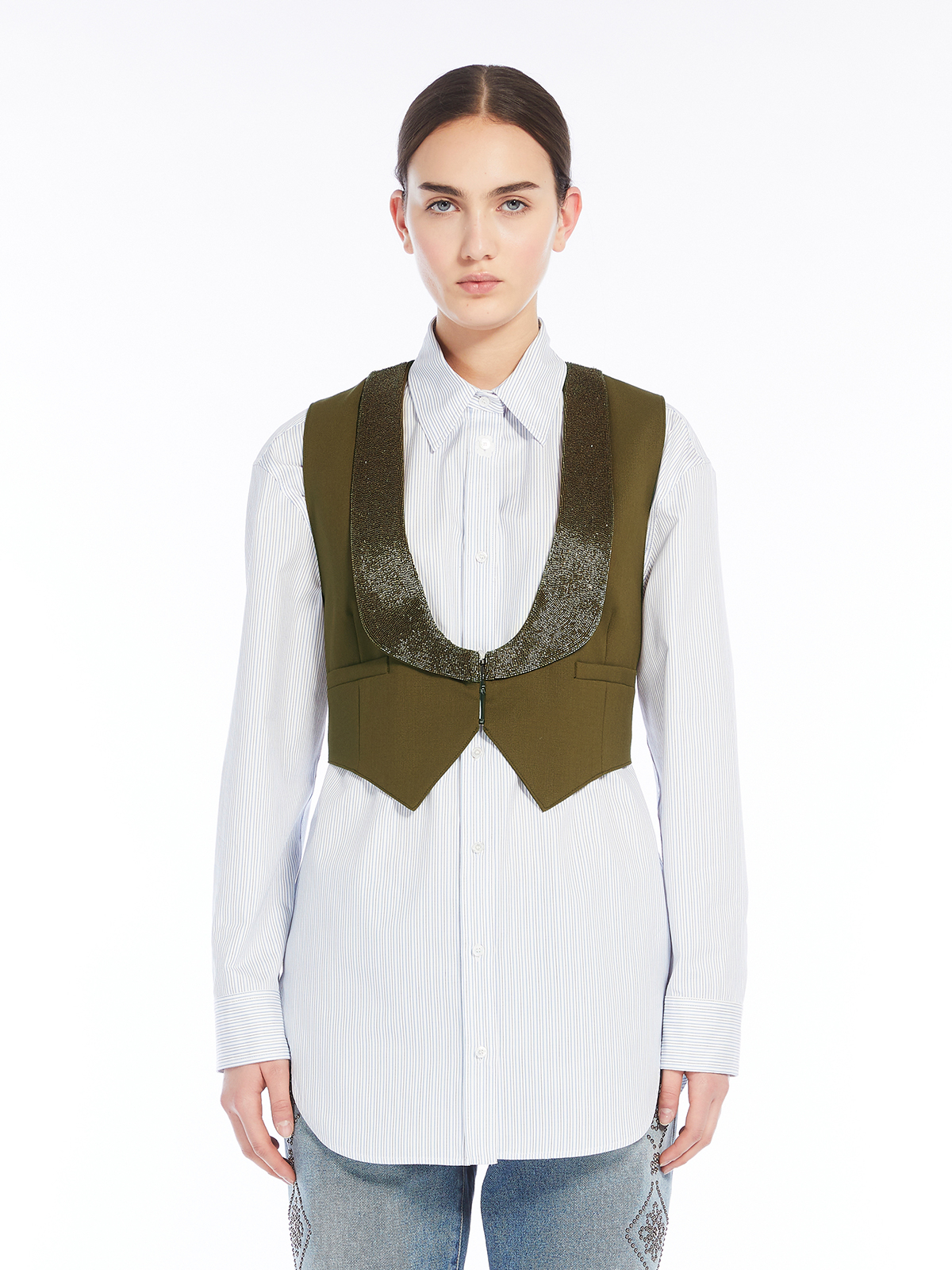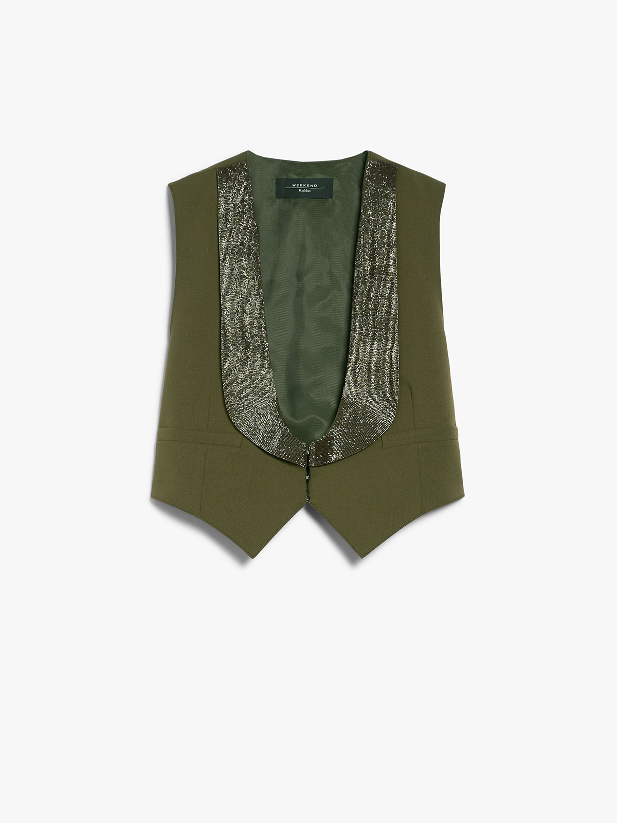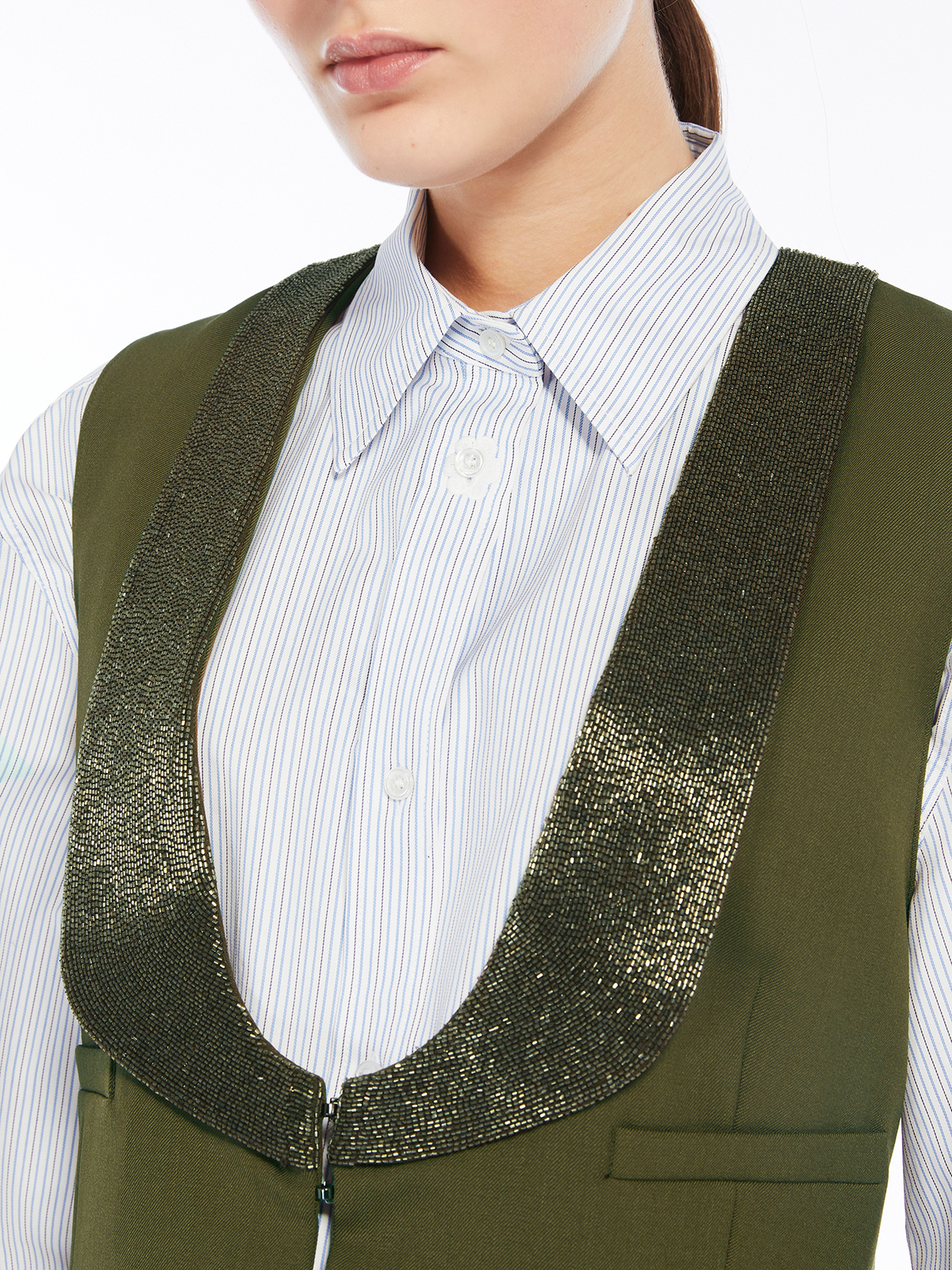 ラペルのディテールにはガラスビーズ刺繍が施されています。すっきりとしてコンパクトなシルエットが特徴的。