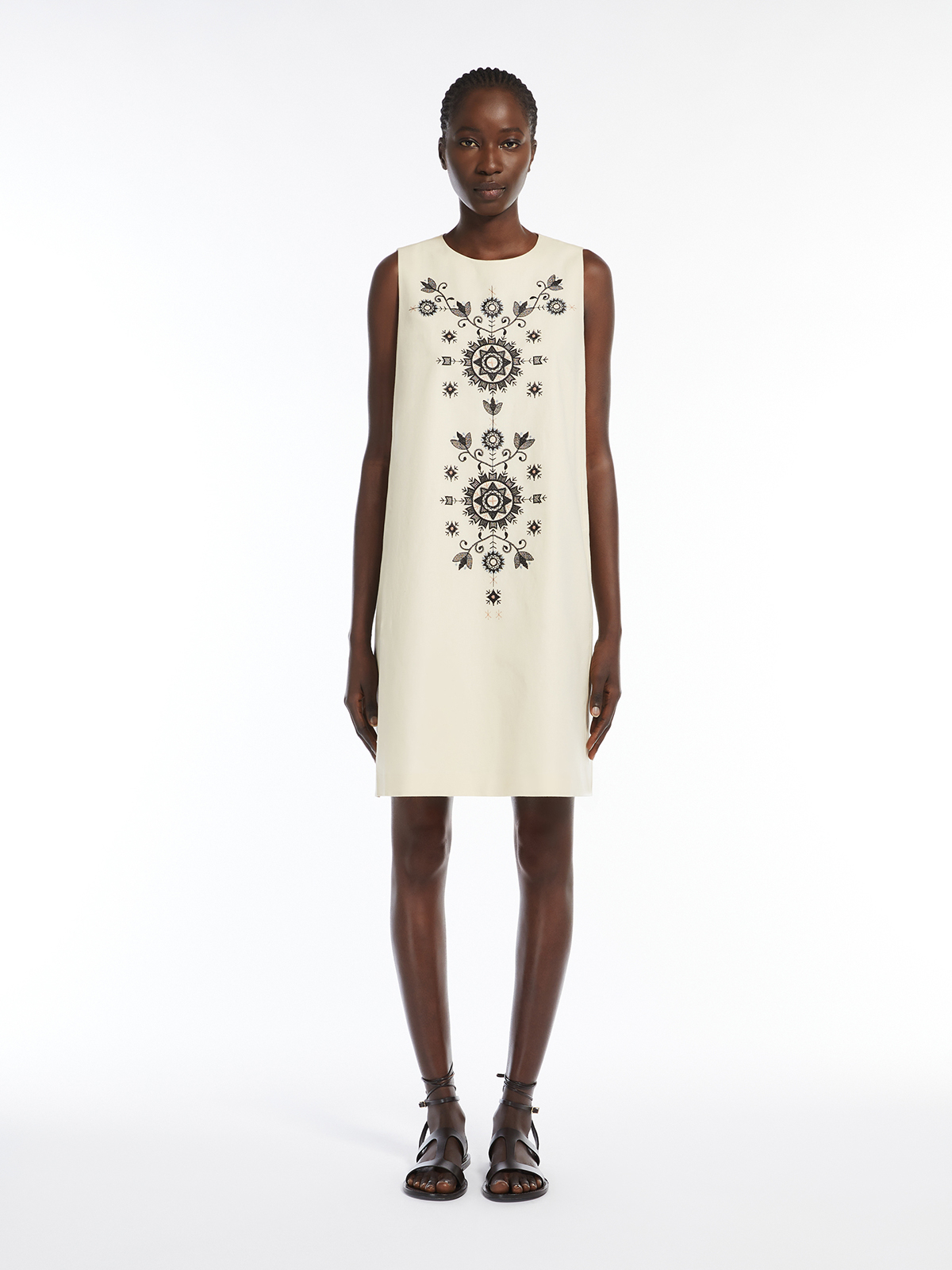 フロントのコントラストの効いた装飾的な刺繍が目を引くスリーブレスドレス。
