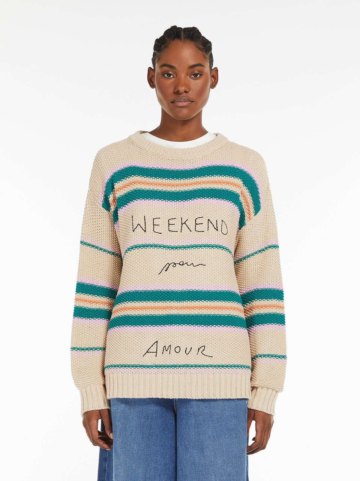ストライプモチーフとフロントのロゴ刺繍が目を惹くコットンヤーンニット。