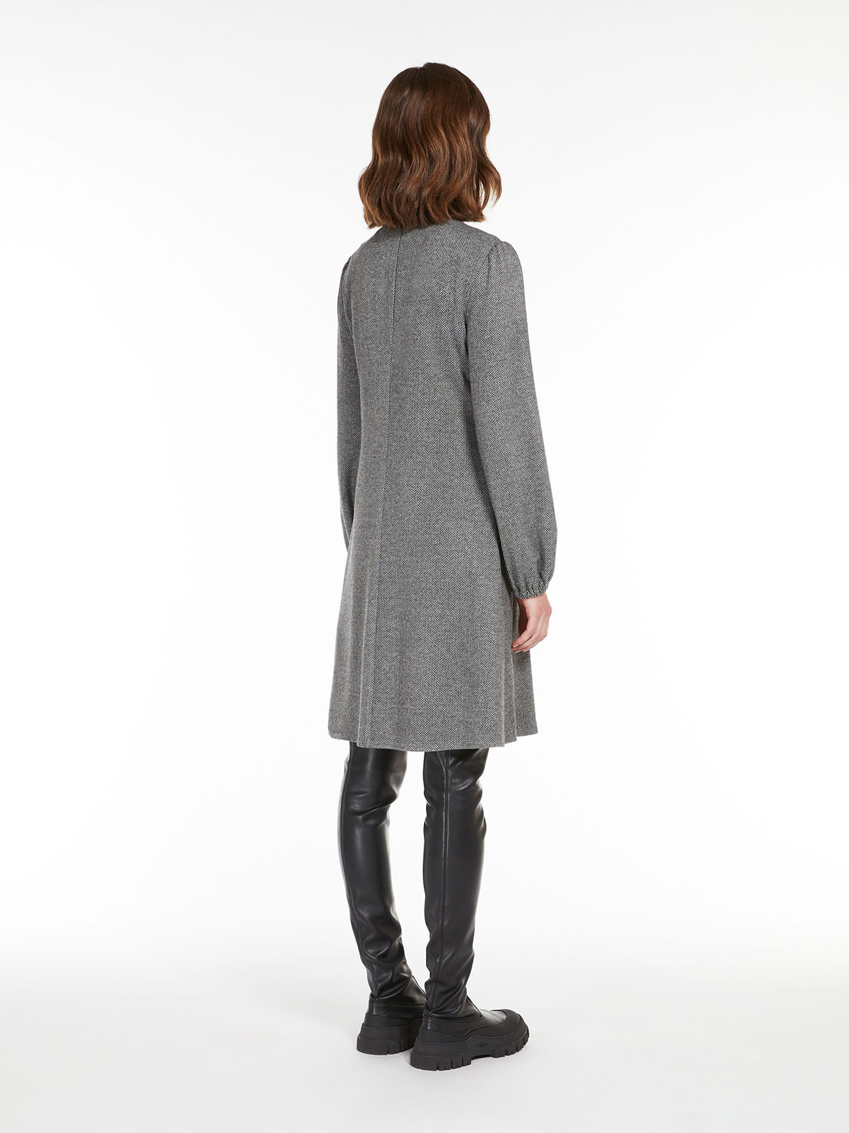 ウエストからほのかにAラインに広がるフェミニンなシルエットに、クラシカルな印象のクルーネック。