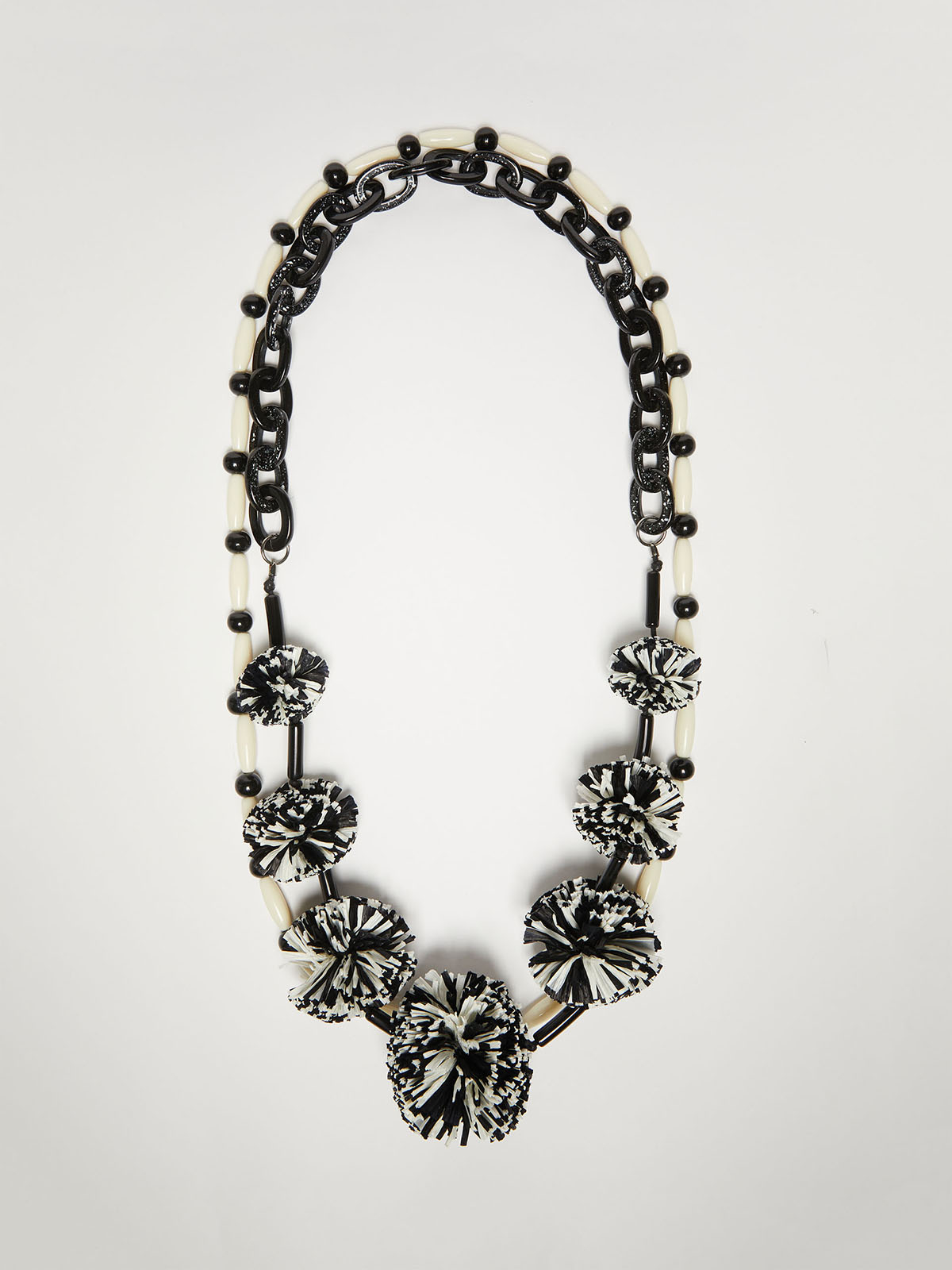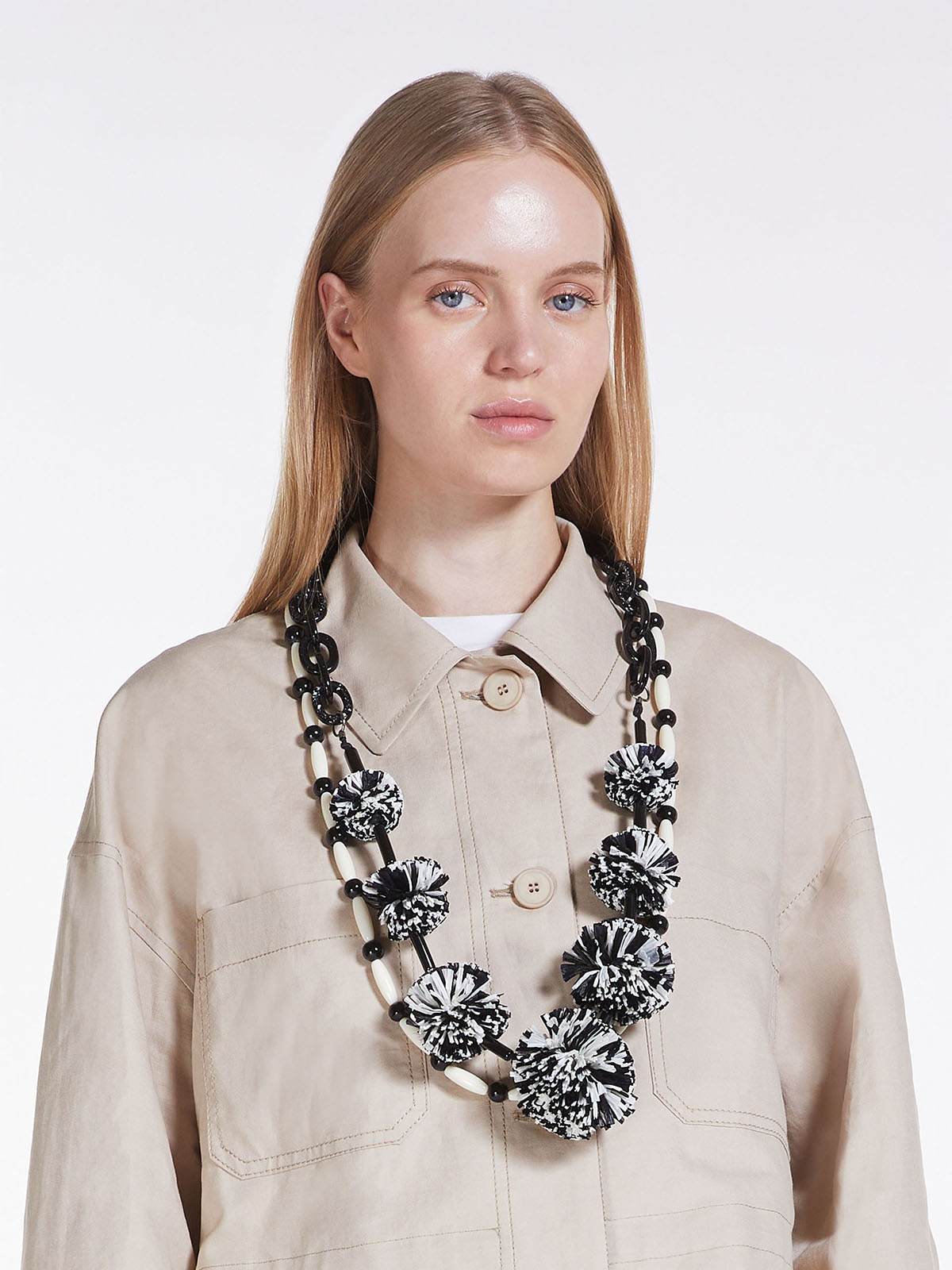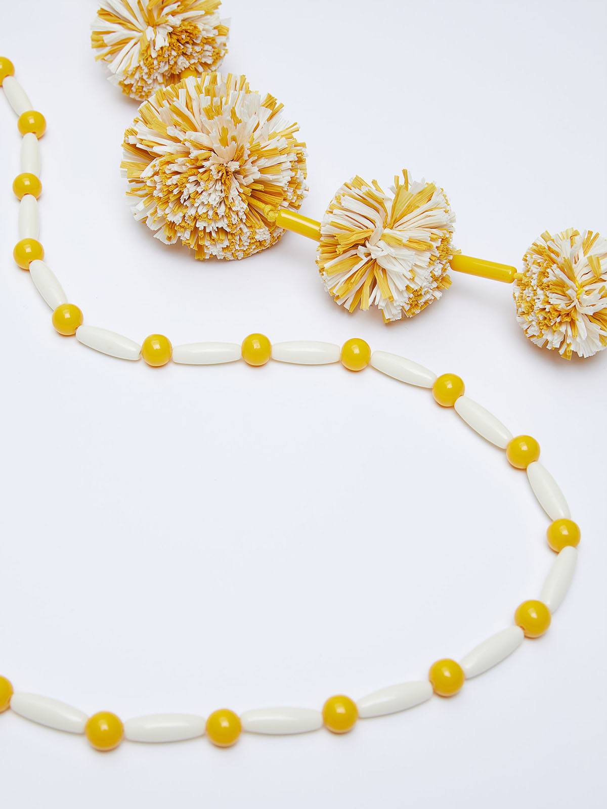 ペーパーヤーンの夏らしい雰囲気のポンポンモチーフネックレス。 ビスコース繊維を使用し、立体的なポンポンをアクセントにしたアイキャッチーなネックレス。ボリュームを抑えたホワイトのレジンパーツのネックレスと二連のセットになっているので、華やかな二連使いはもちろん、単体でもご使用いただけます。 インパクトのあるモチーフはTシャツやシンプルなドレスのアクセントとして最適です。