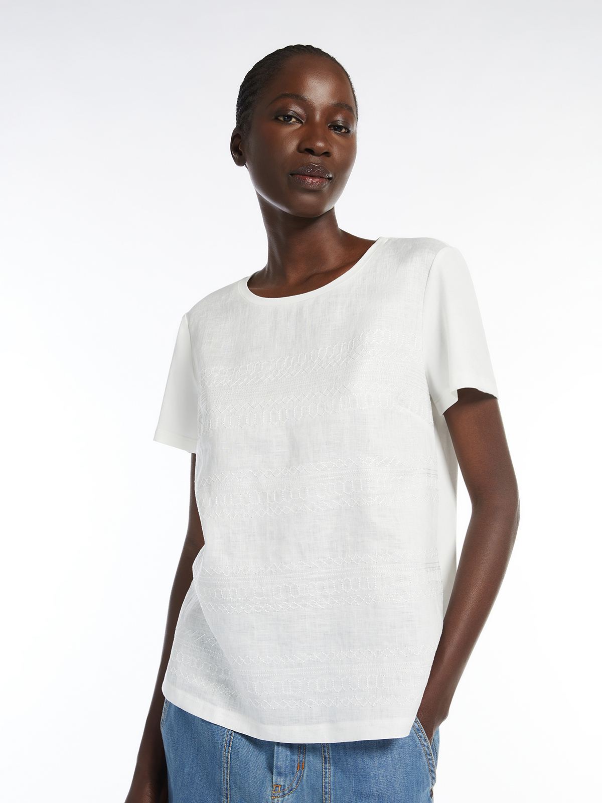 フロントに同系色の刺繍をあしらったコットンリネンTシャツ。