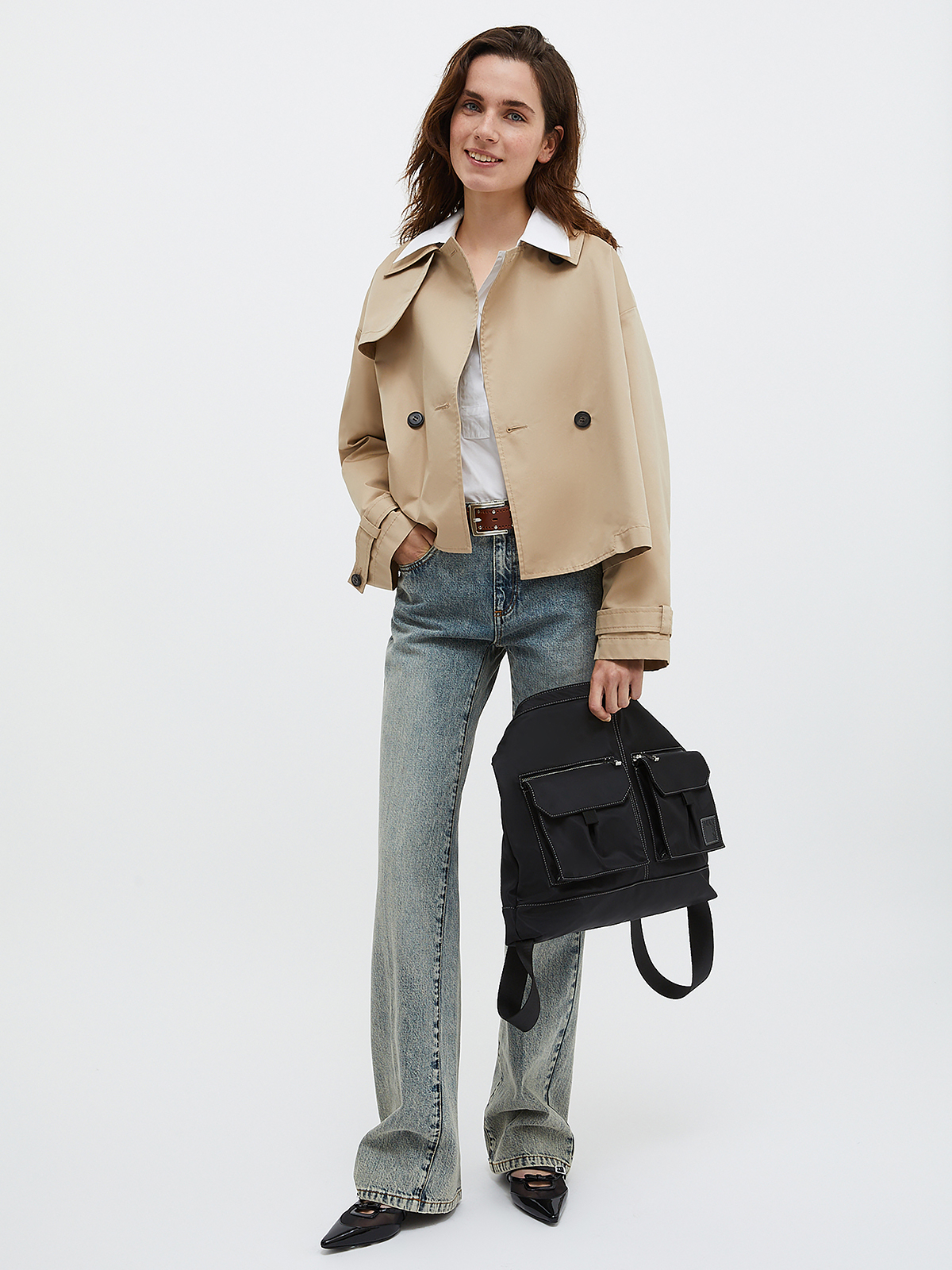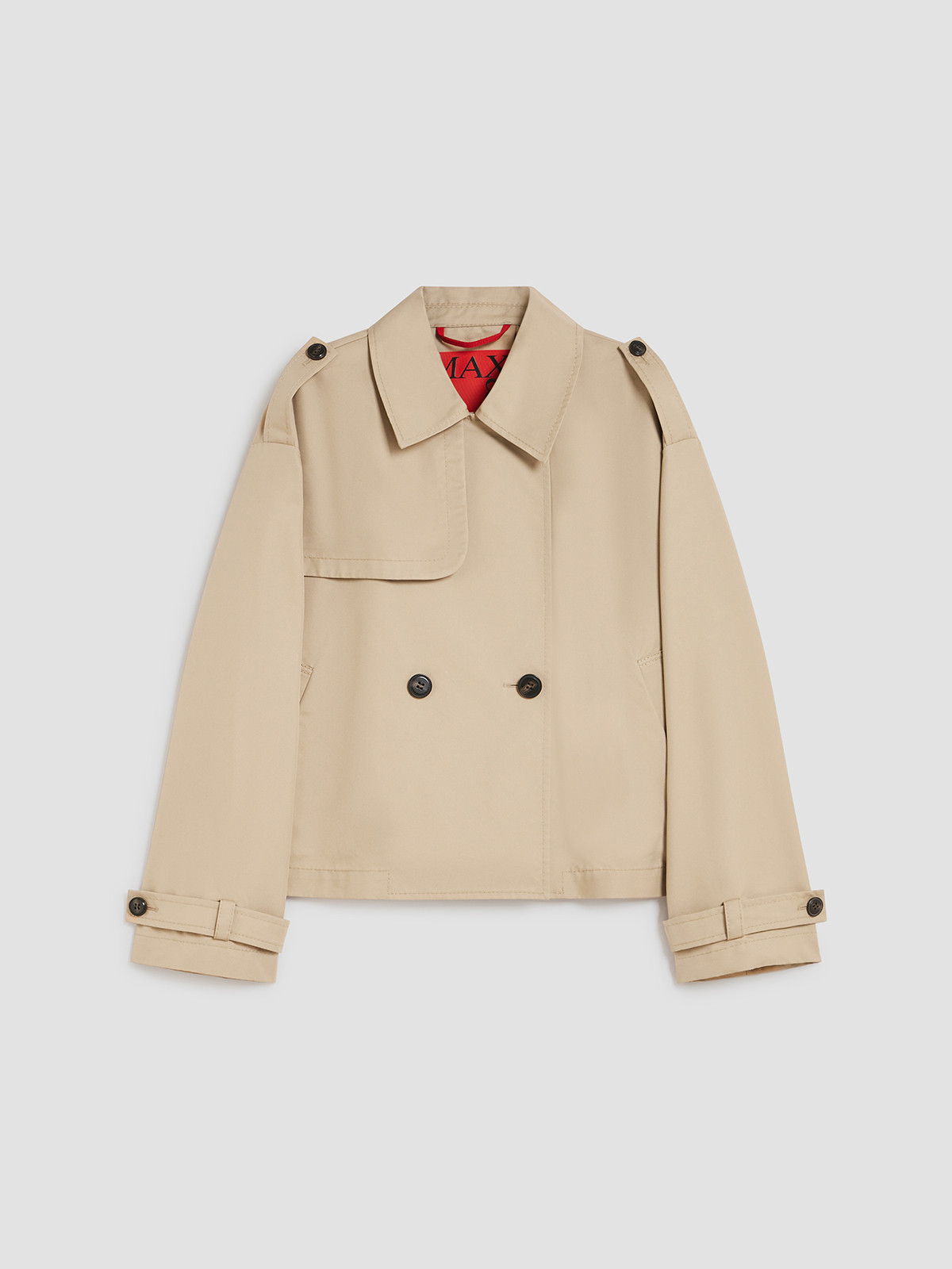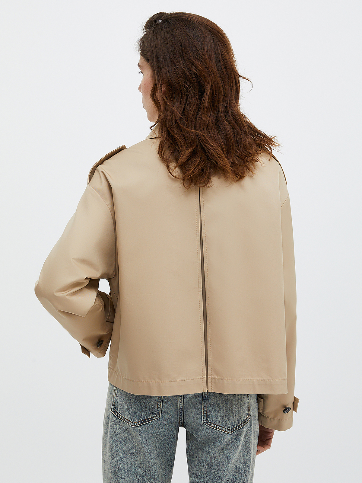すっきりとしたクロップドバージョンに仕上げられたトレンチコート。