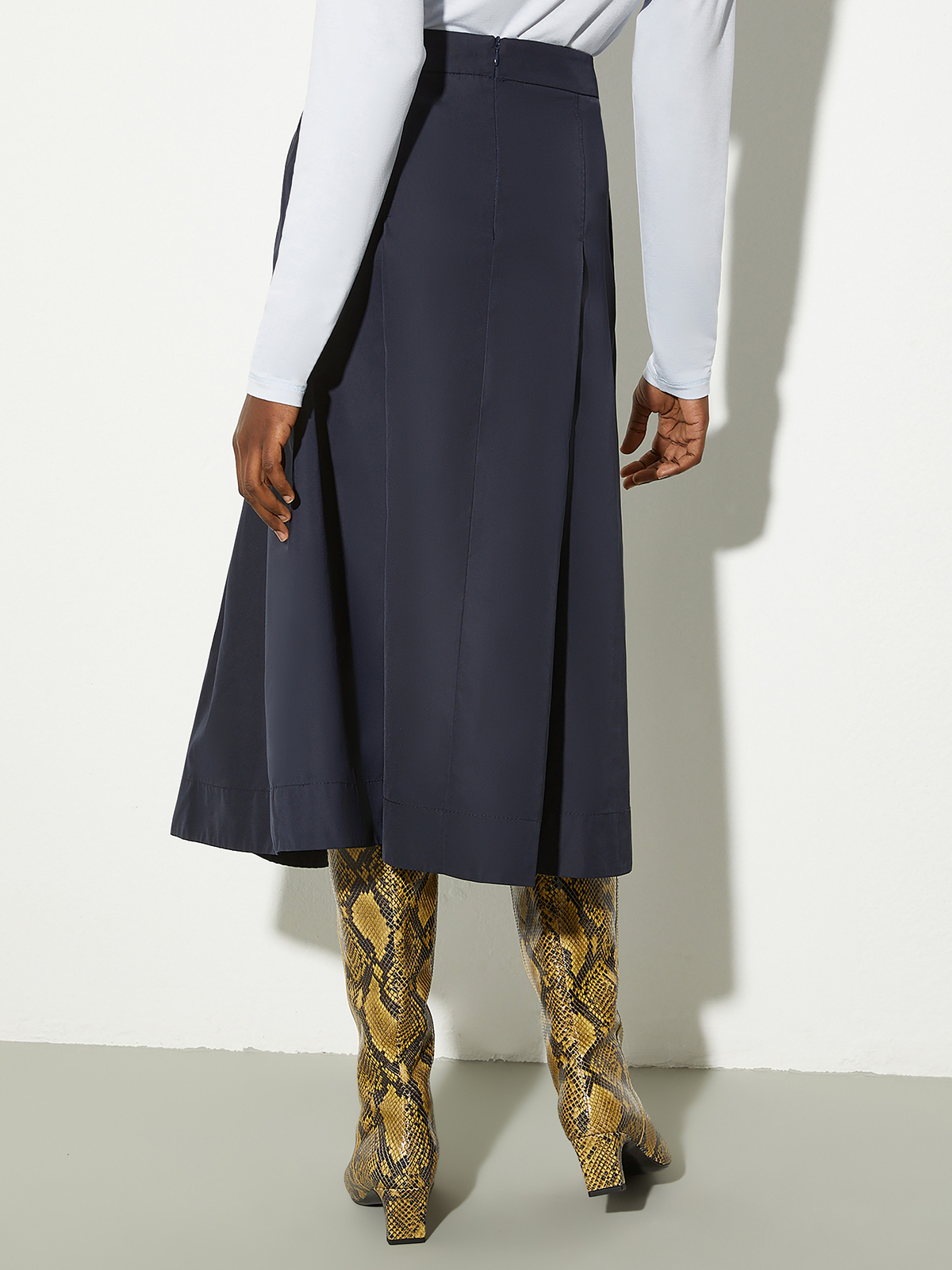 ボックスプリーツをあしらい裾に向けて広がりを持たせたフレアラインのミディレングス。