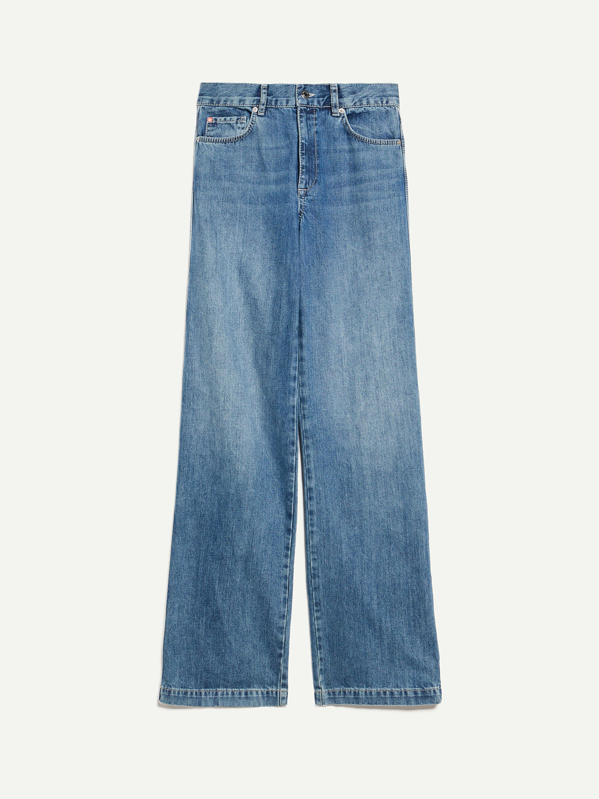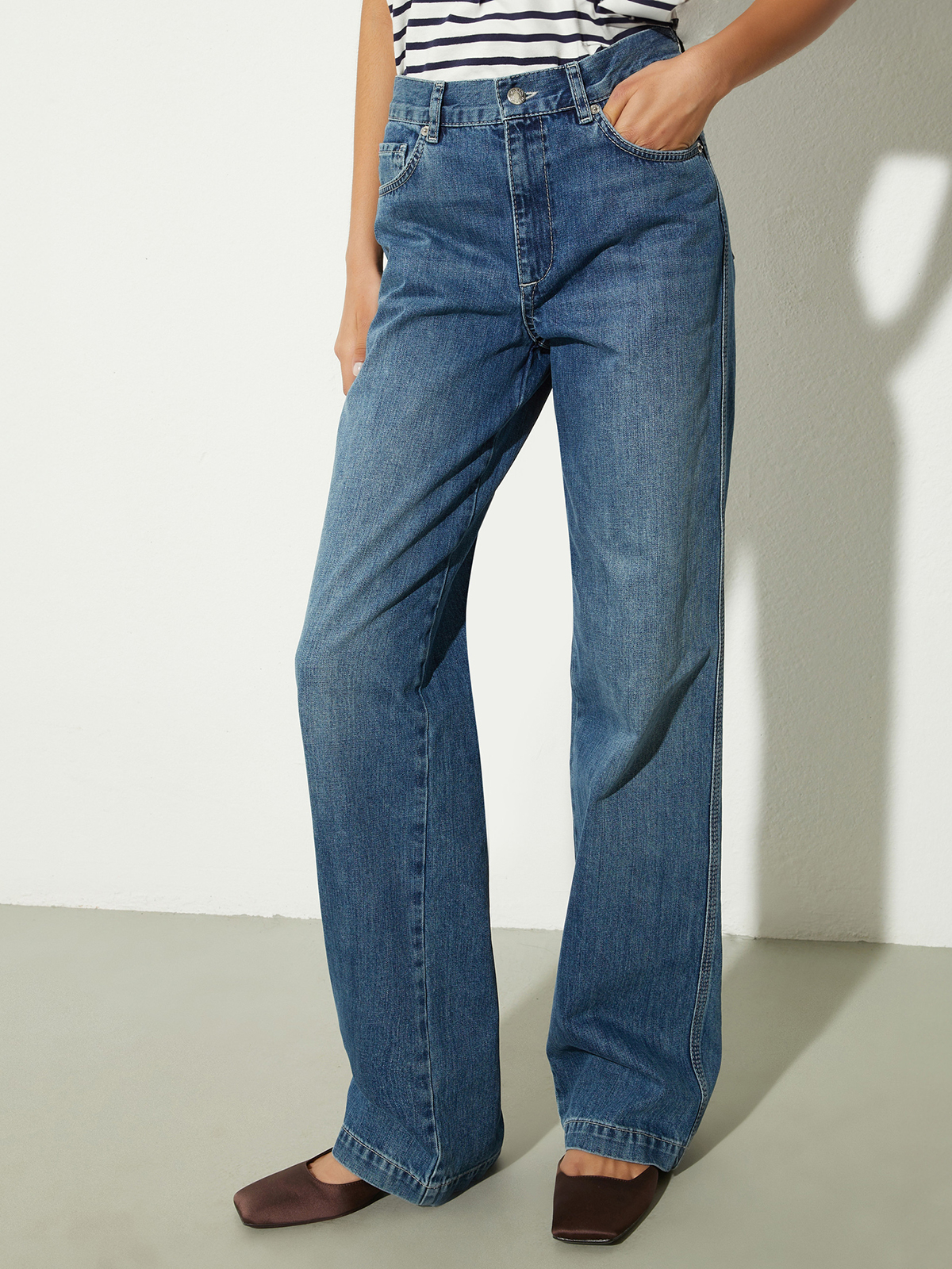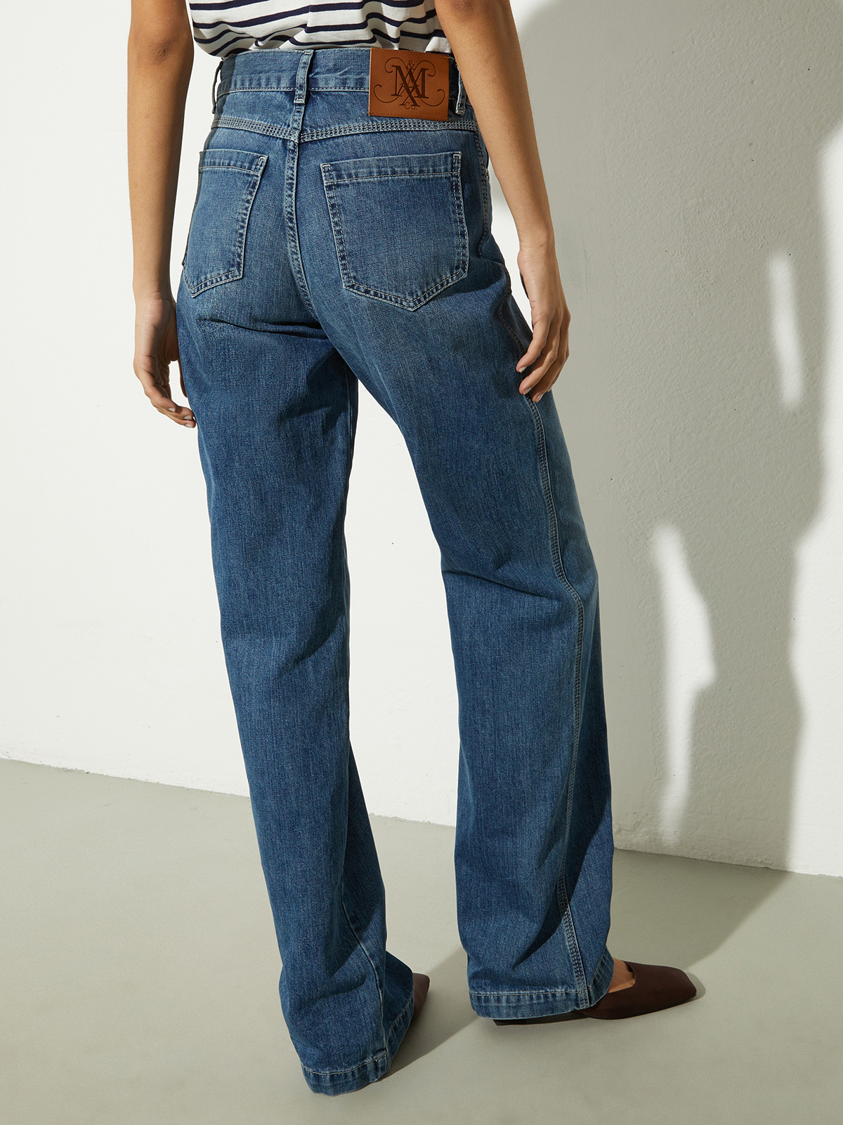 ミディアムウォッシュ加工を施したストレートレッグジーンズ。