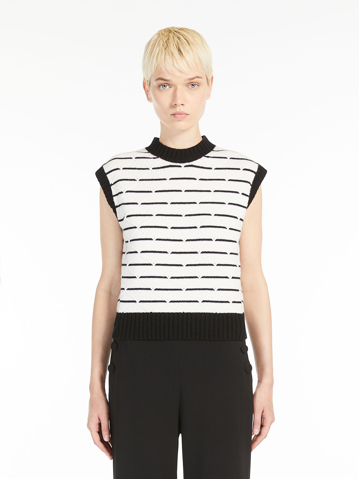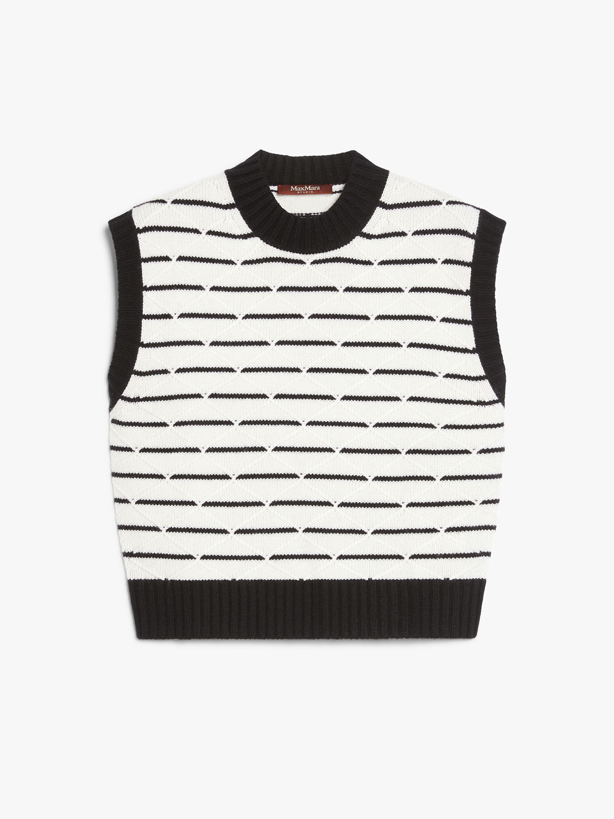ストライプ柄と立体感のあるダイヤモンド柄をあしらったニットベスト。
