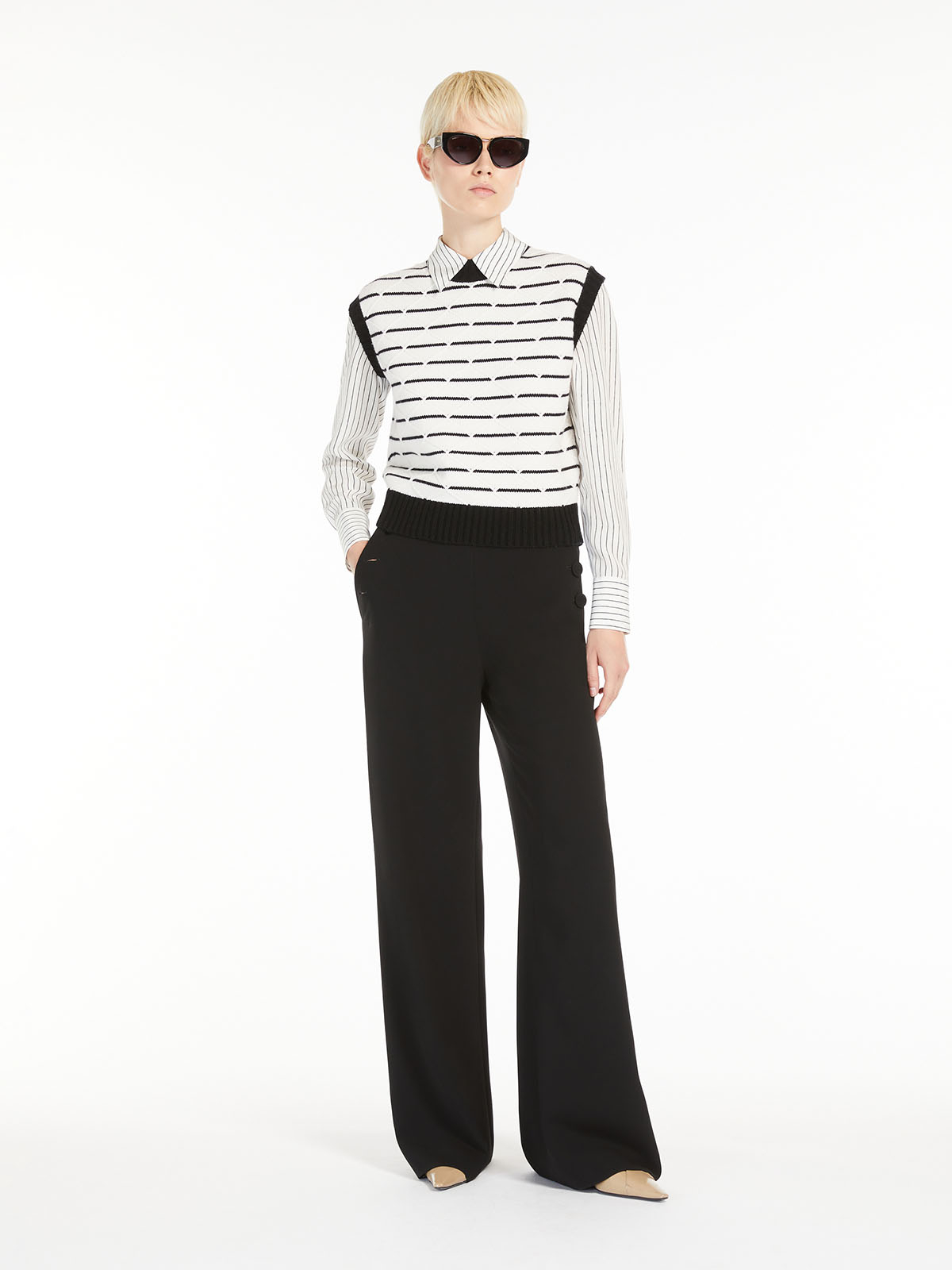 シルエットは、幅広のリブ編みのトリミングをあしらったハイネックにストレートフィットのクロップドレングス。