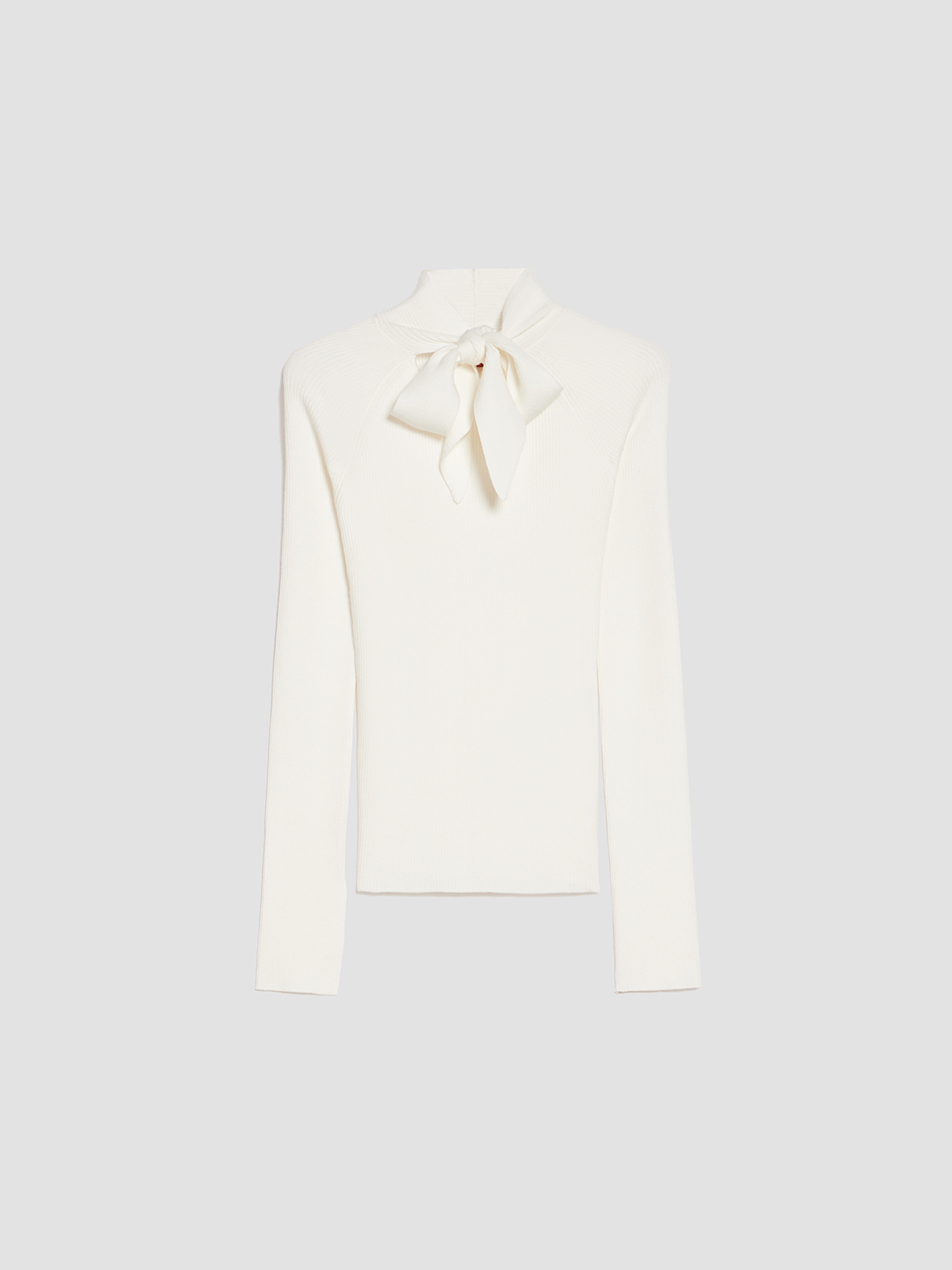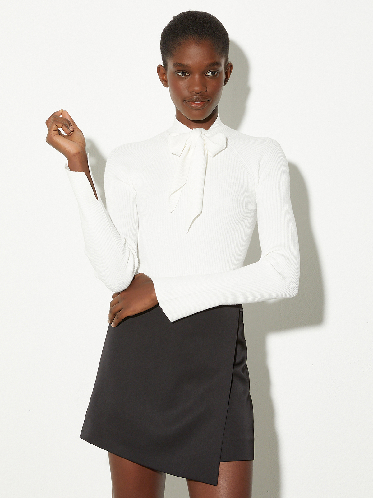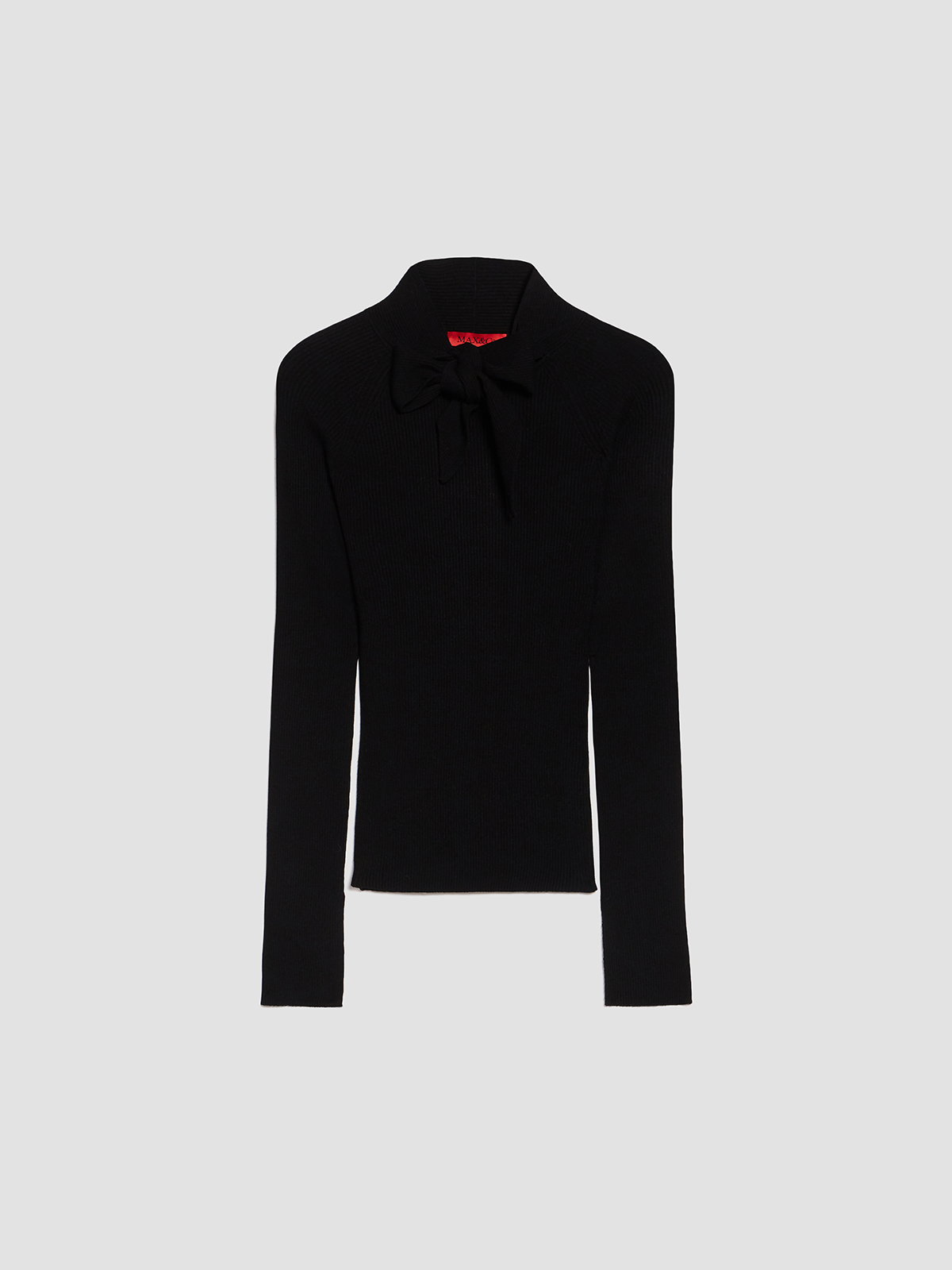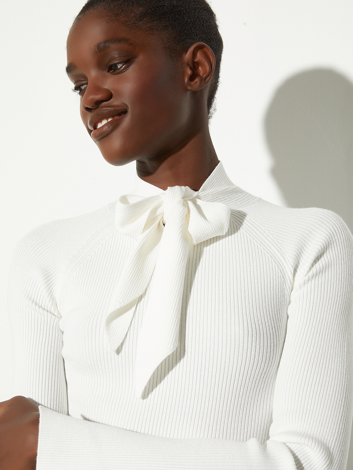 プッシーボウカラーがフェミニンな印象のリブニット。