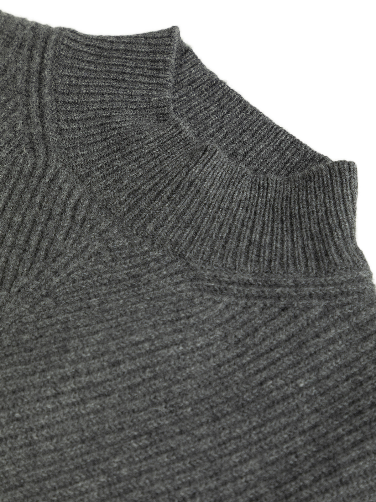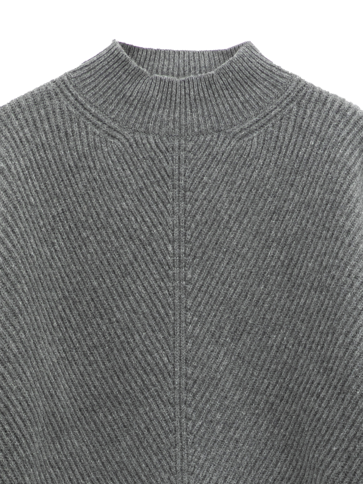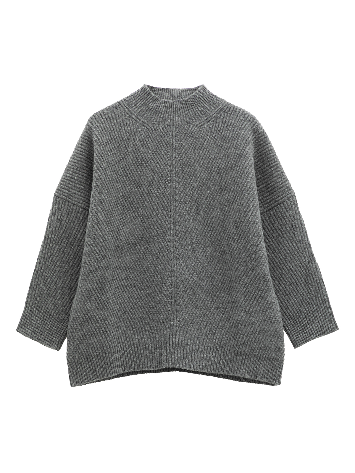 ヘリンボーン風の編み方が特徴的なニット。ウールとカシミヤがブレンドされたニットは、非常に肌触りが良く柔らかな質感に仕上がっています。シルエットは高めのネックに七分袖。ドロップショルダーがリラックス感をプラスします。スカートからパンツまで幅広いアイテムと合わせて着こなしいただけます。<ポケット>なし<スタイル>七分袖