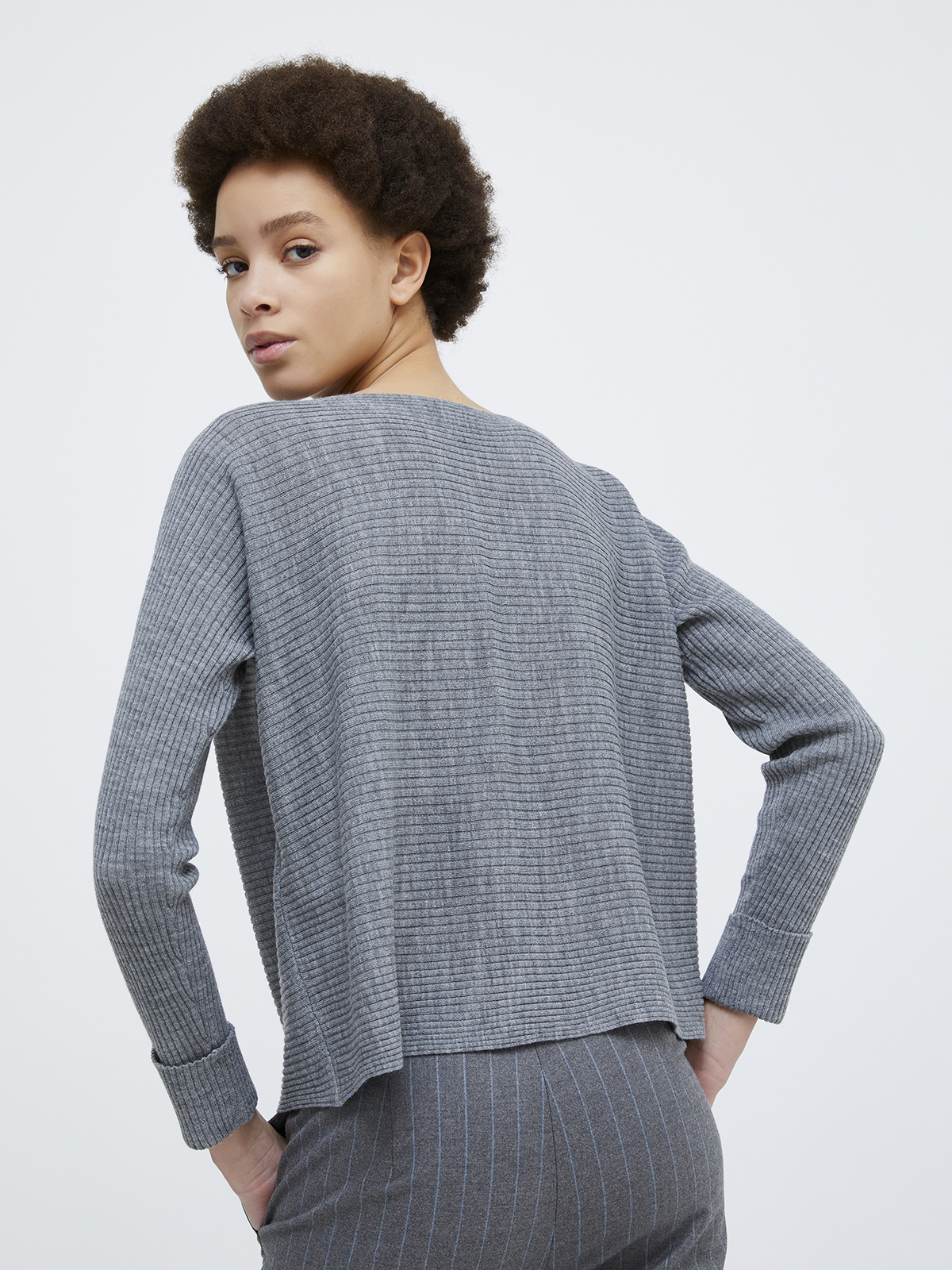 リブを横方向に配置し流れるようなキモノ風のシルエットを生み出します。