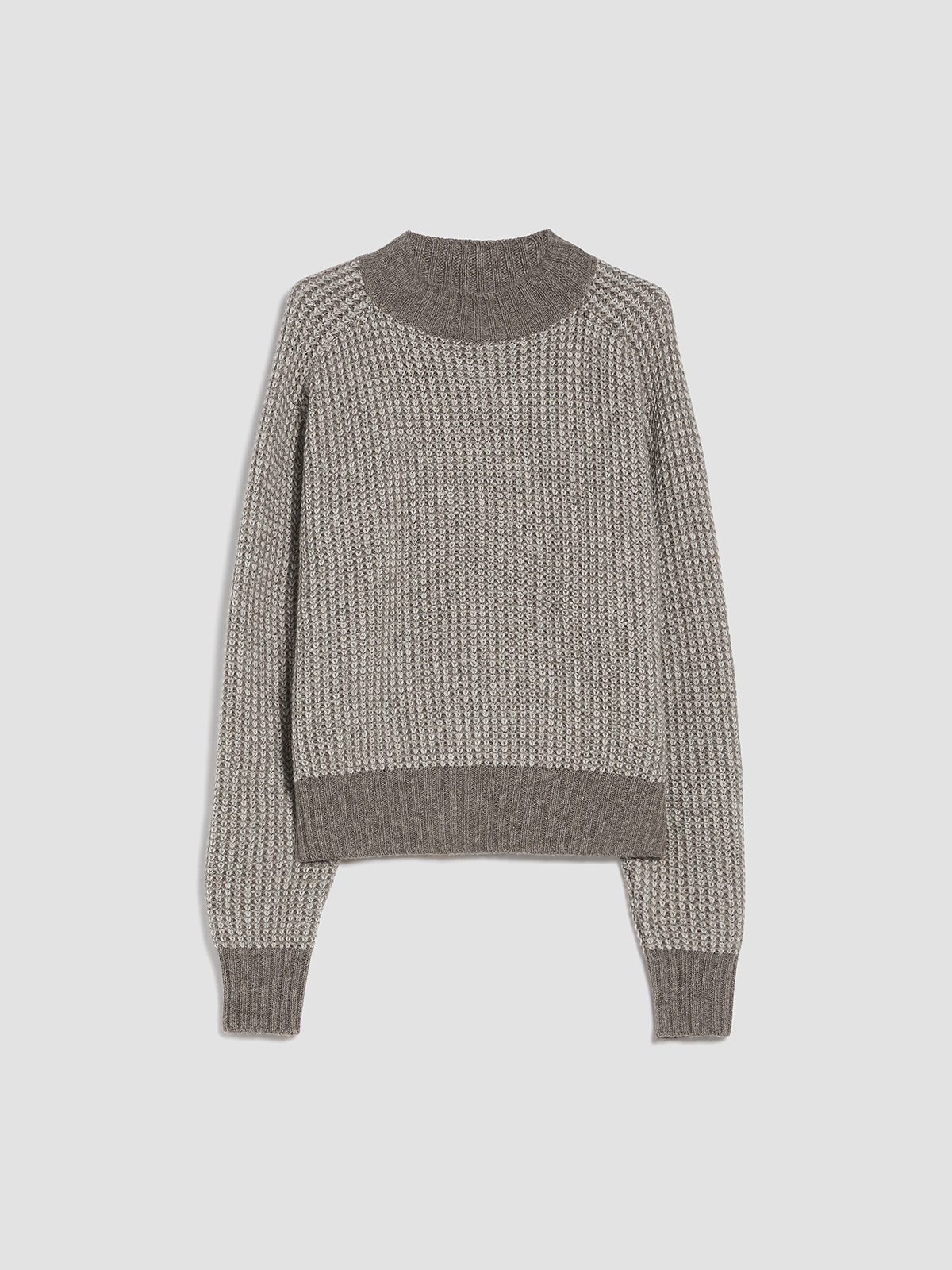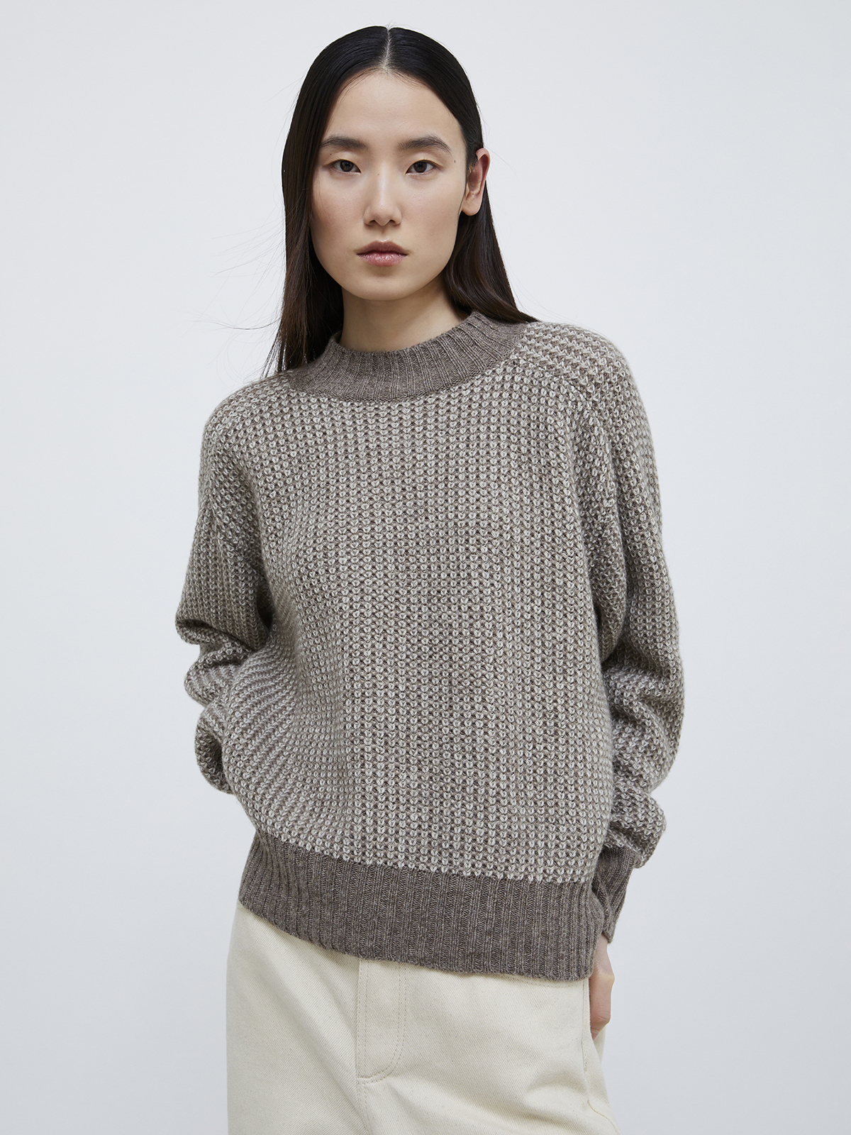ワッフル編みのディテールが目を引くラウンドネックニット。