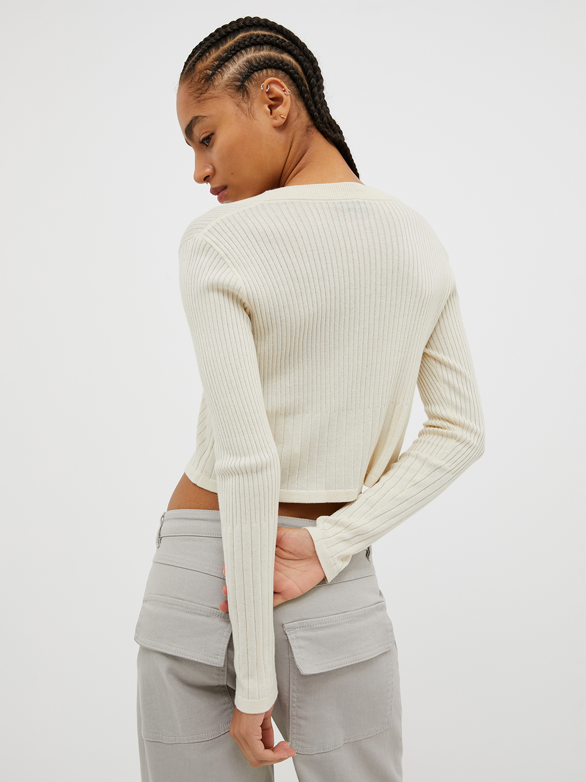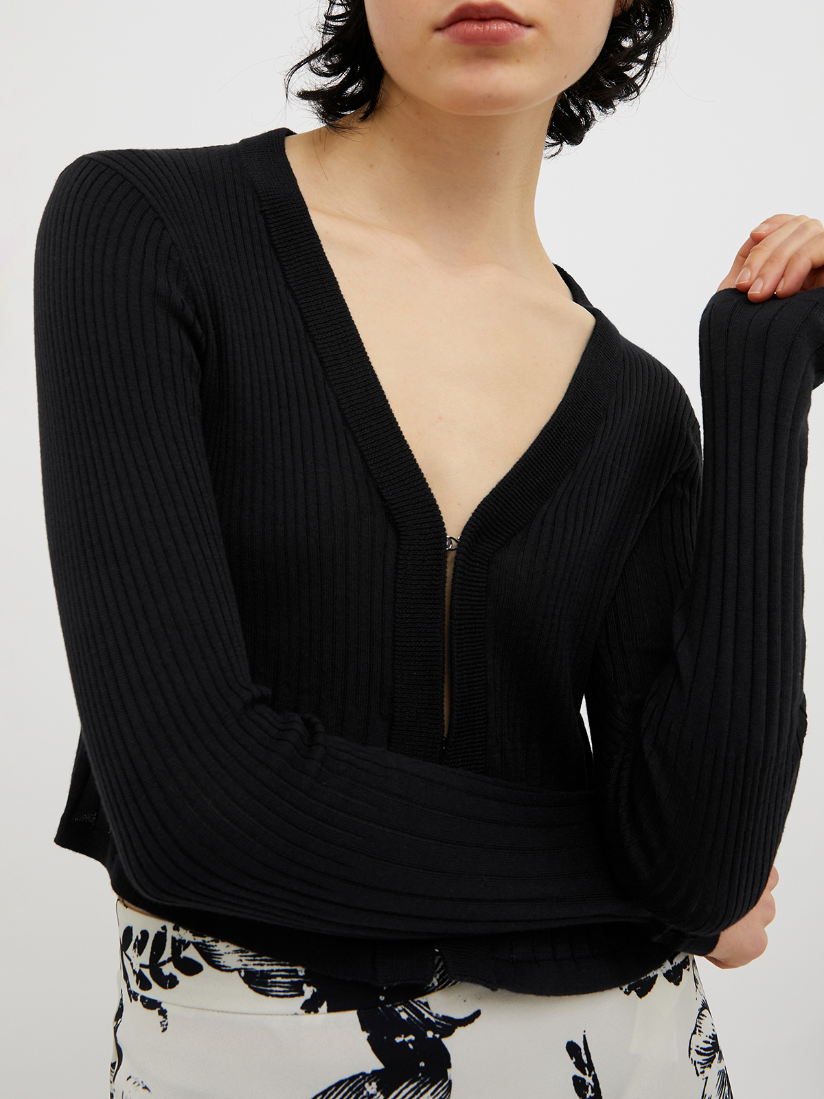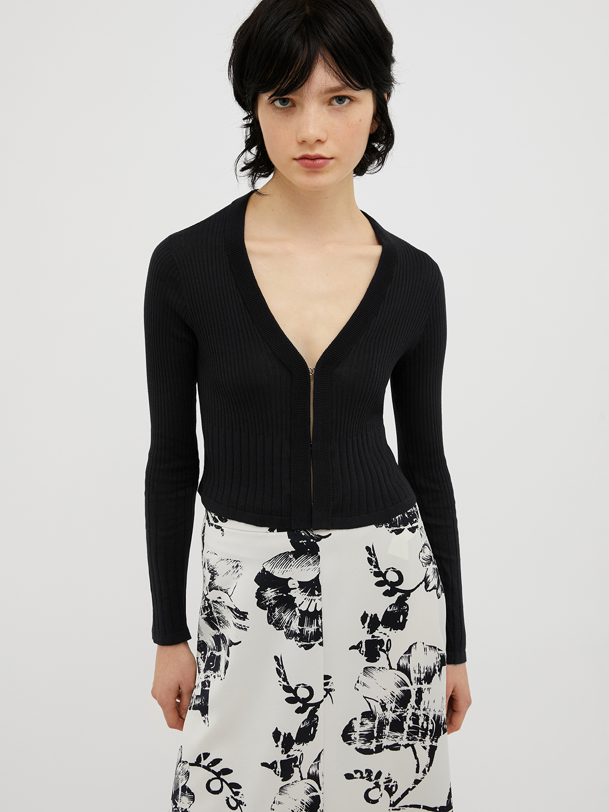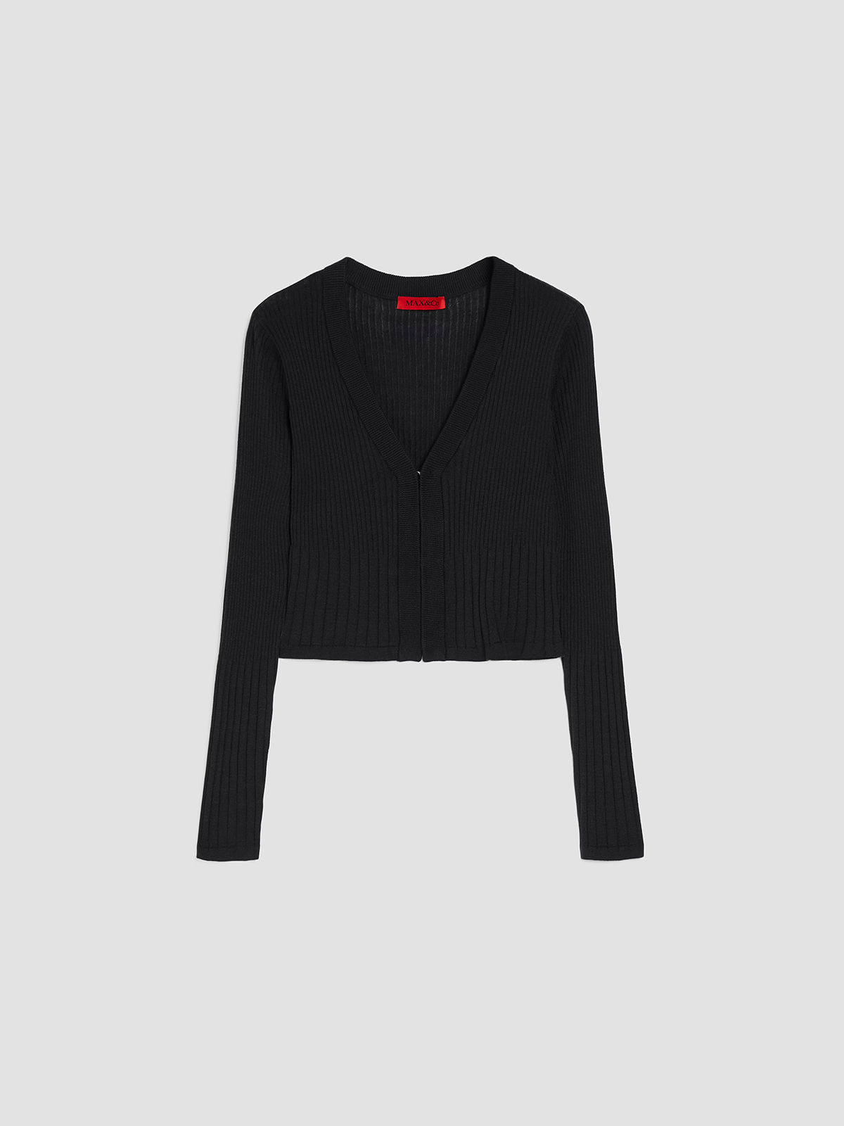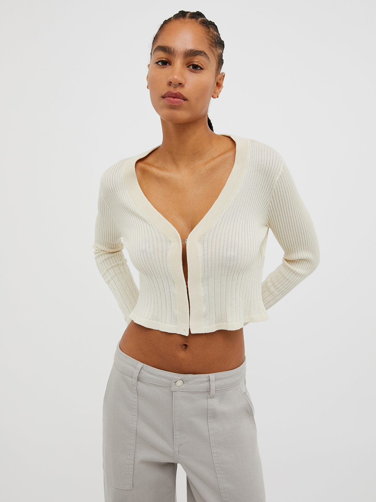 すっきりとしたクロップドレングスに仕上げたカーディガン。