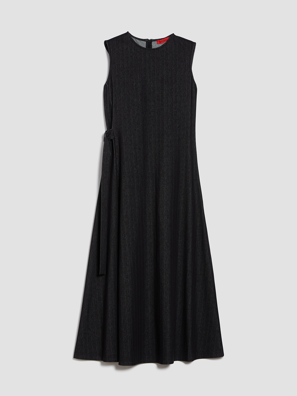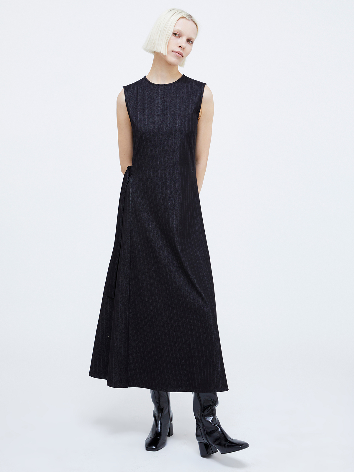 ラウンドネックにスリーブレスのフィット感のあるトップに、裾に向けてエレガントに広がるフレアラインのミディレングス。