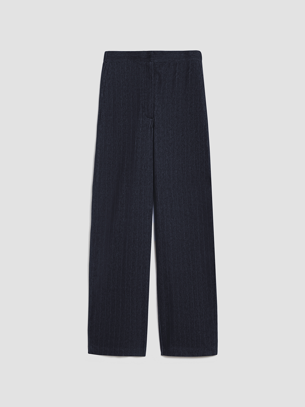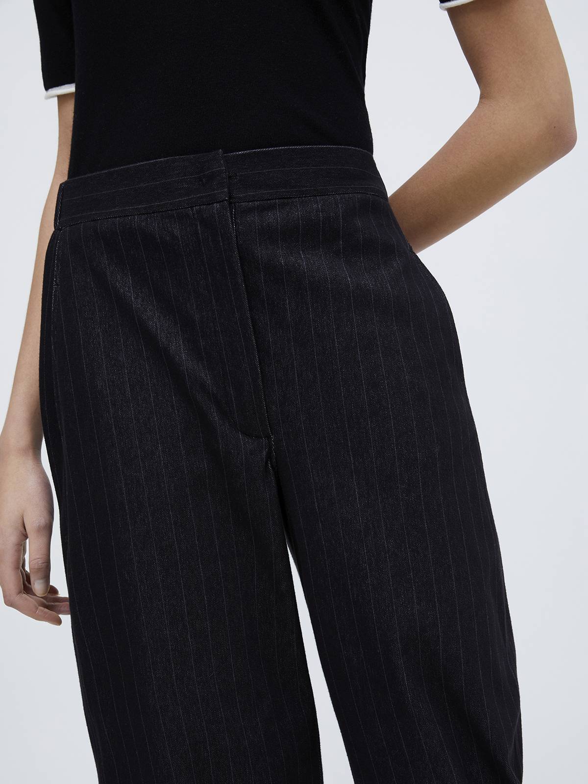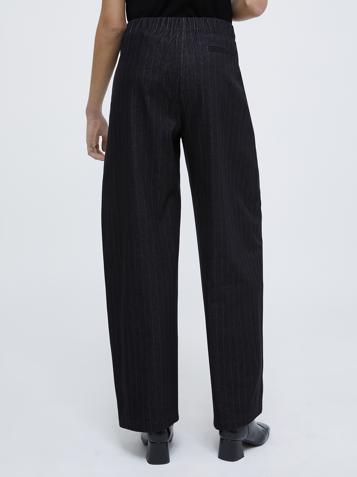 バックウエストに伸縮性のあるインサートをあしらい、太もも周りから幅広に湾曲したバレルレッグカットが特徴的。