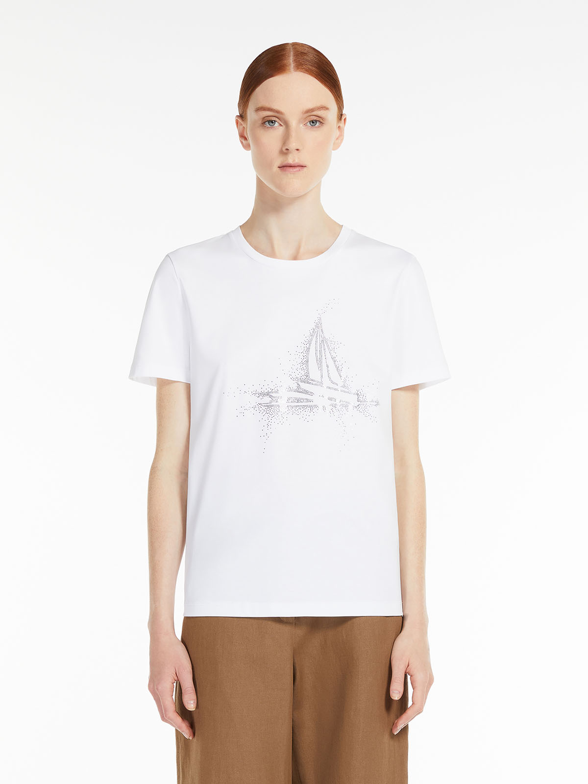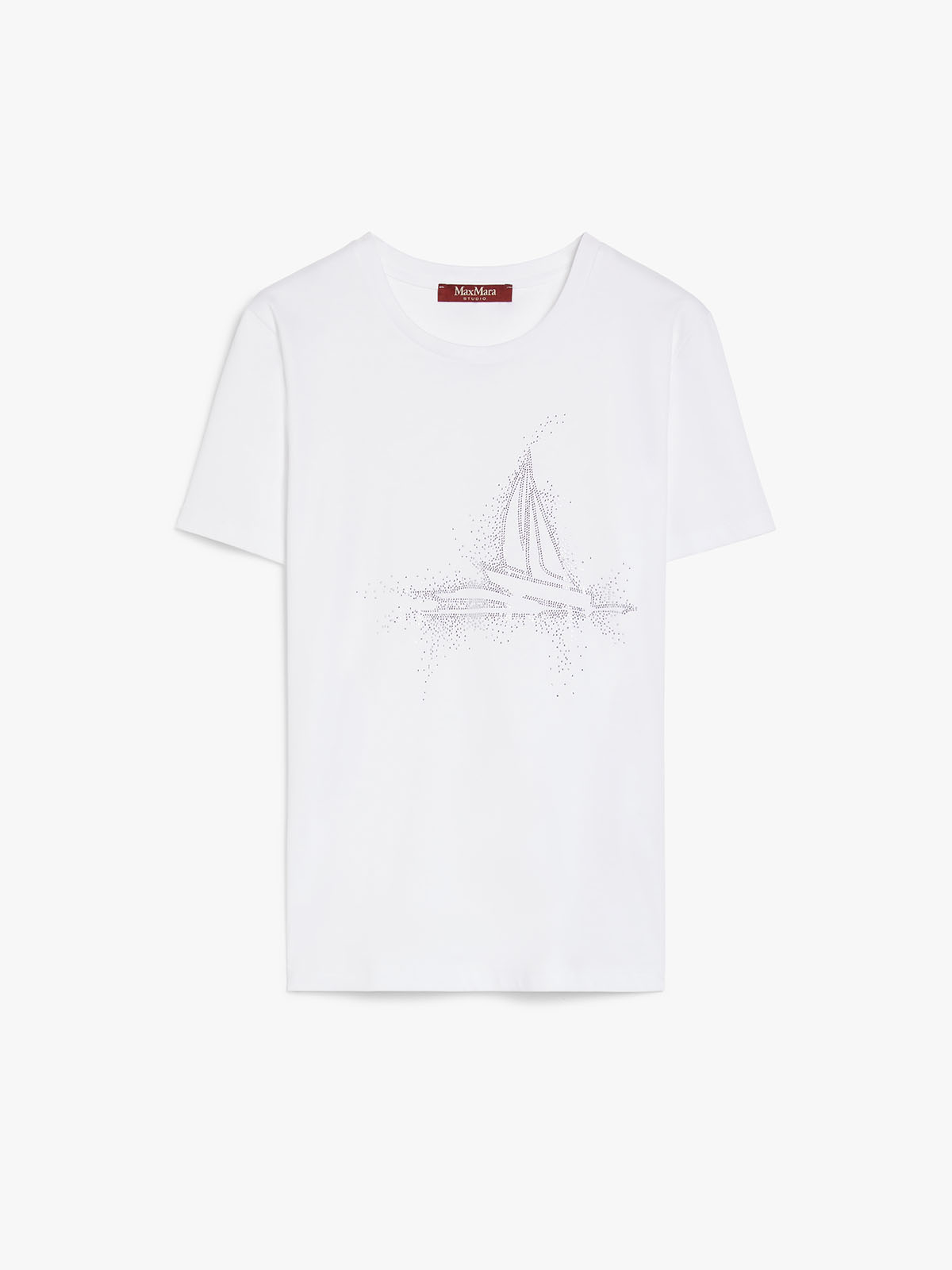 マリンスタイルにインスパイアされたヨットモチーフをラインストーンであしらった コットンジャージーTシャツ。