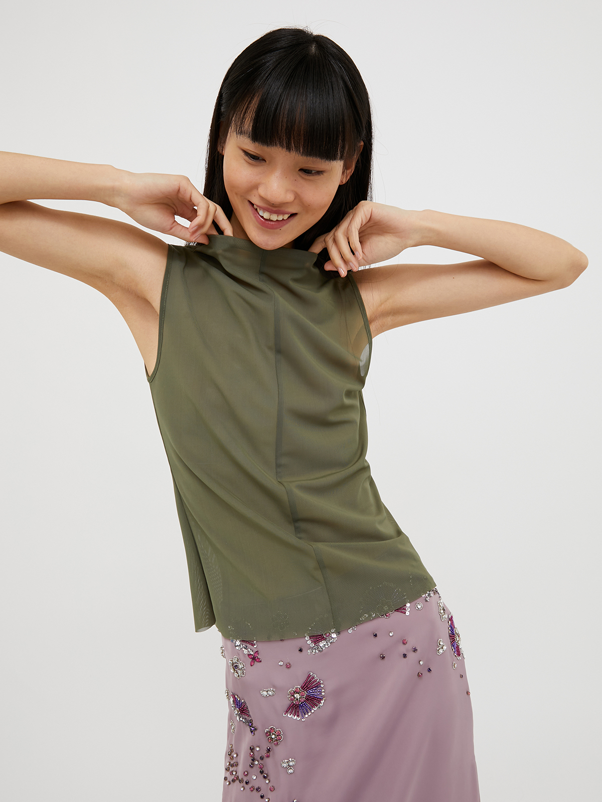 テクニカルチュールジャージーで作られたスリーブレストップ。 軽量で柔らかなチュール生地は、繊細なシアー感が魅力です。 ファンネルネックにストレートラインのミニマルなデザインで、素材感を引き立てます。 キャミソールと合わせて透け感を楽しんだり、レイヤードスタイルのインナーとして季節を通して着用できる、さわやかな1枚です。 <ポケット>なし <スタイル>スリーブレス