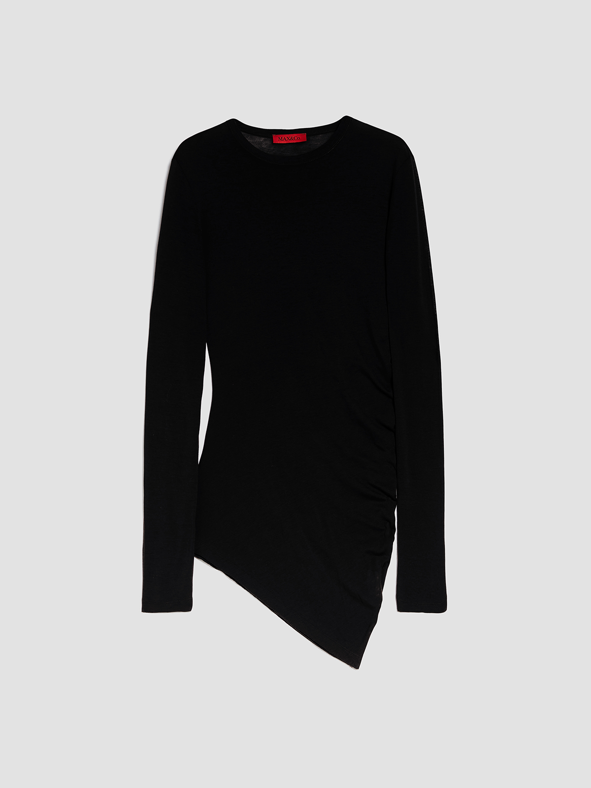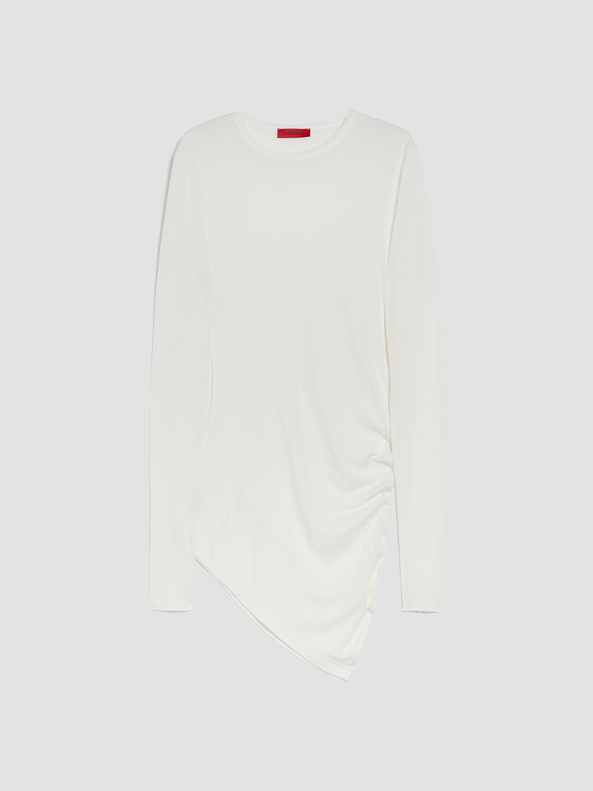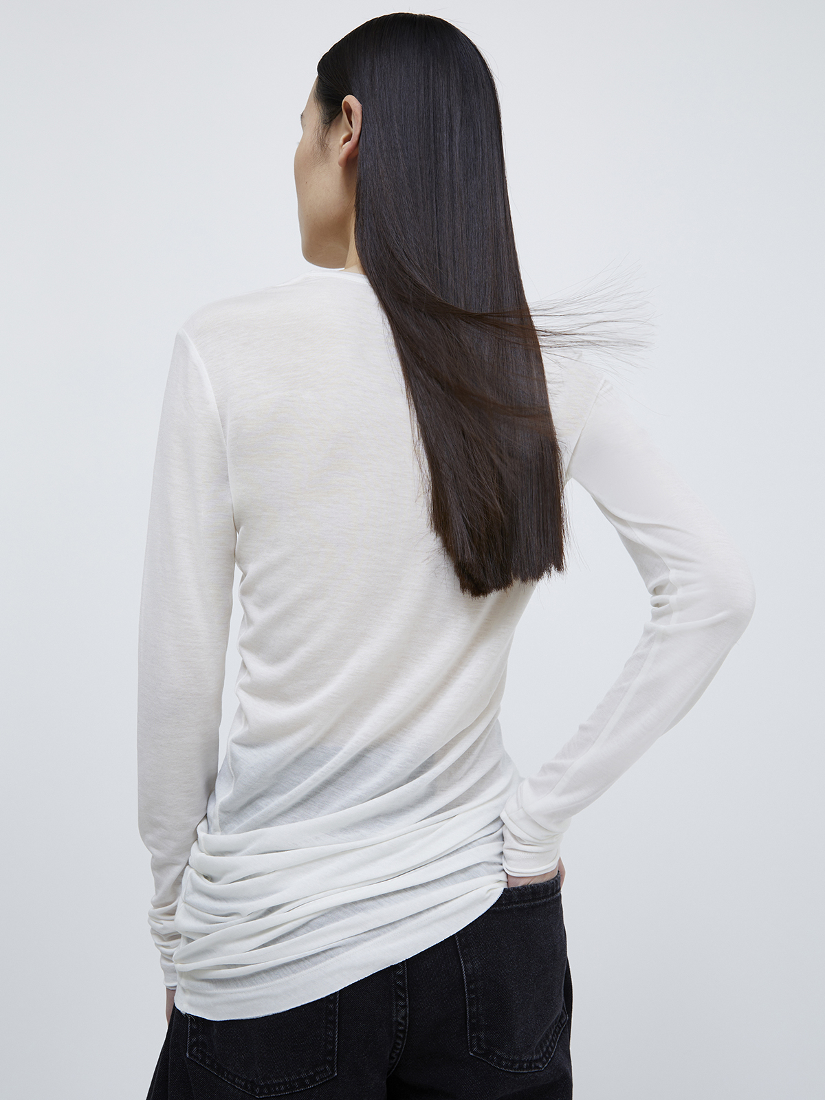 シルエットは、サイドにギャザーを寄せフェミニンなドレープ感を生み出す、ボディラインに沿ったスリムフィット。