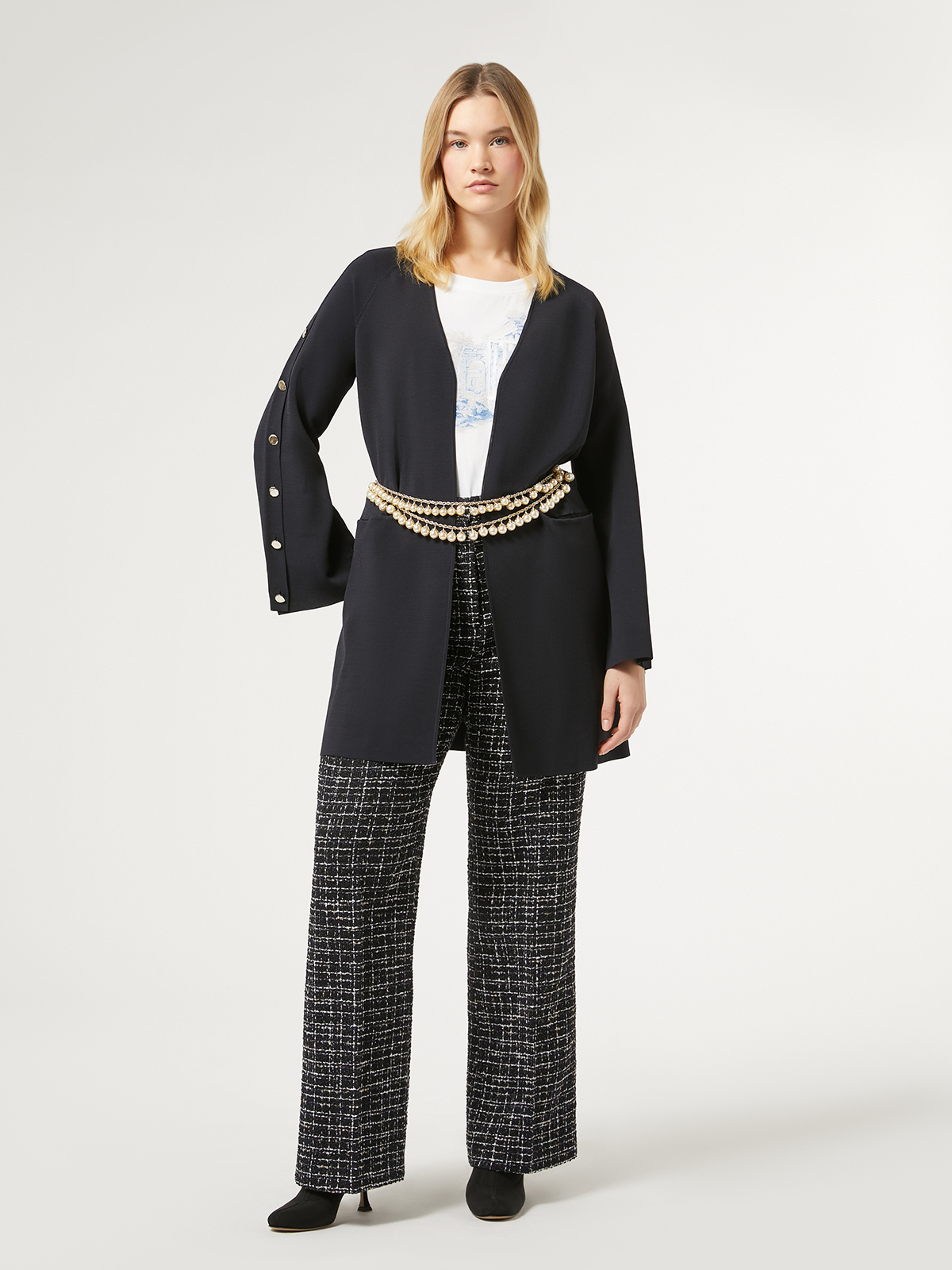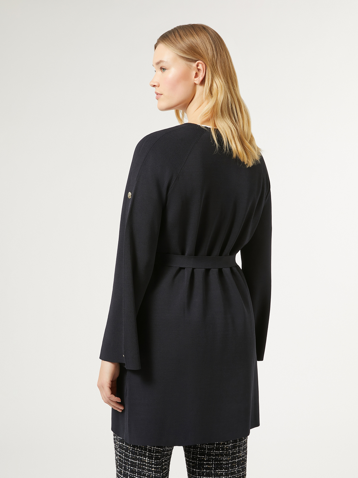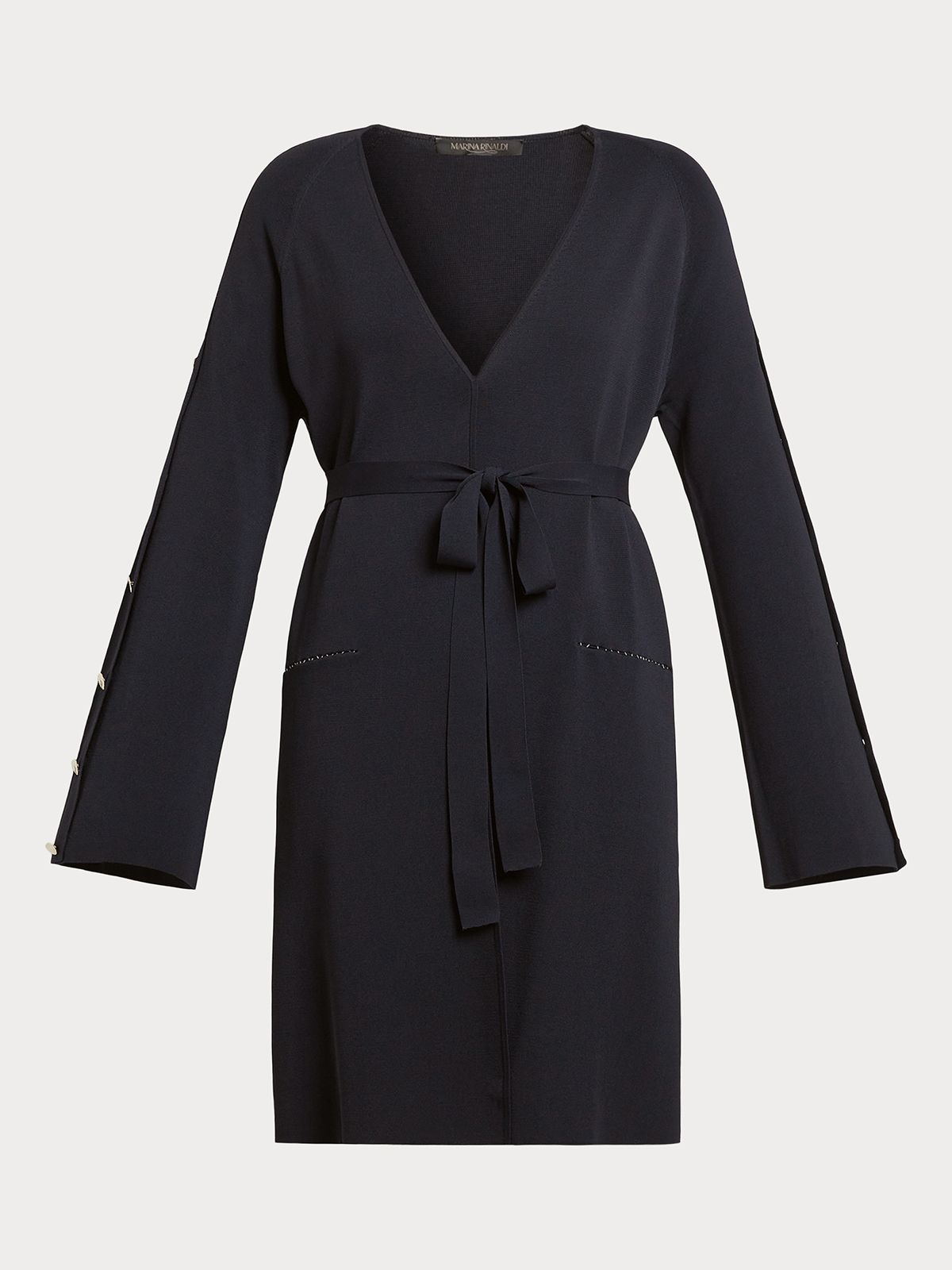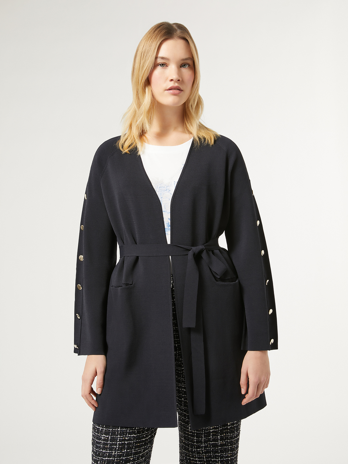 袖に並んだゴールドボタンが華やかさを引き立てるニットロングカーディガン。