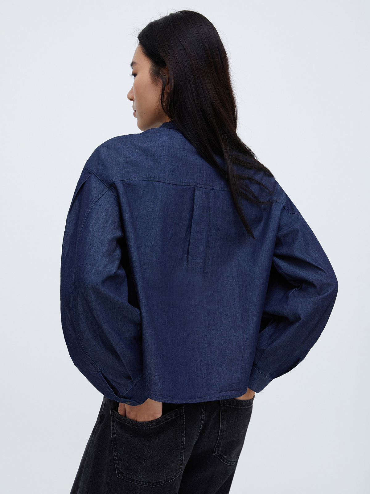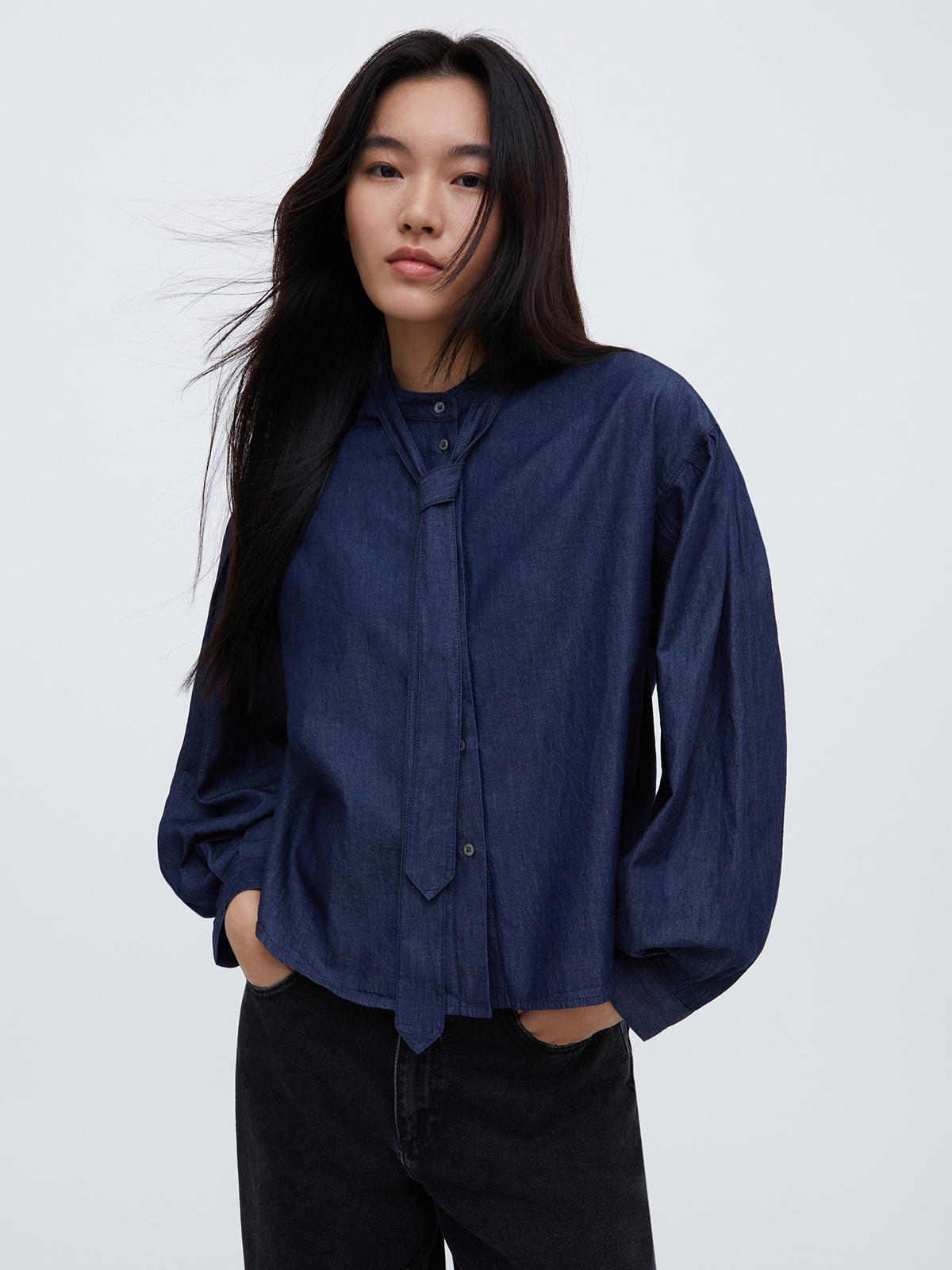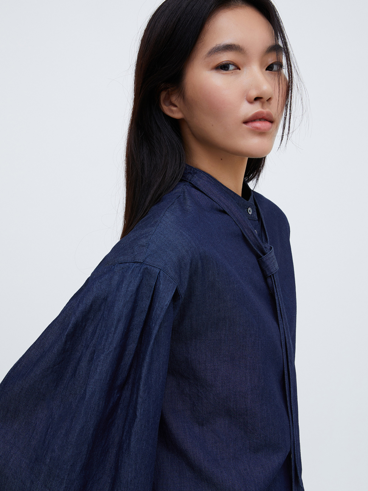 インディゴ染めの味わい深い風合いが魅力のコットンデニムブラウス