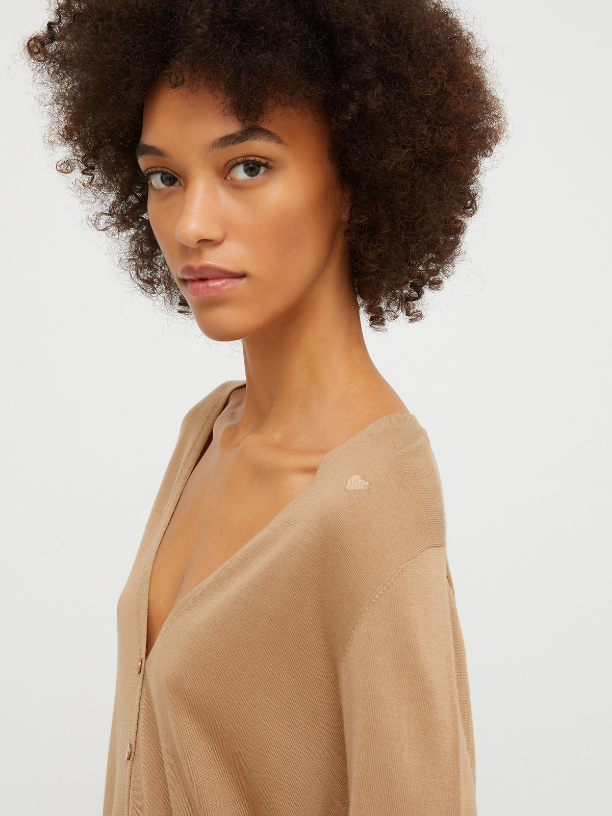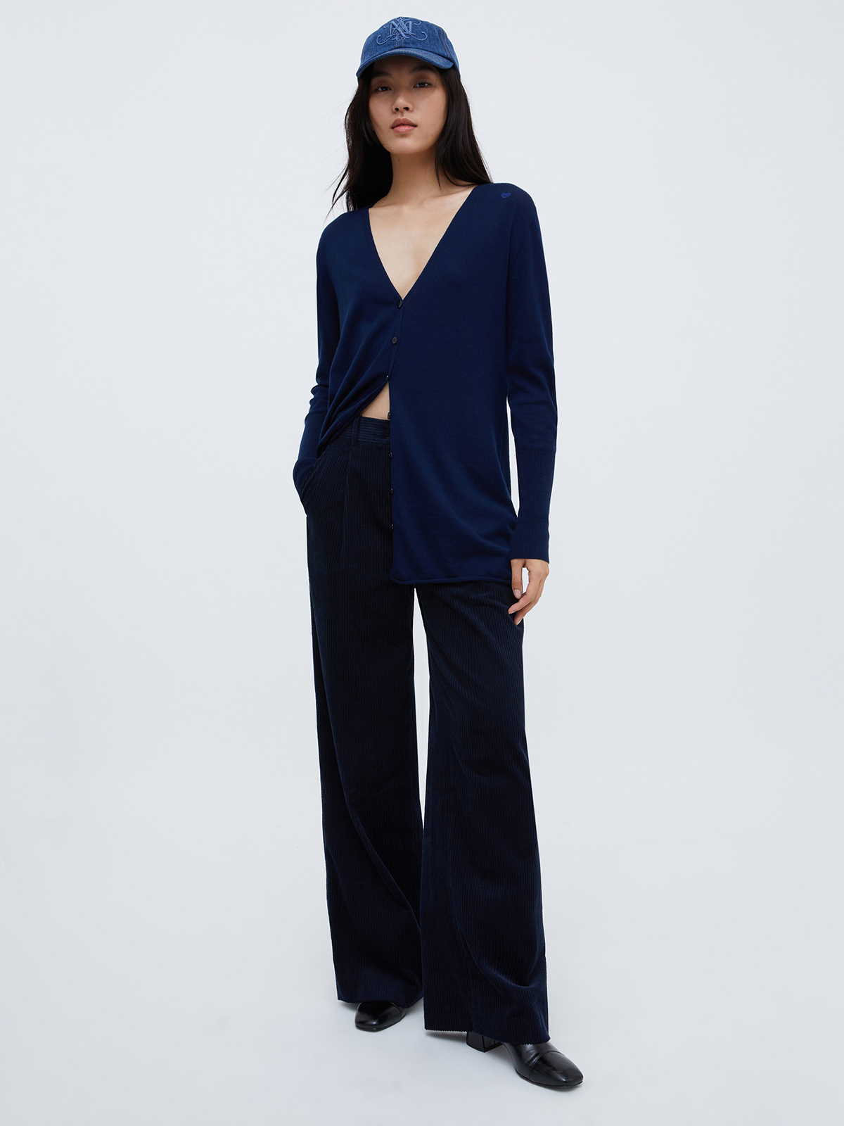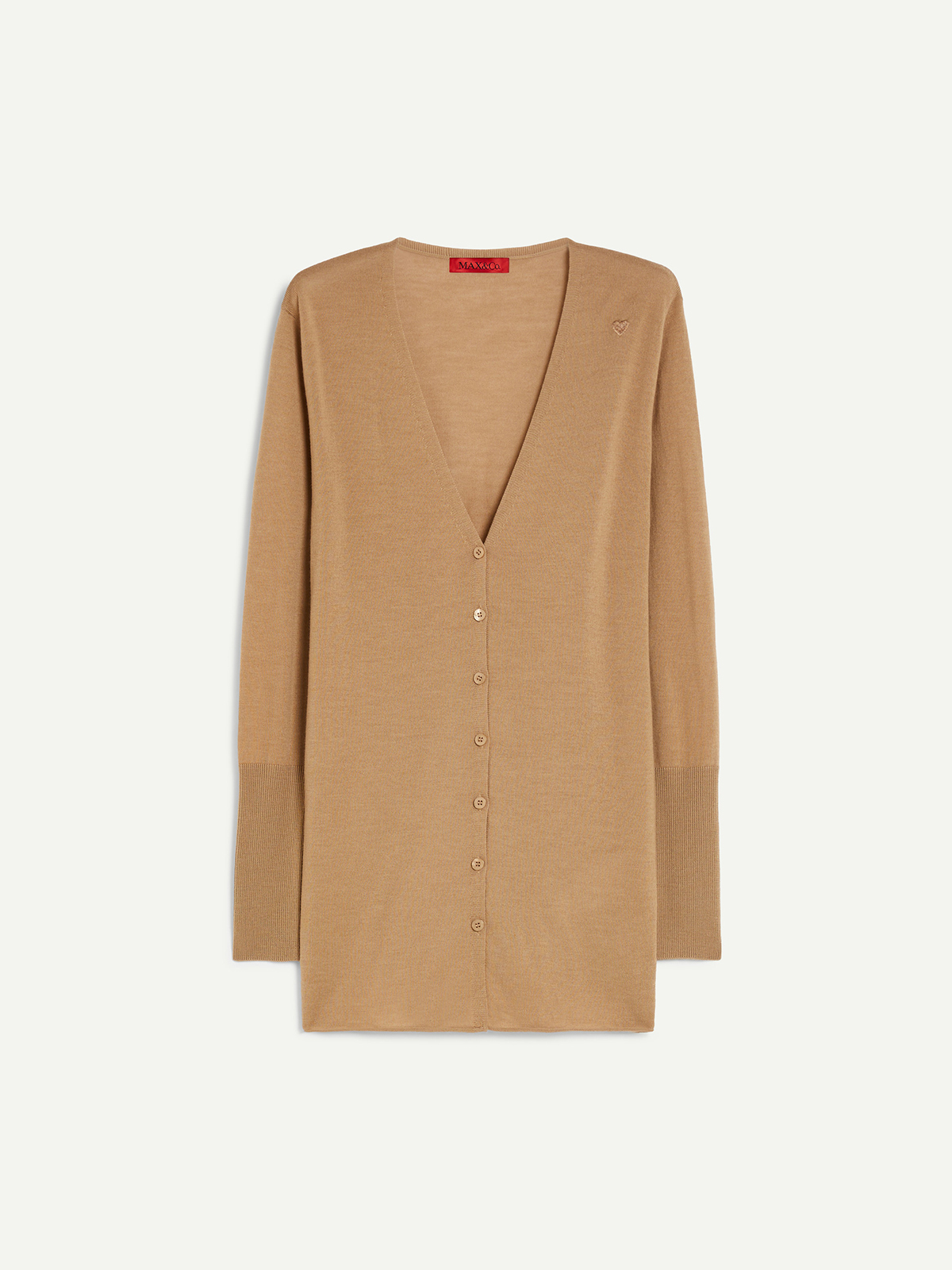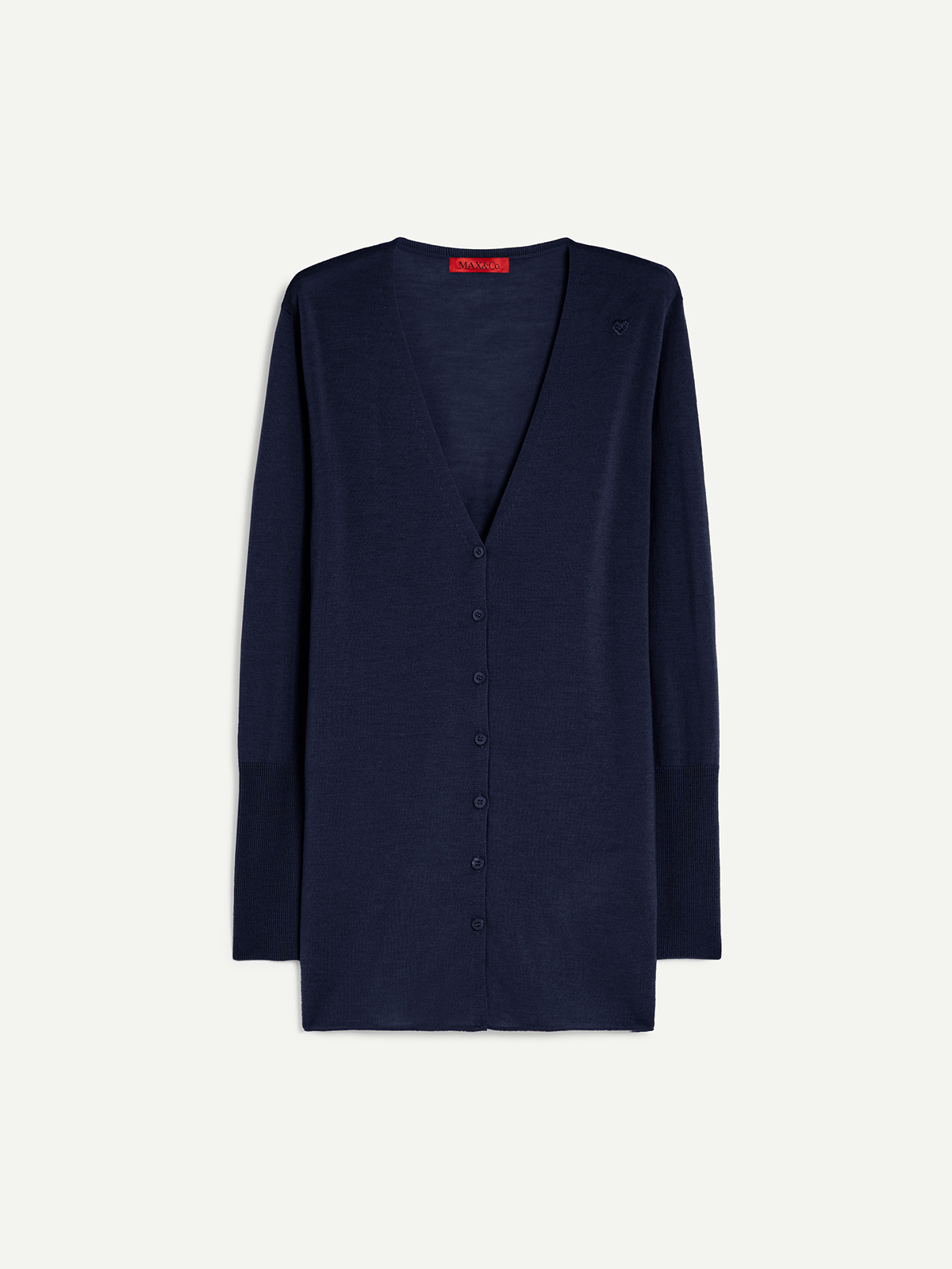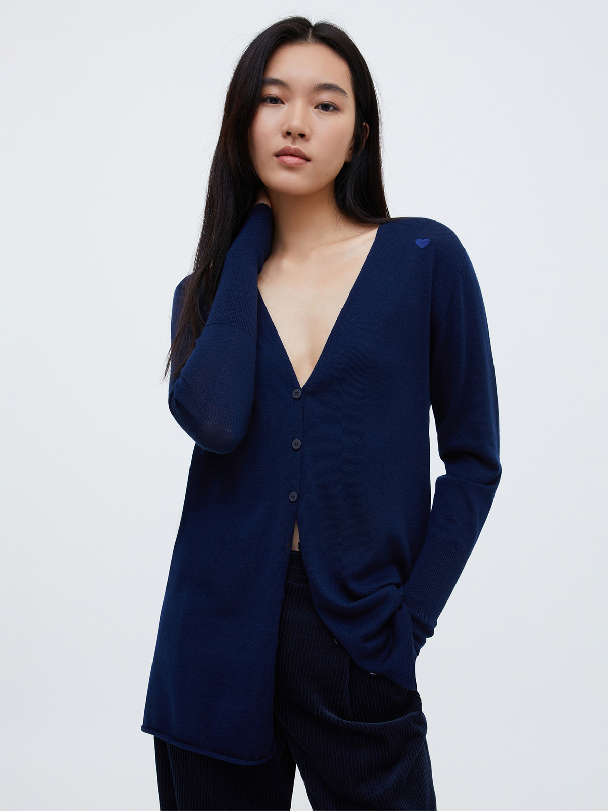 ピュアメリノウールのニットカーディガン。 ややロング丈、深めのVネックシルエットでスタイリッシュな印象に。 袖口は高いリブ編みで、ややフィット感のあるスリムなカットです。 肩部分に刺繍された小さなハートがアクセント。 季節の変わり目のレイヤリングとしてもおすすめなアイテムです。 <ポケット>なし <スタイル>Vネック