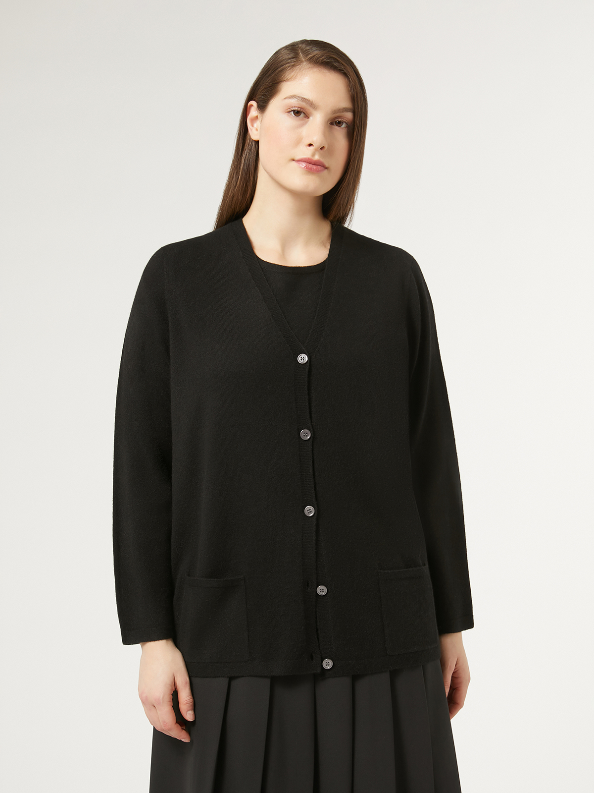 さっと羽織ったスタイルはもちろん、ボタンを閉めるとVネックのエレガントなシルエットに。
