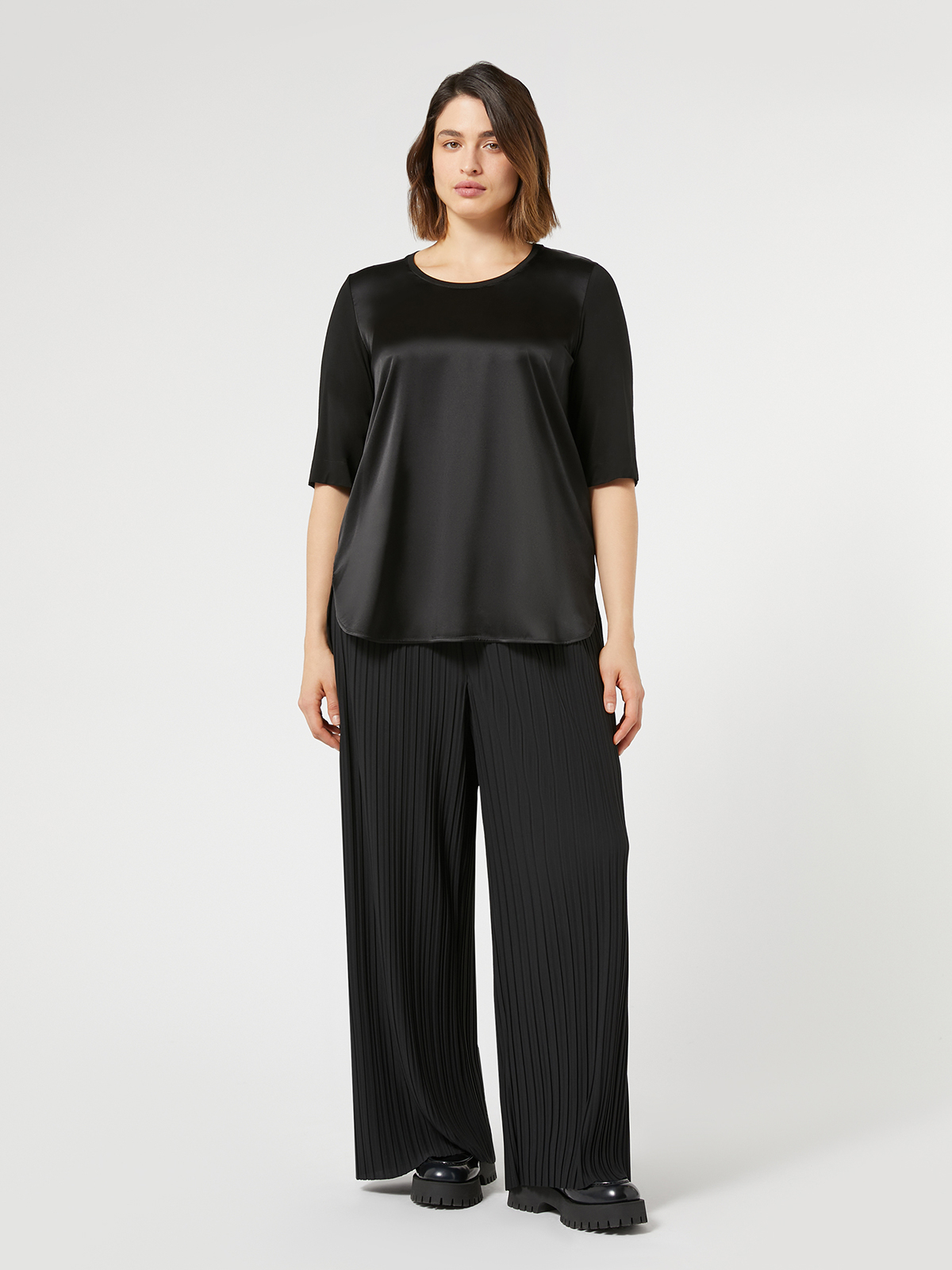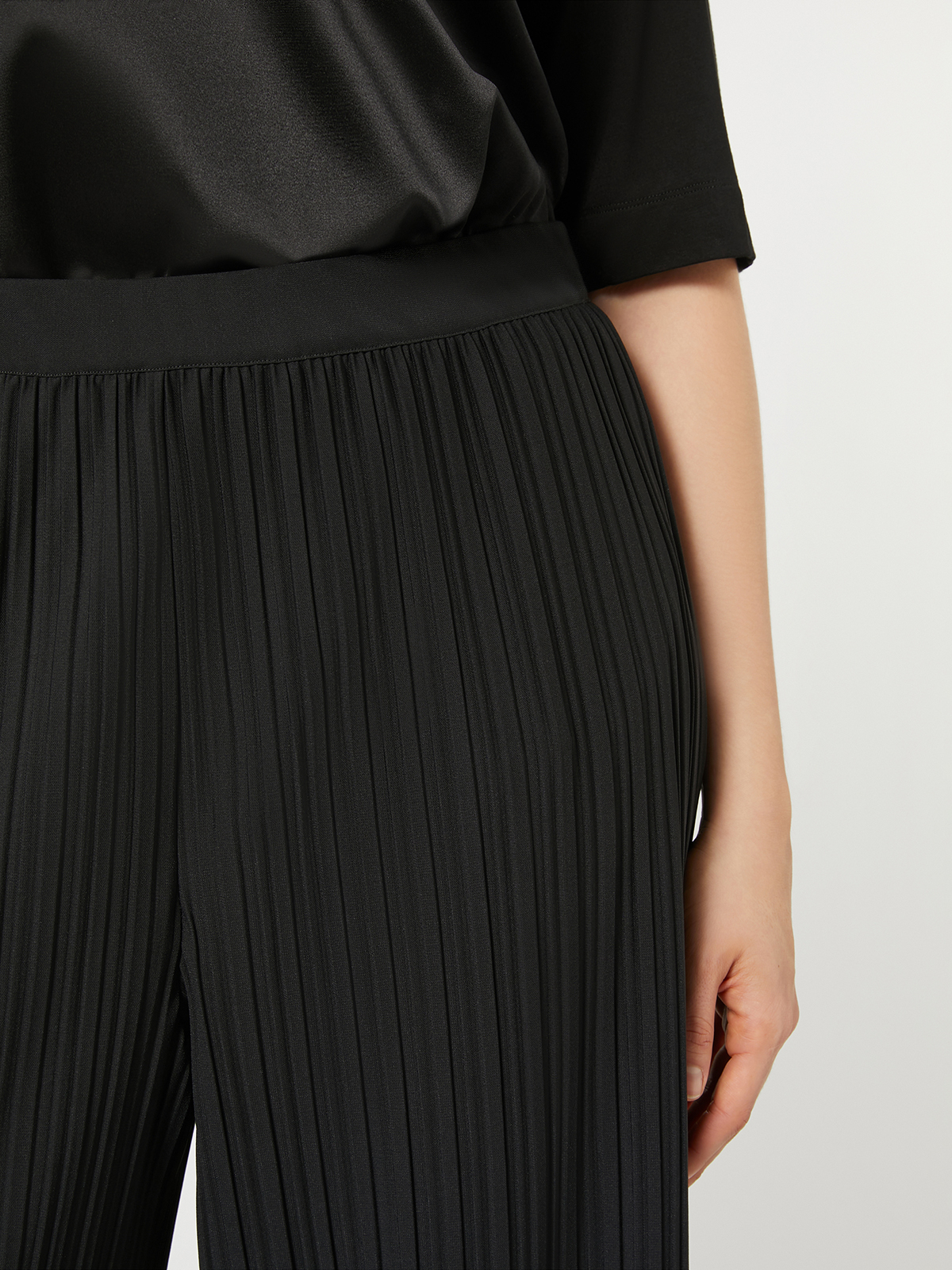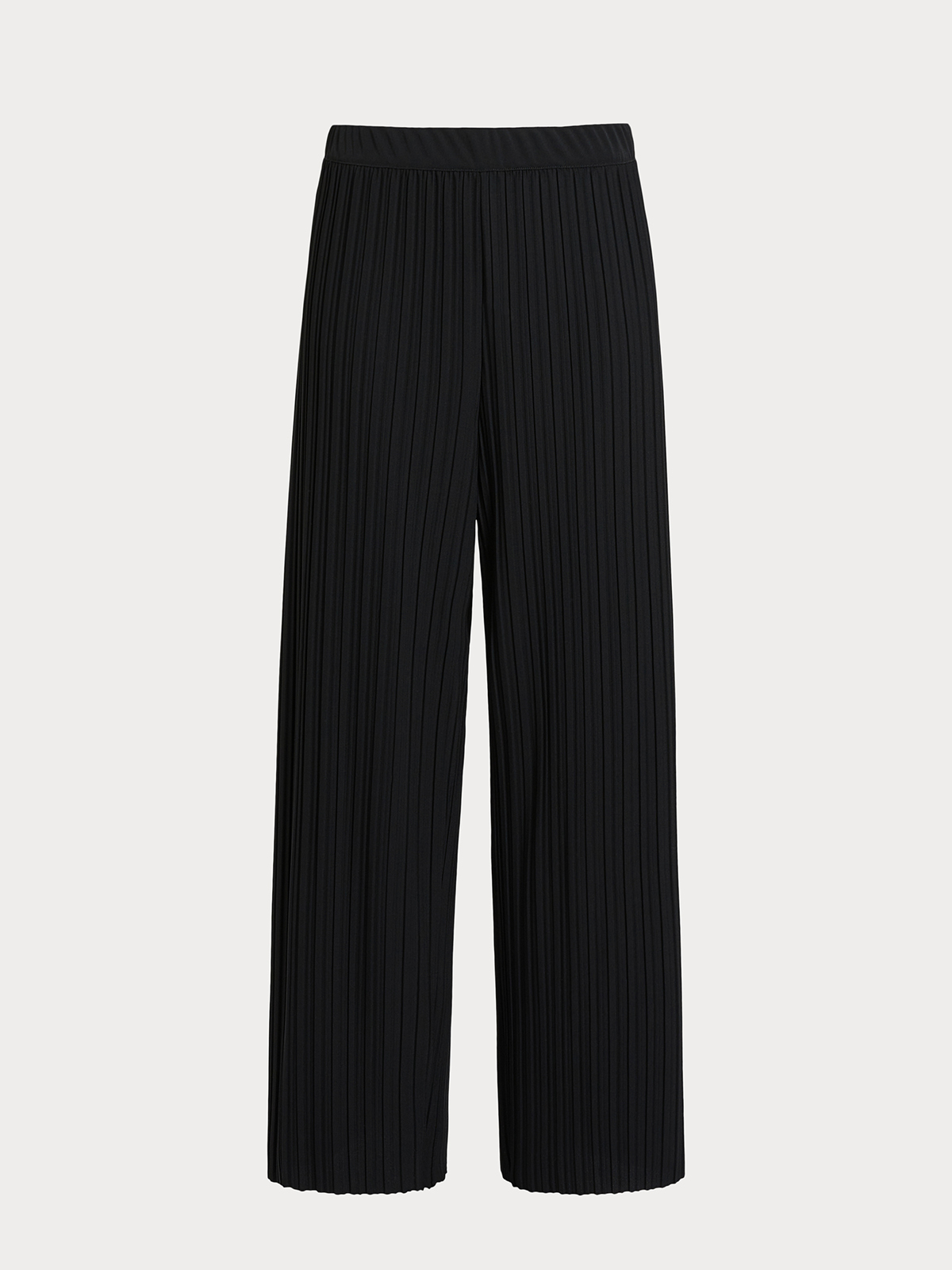 細かなプリーツを施した動きのある表情がエレガントに映えるサテンジャージーパンツ。