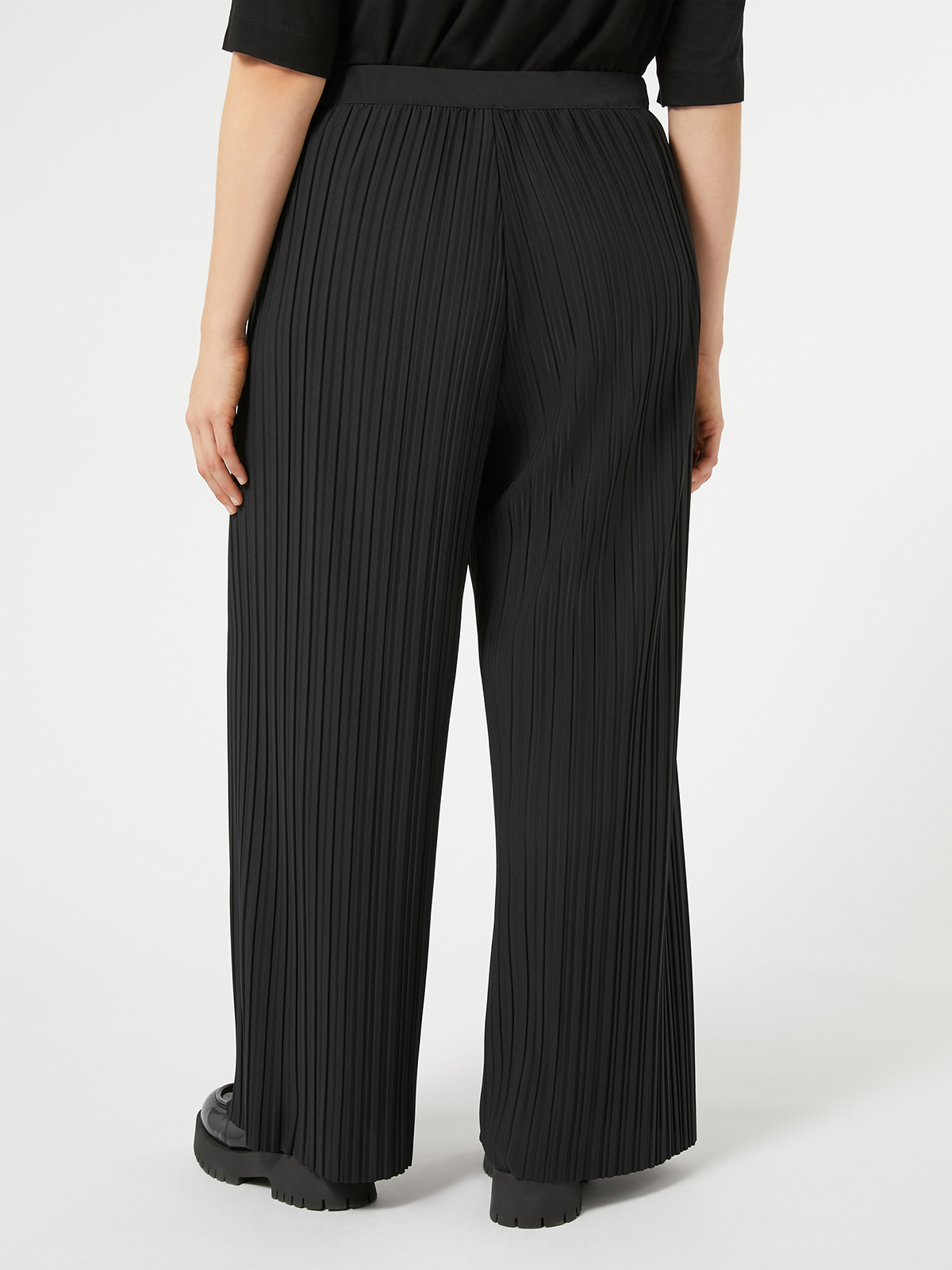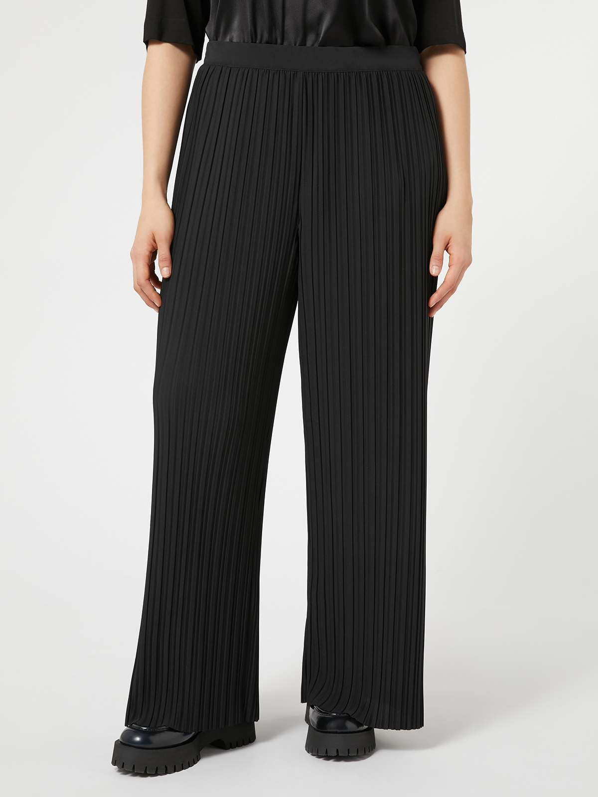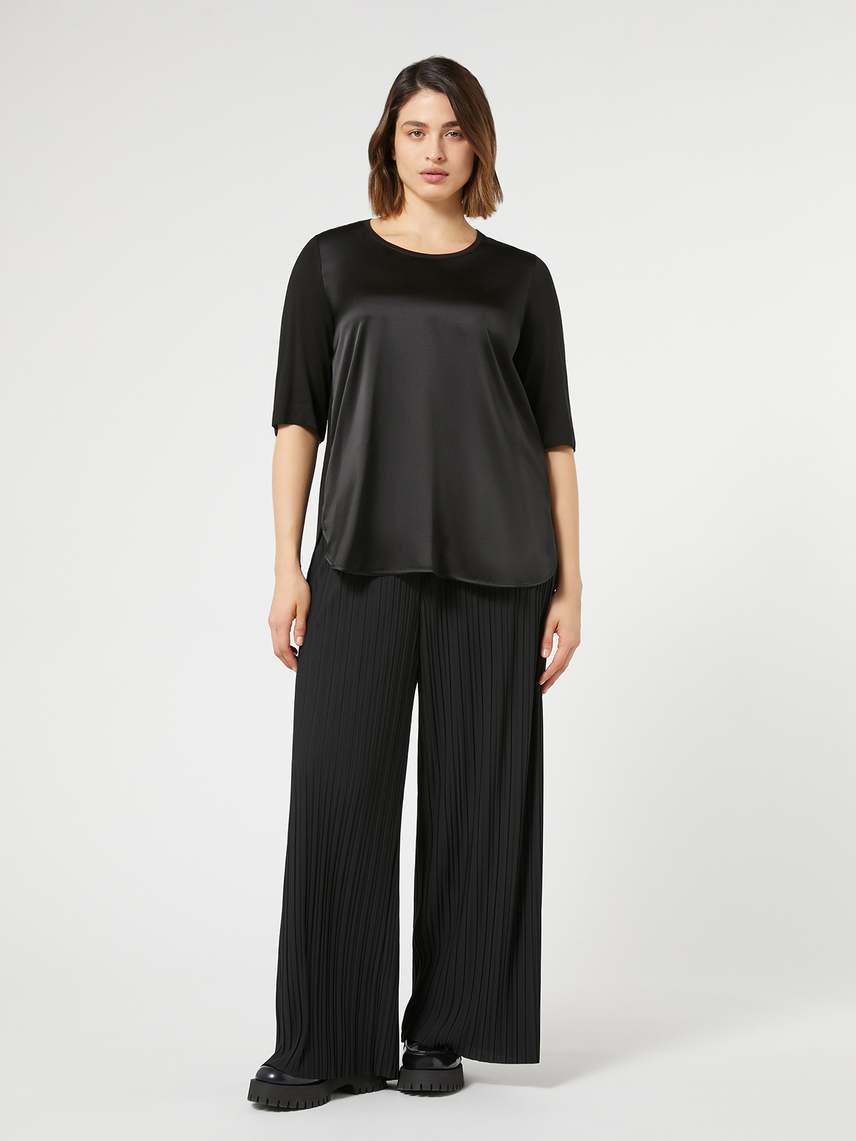 細かなプリーツを施した動きのある表情がエレガントに映えるサテンジャージーパンツ。