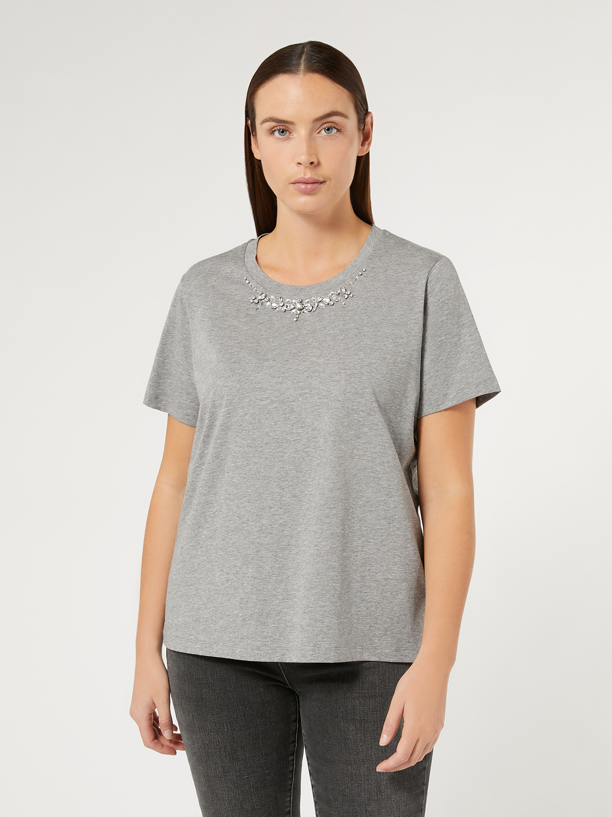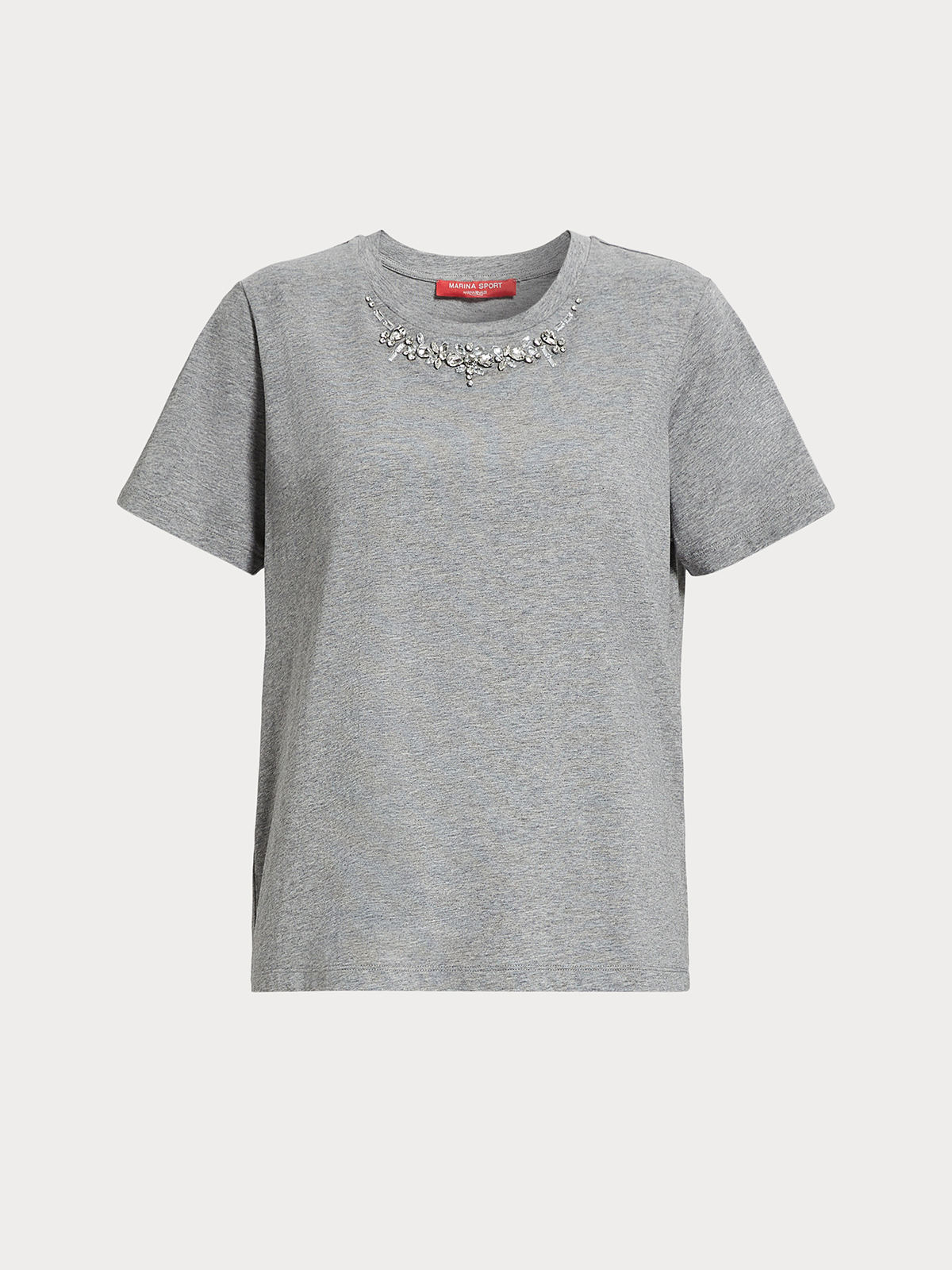 首元の華やかなビジューが上品なアクセントを添えるデザインカットソー。