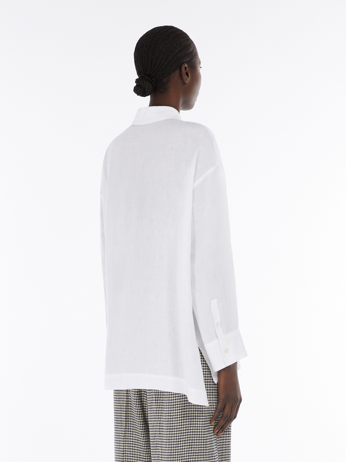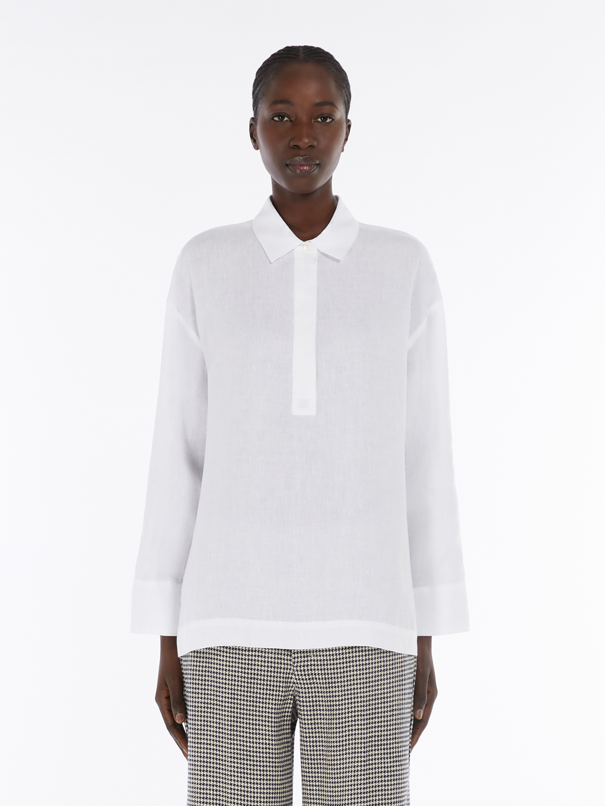 ポロシャツ風の襟が特徴的な長袖シャツ。 ウォッシュ加工を施したピュアリネンキャンバスを使用し、薄手で軽やかな着用感が魅力です。 シルエットはドロップショルダーのリラックスフィット。 裾はアシンメトリーで後ろがやや長くなっており、サイドにはスリットをあしらいました。 スカートからパンツまで幅広いアイテムと合わせて着こなしいただけます。 <ポケット>なし <スタイル>長袖