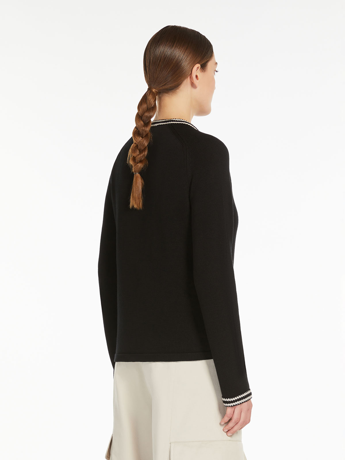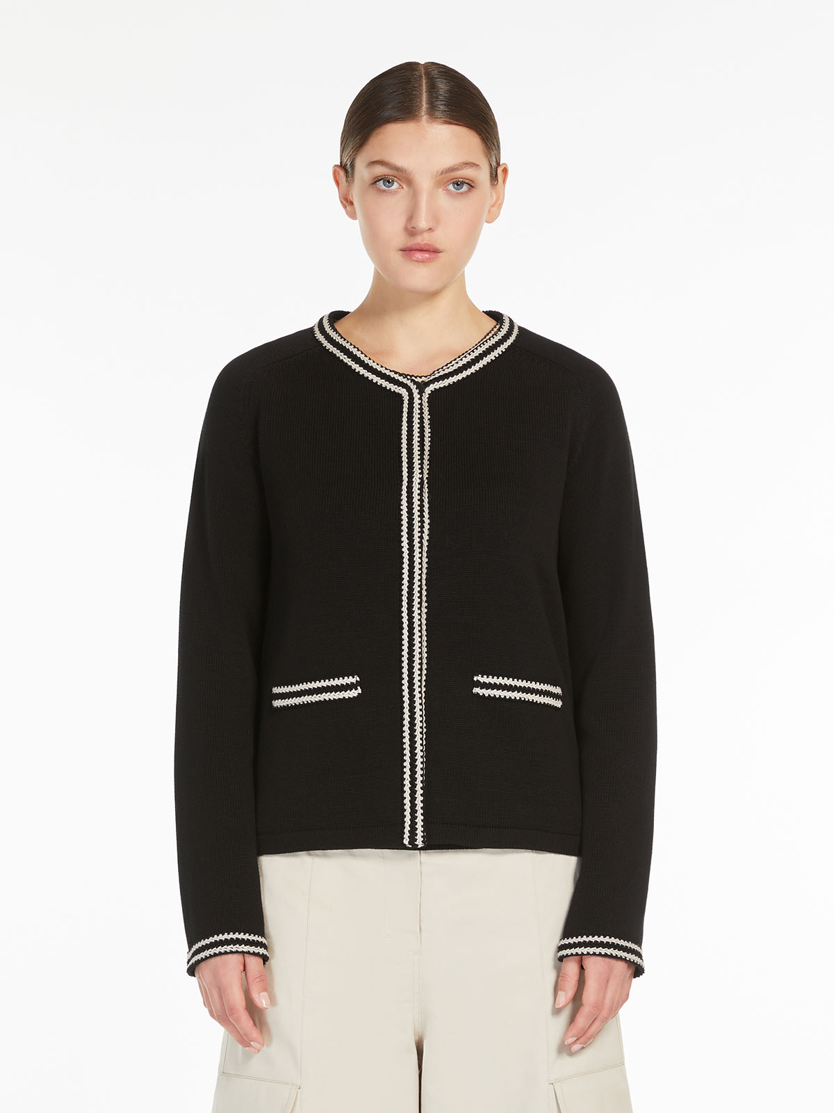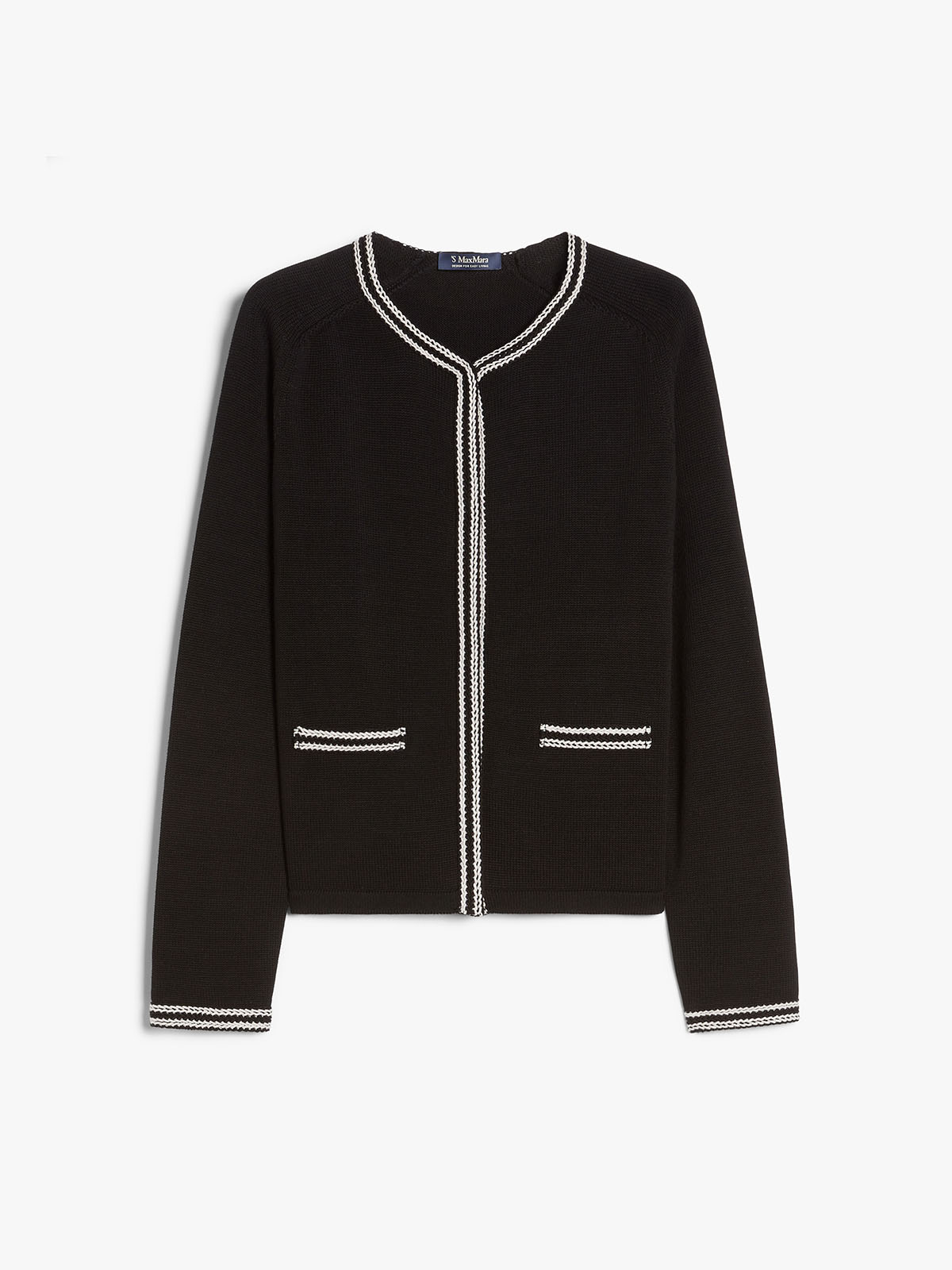 コントラストの効いたパスマントリーディテールが目を引くカーディガン。ピュアコットンヤーンを使用し、ソフトな肌触りでコンフォートな着用感が魅力です。シルエットはクルーネックに、ボクシーなストレートライン。様々なボトムスに合わせやすい着丈で、コーディネートの幅が広がります。<ポケット>なし<スタイル>スナップボタン留め