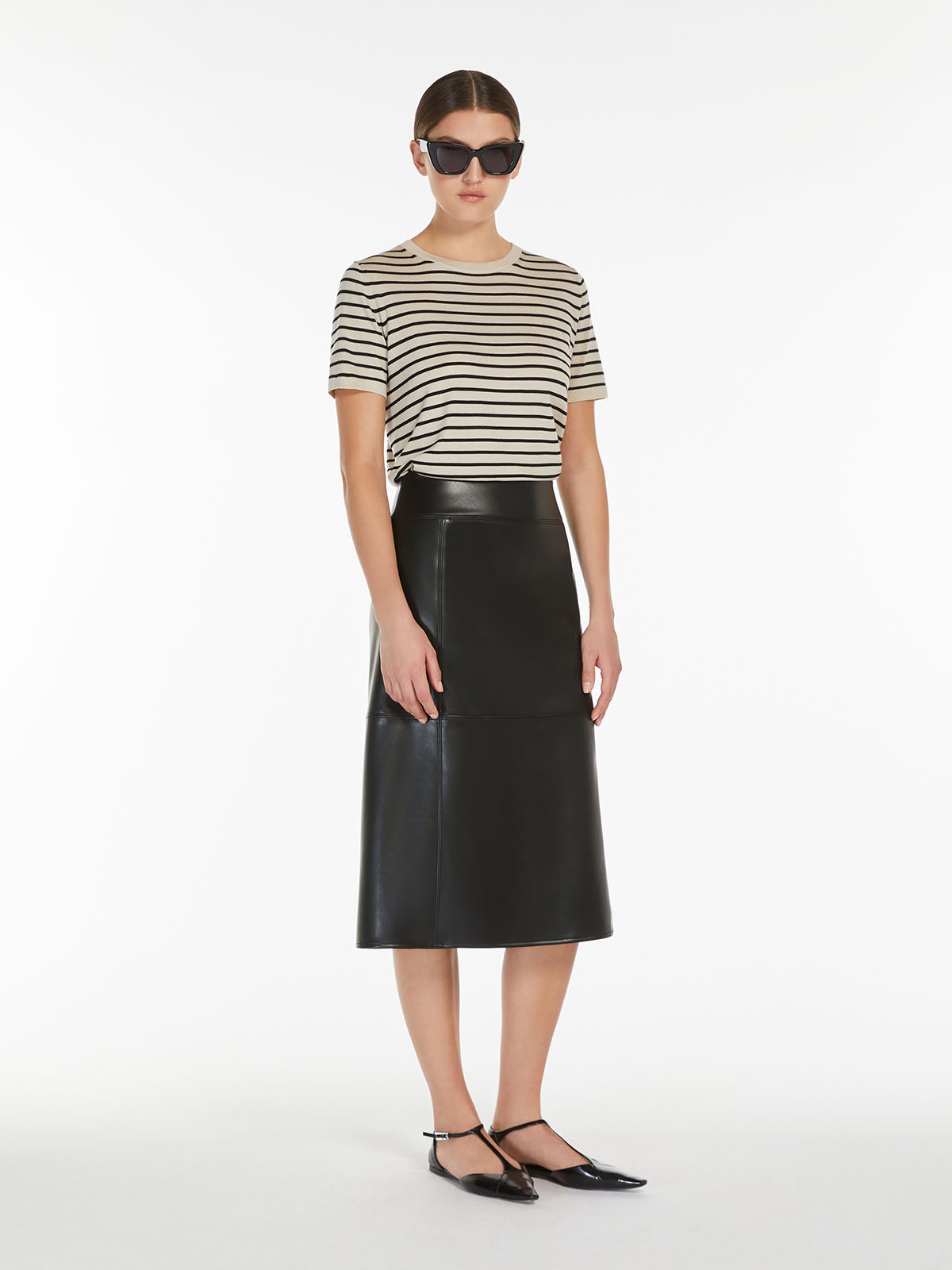 裾に向かってわずかに広がりを持たせたフレアライン。革製品特有の縫い目とステッチ使いが特徴です。