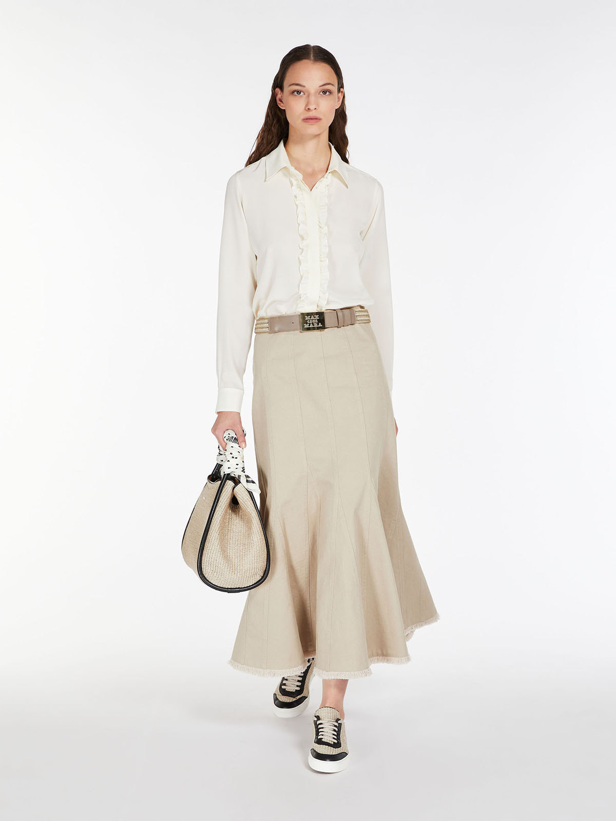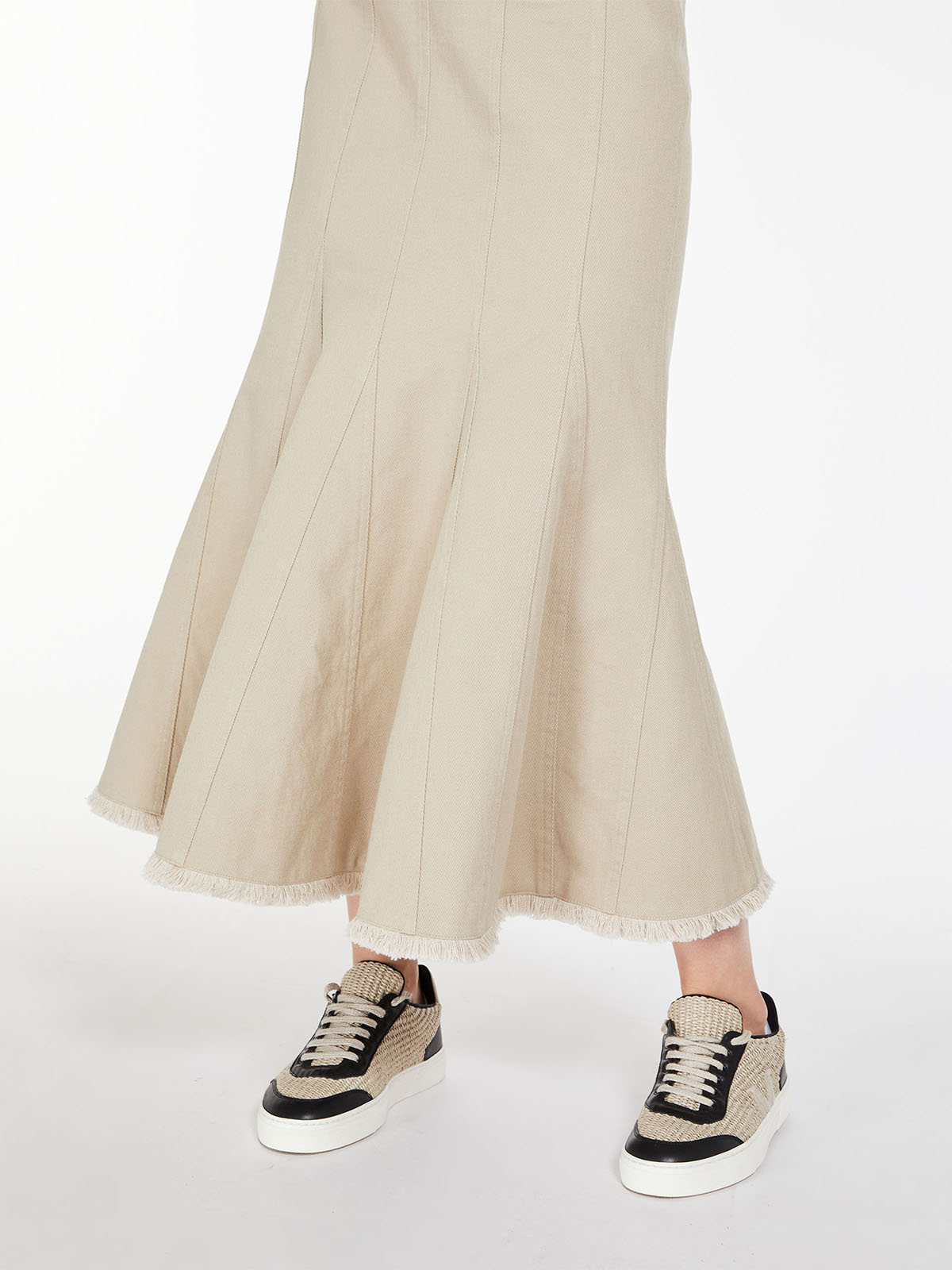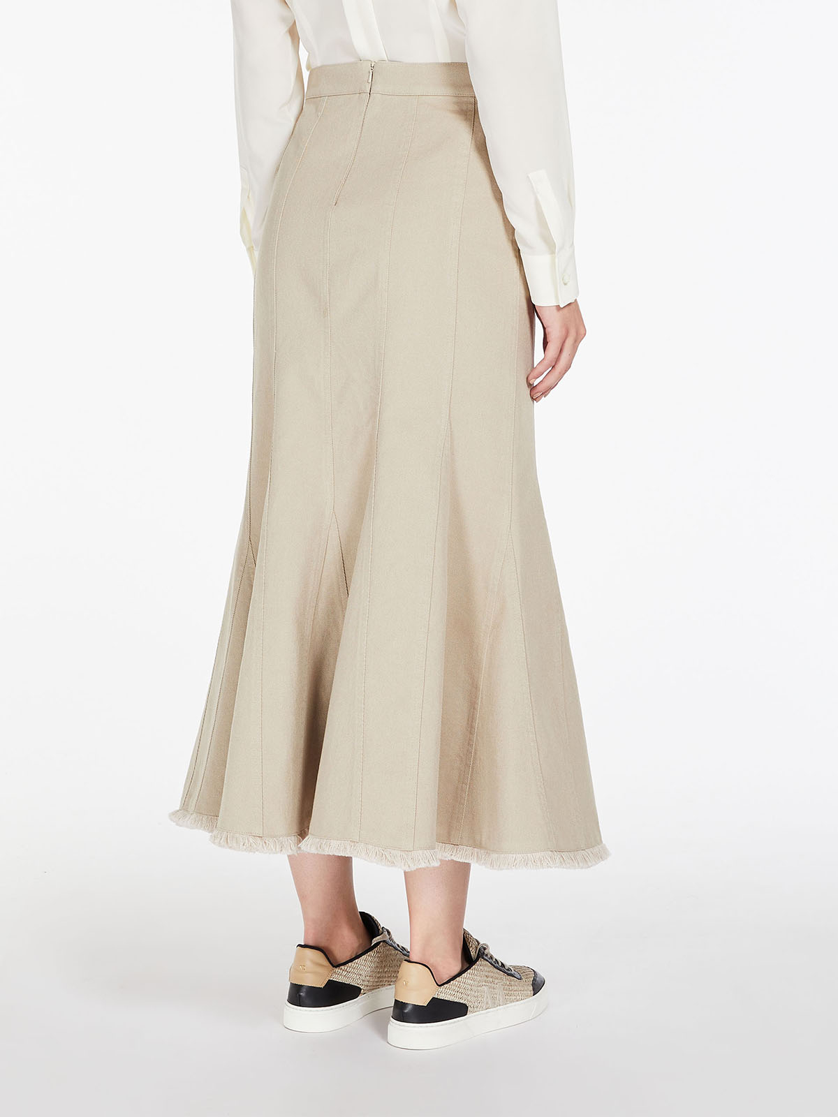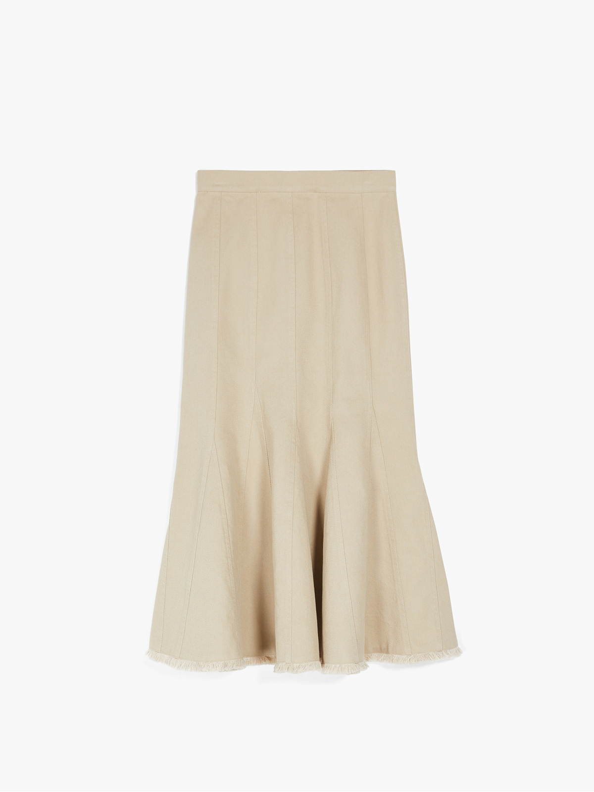 裾のフリンジディテールが夏らしいピュアコットンスカート。 デニム調のコットンドリル生地は、厚地ながら製品洗いを施しコンフォートな着心地に仕上がっています。 ボディラインに沿う計算されたカッティングで、裾のマーメイドラインがフェミニンな雰囲気に。裏地が無く、夏にも爽やかにお召しいただけるスカートです。 <ポケット>なし <スタイル>バックファスナー仕様
