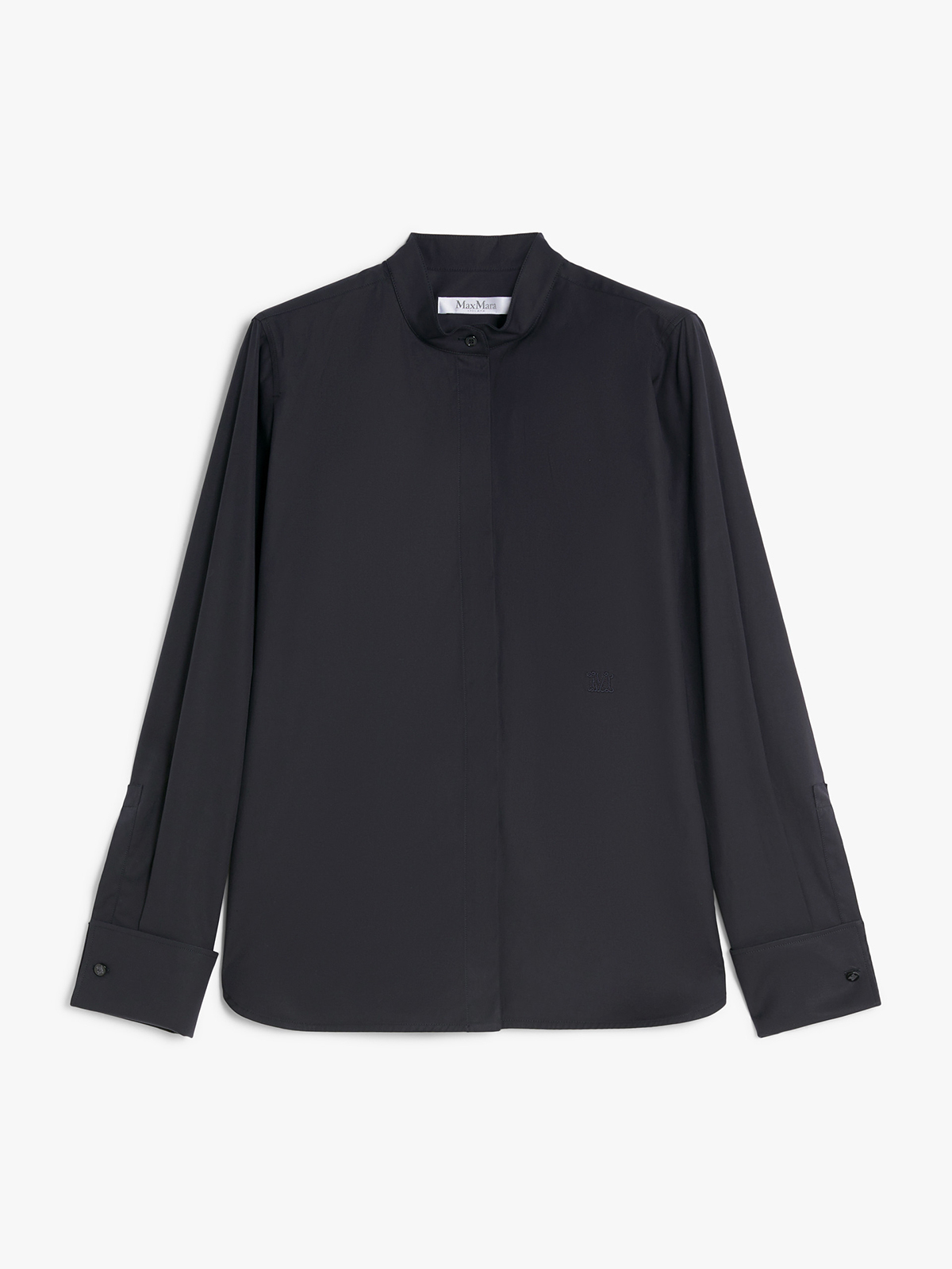 2025年春夏ミラノコレクションのランウェイモデル、マンダリンカラーシャツ。