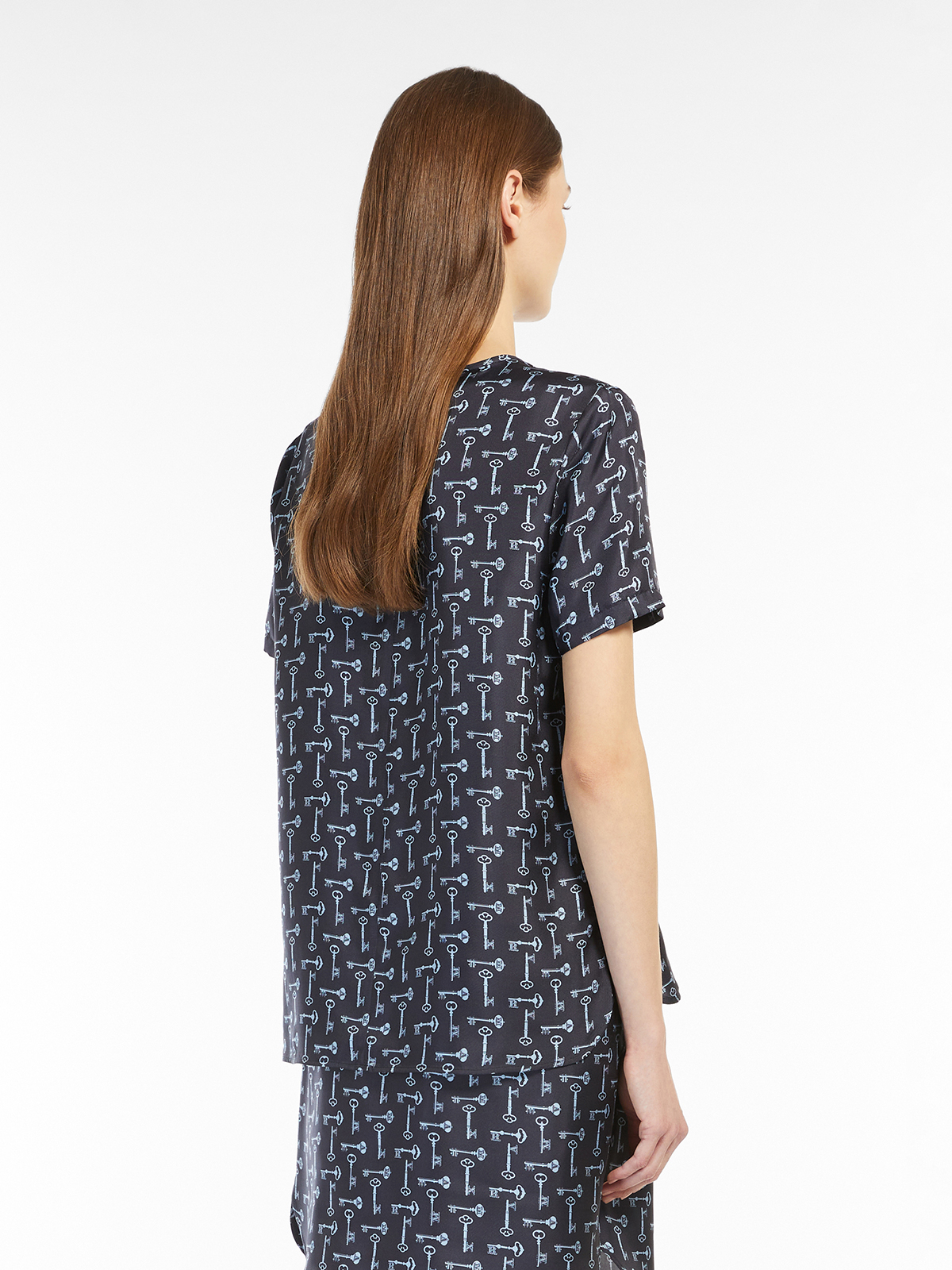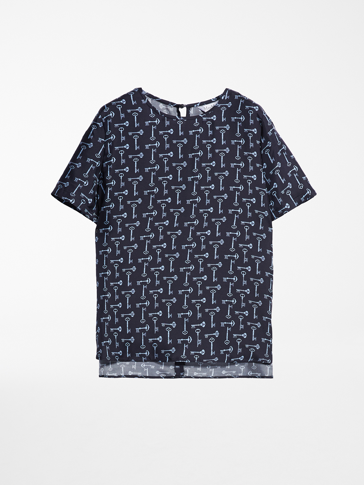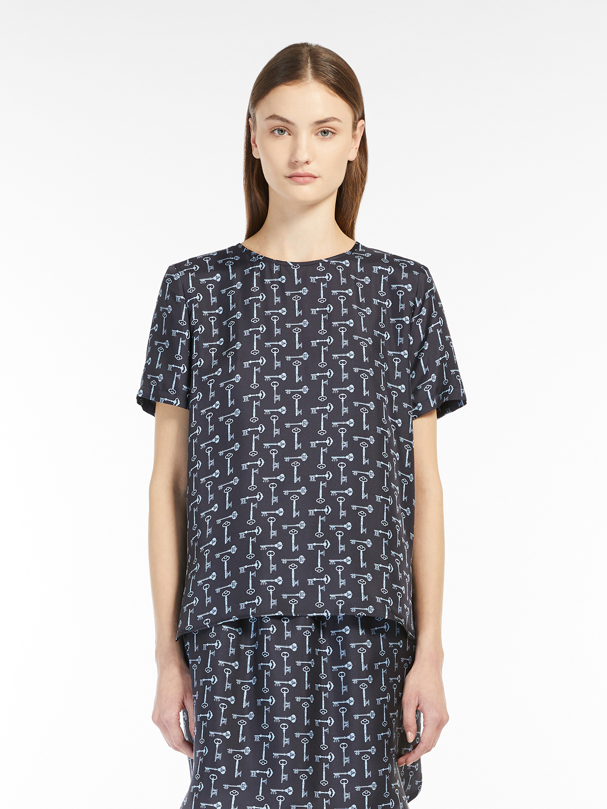 可愛らしいキーモチーフをグラフィックに配置したプリントのピュアシルクトップ。