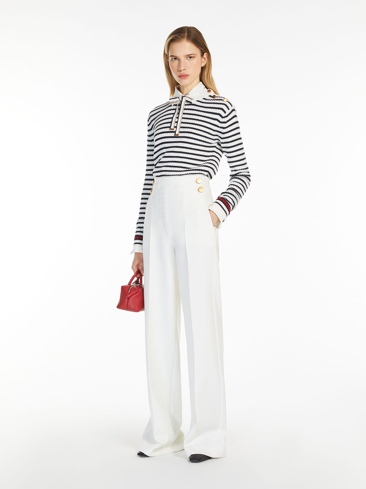 マリンスタイルにインスピレーションを得たセーラーデザインのパンツで、ネイビーやボーダーアイテムとのスタイリングがおすすめです。